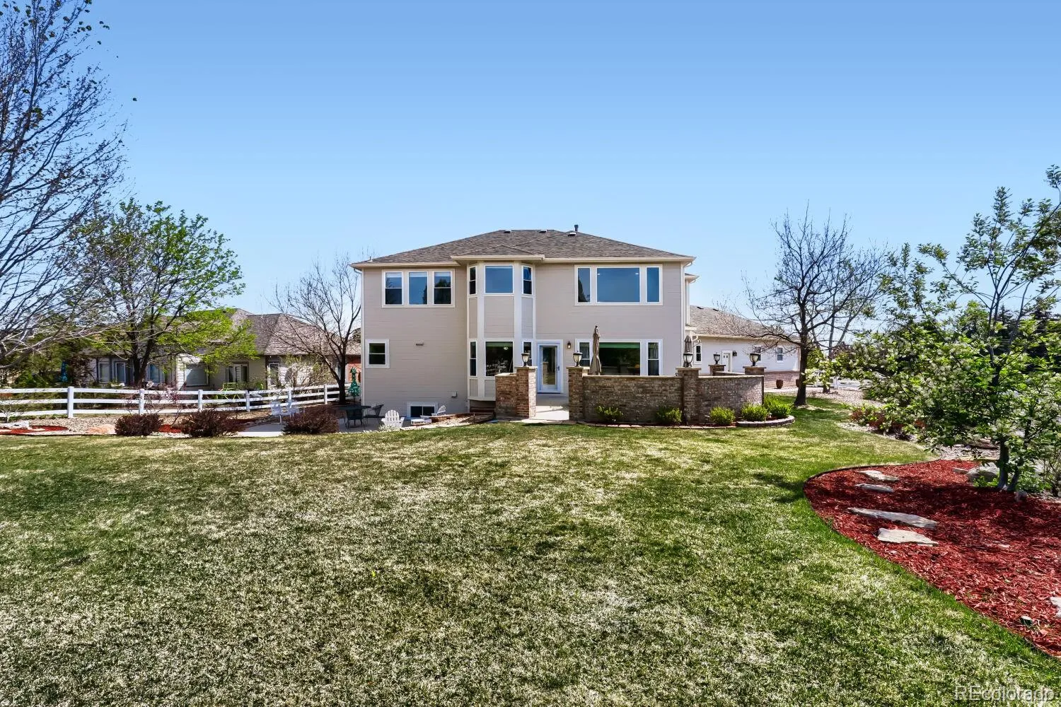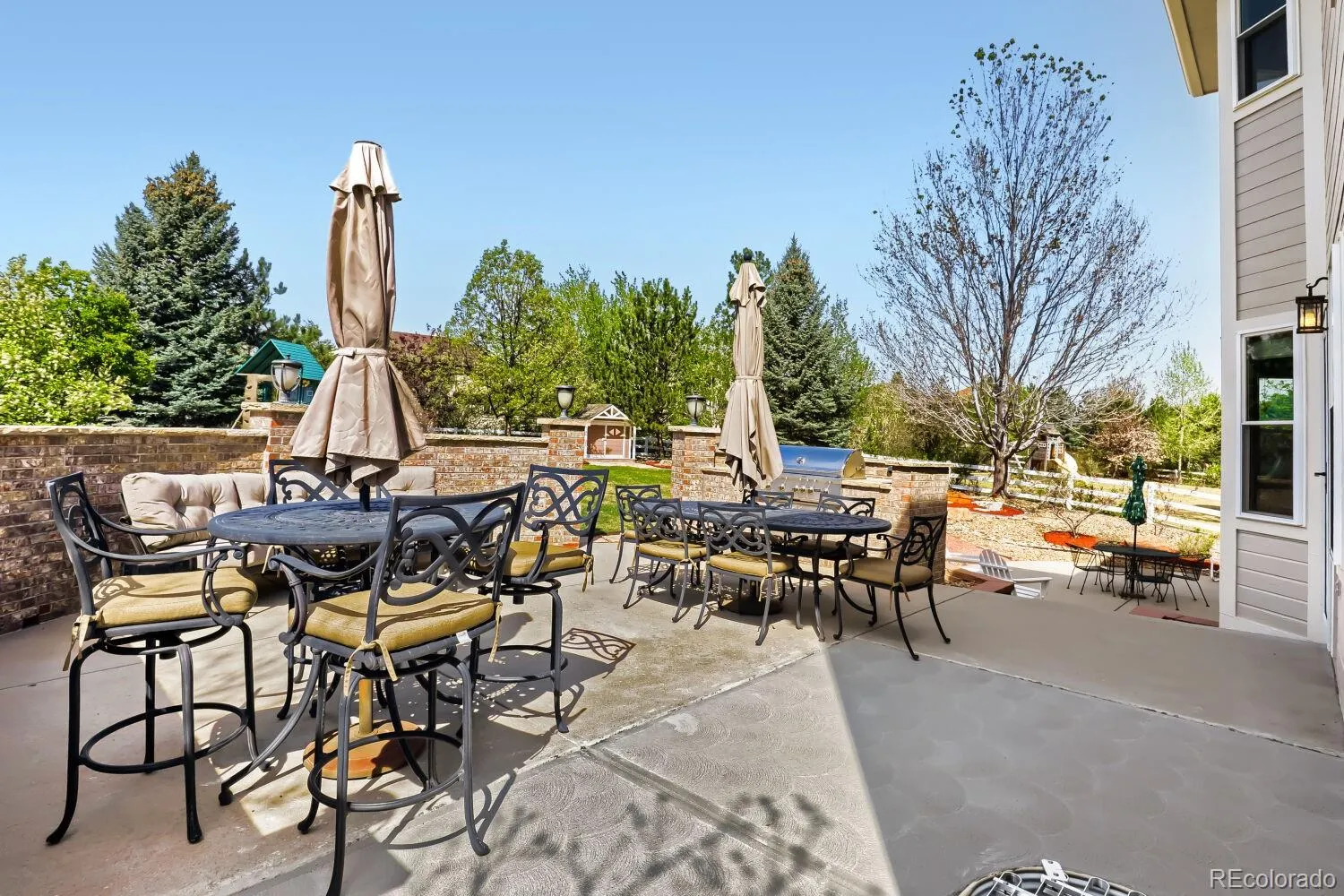 Colorado outdoor living at its best with 2 backyard patios, one with a new 2025 built-in BBQ grill. Beautifully landscaped and fenced half acre lot with sprinkler system front & back, garden shed. Trees are treated and maintained regularly. Yard fertilized 4/2026. Dryer is gas but there is a 220 plug for an electric one. Welcome home! Interior photos will be uploaded 4/21.