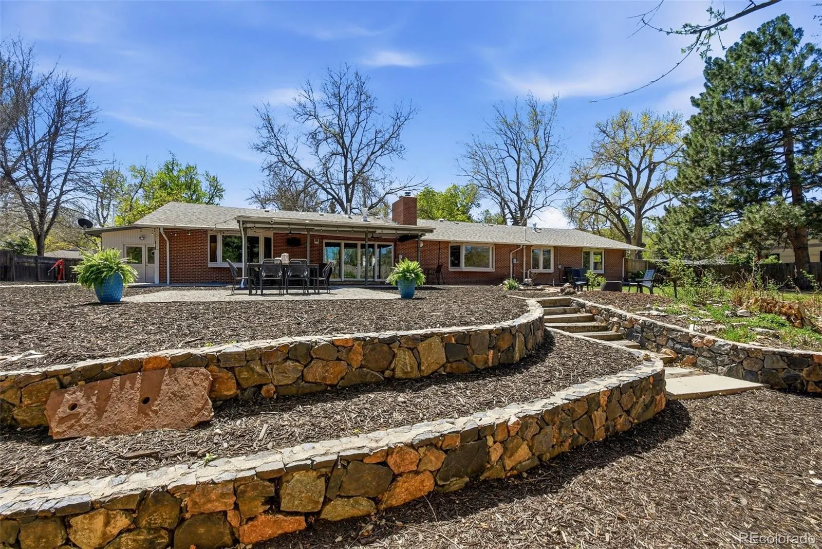 Out back, the property shines. Set on a 22,346 sq ft lot, the yard backs to the ditch and features a covered patio, multiple seating areas, terraced landscaping with stone retaining walls, and plenty of usable lawn space, along with raised garden beds ready for planting.