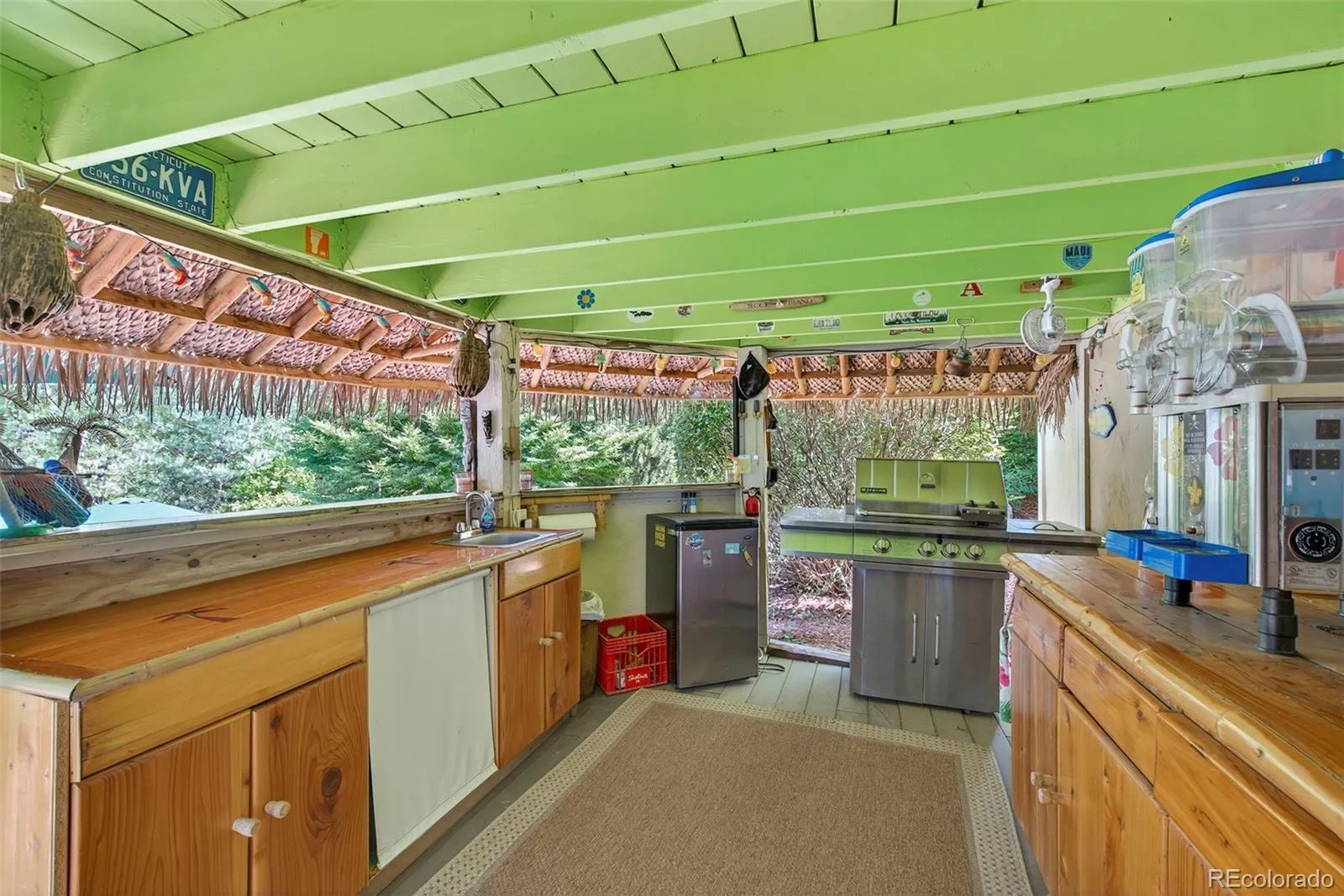 Outside, the property transforms into a private resort with a pool & built in hot tub, putting green, tiki bar, multiple patios, and expansive lawn space perfect for entertaining or relaxing in total privacy.
