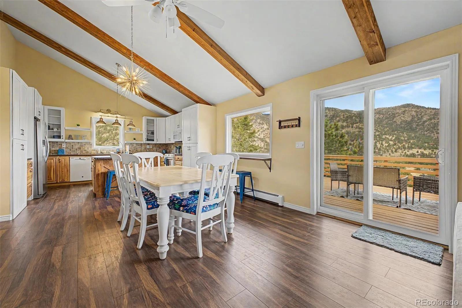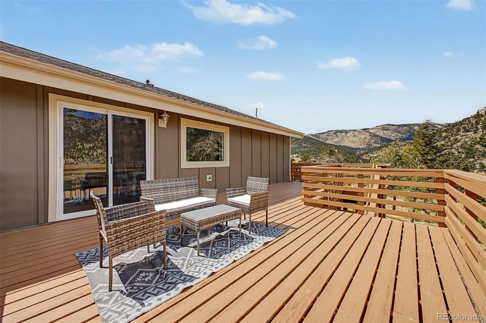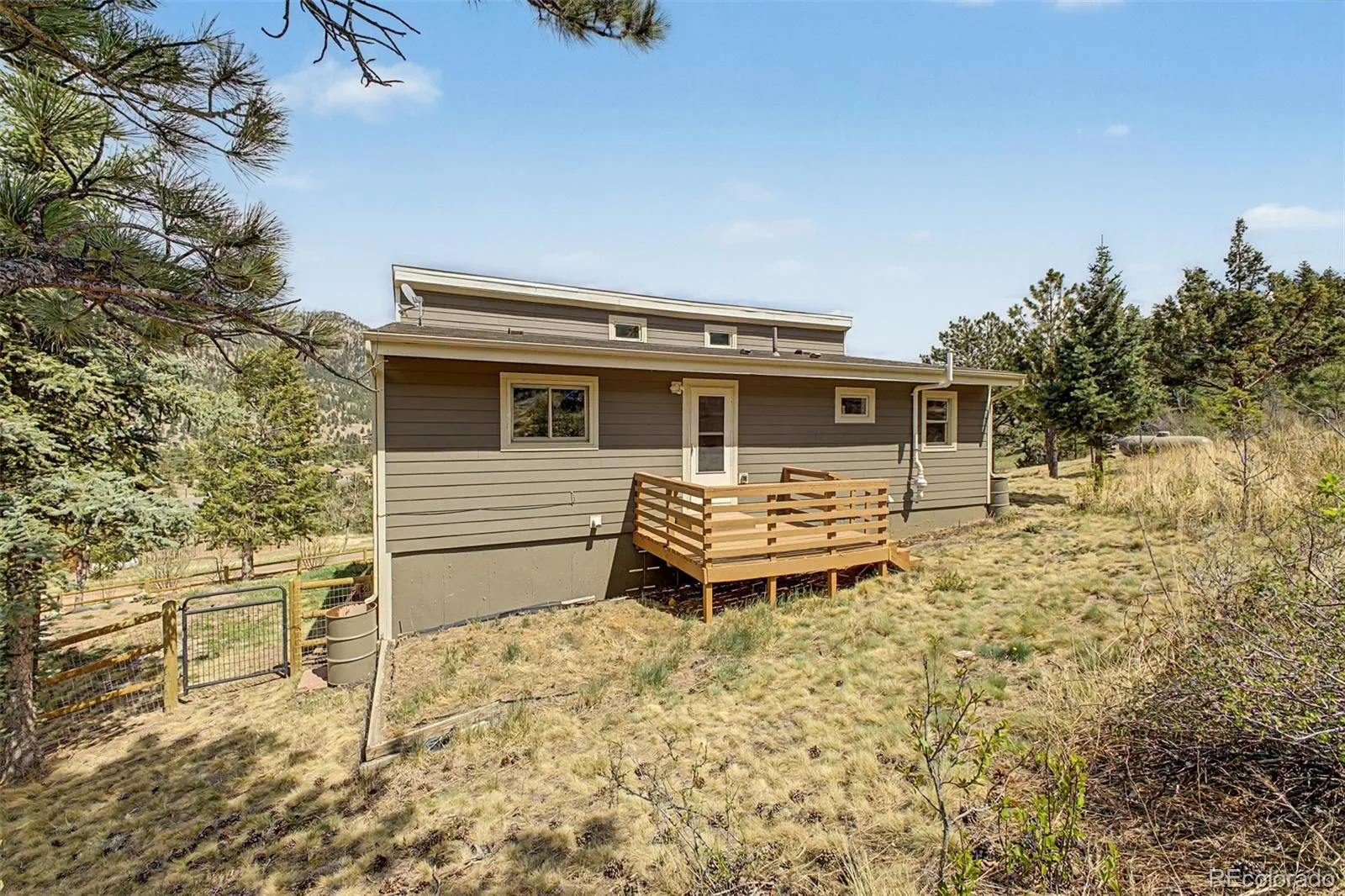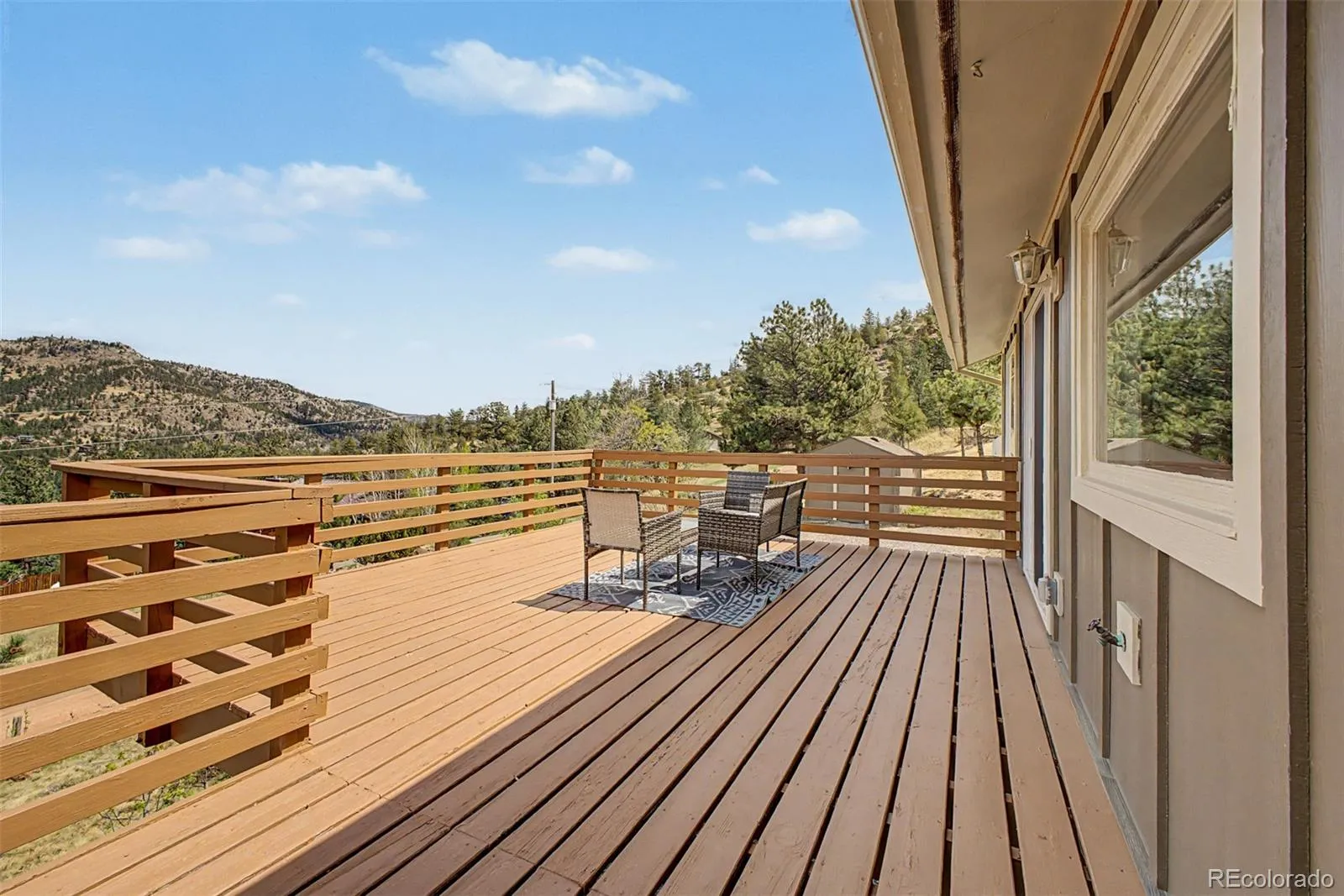 This beautifully updated Pinewood Springs mountain retreat nestled on a scenic hillside offers sweeping forest views, modern comforts, and a warm, inviting atmosphere throughout. The reimagined interior features a bright contemporary kitchen with an expansive island, high ceilings, and large windows that fill the home with natural light, while the open-concept living area showcases beamed vaulted ceilings, soothing tones, LVP flooring, and a cozy electric fireplace. The lower-level walkout lives like a first floor, providing a versatile living space with a comfortable family room, guest bedroom, open den ideal for an office or flex area, and direct access to the attached garage and a spacious laundry/utility room with abundant cabinetry. Outside, a large deck invites relaxation and entertaining amid breathtaking mountain scenery and a fenced in yard. Fire mitigation, a newer Class A fire-rated roof, and durable noncombustible James Hardie siding offer peace of mind, while an attached one-car garage and garden shed provide ample storage for mountain gear. With a voluntary HOA, residents enjoy unique community benefits including a rural water system, year-round road maintenance through county tax districts, and access to a private swimming hole on the Little Thompson River. Surrounded by Roosevelt National Forest, the neighborhood offers many opportunities for hiking, mountain biking, and wildlife viewing, all while being conveniently located just 10 minutes from downtown Lyons, 20 minutes from Estes Park, and 30 minutes from Boulder and Longmont—an ideal blend of seclusion, natural beauty, and accessibility.