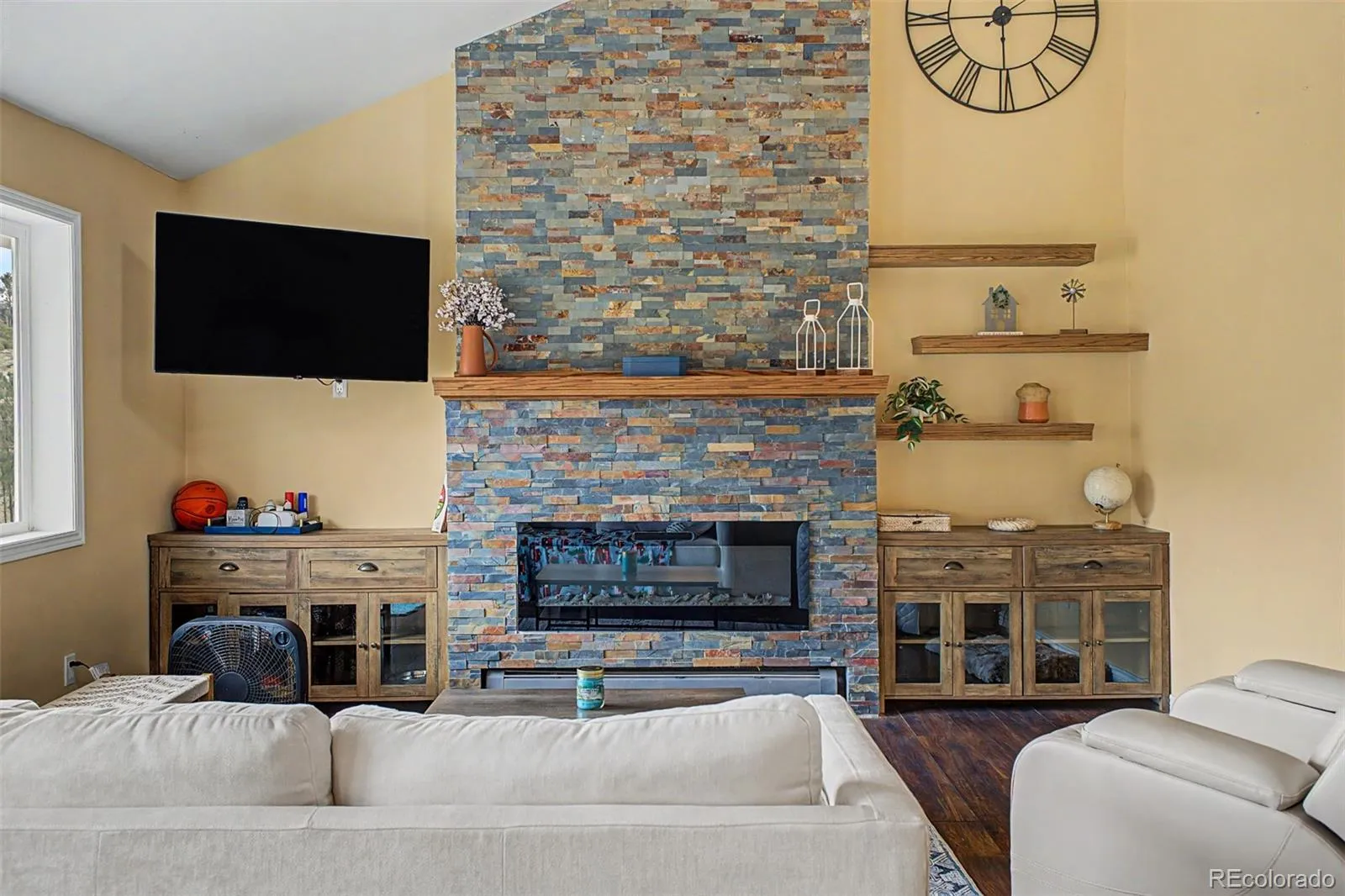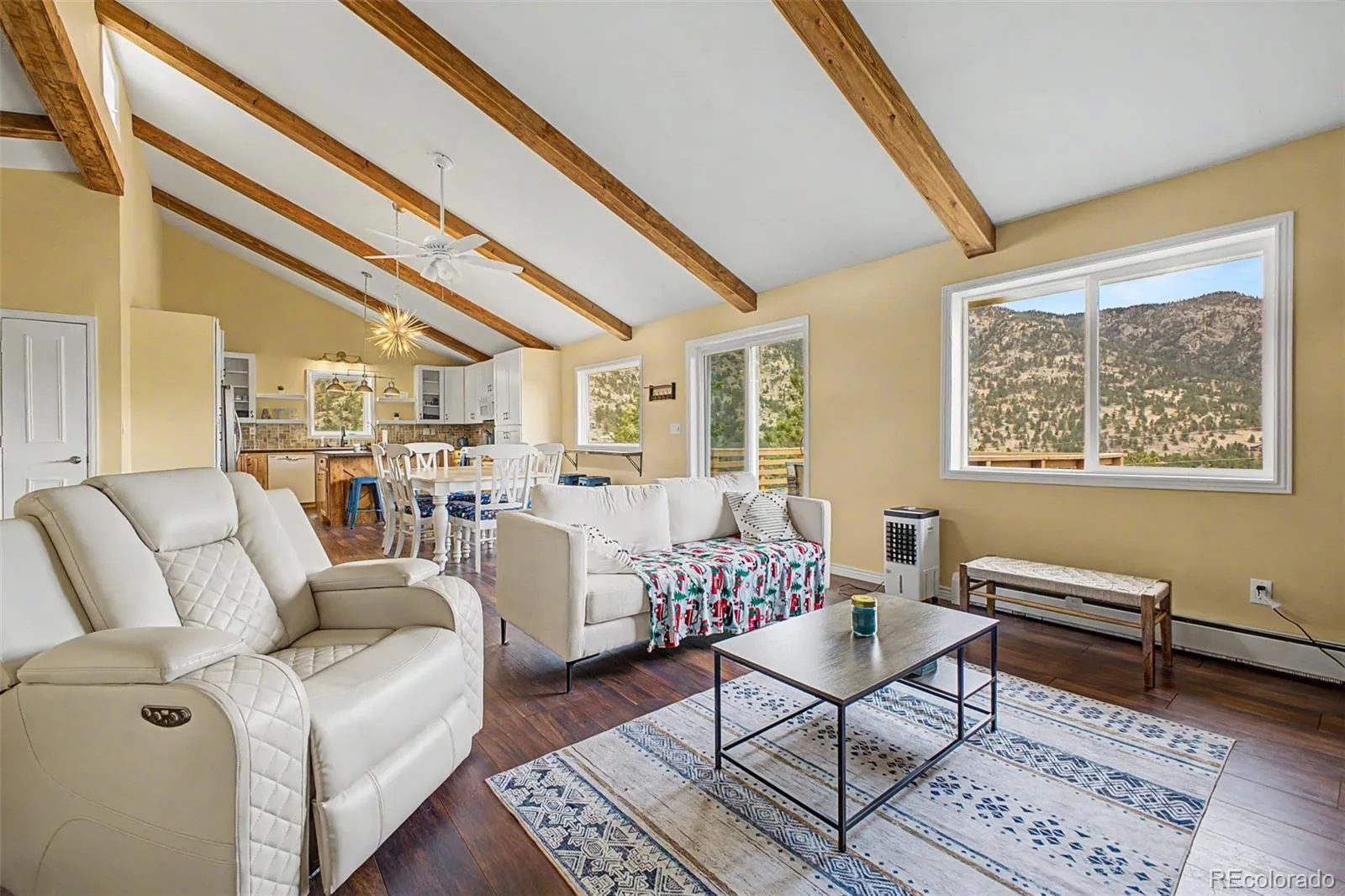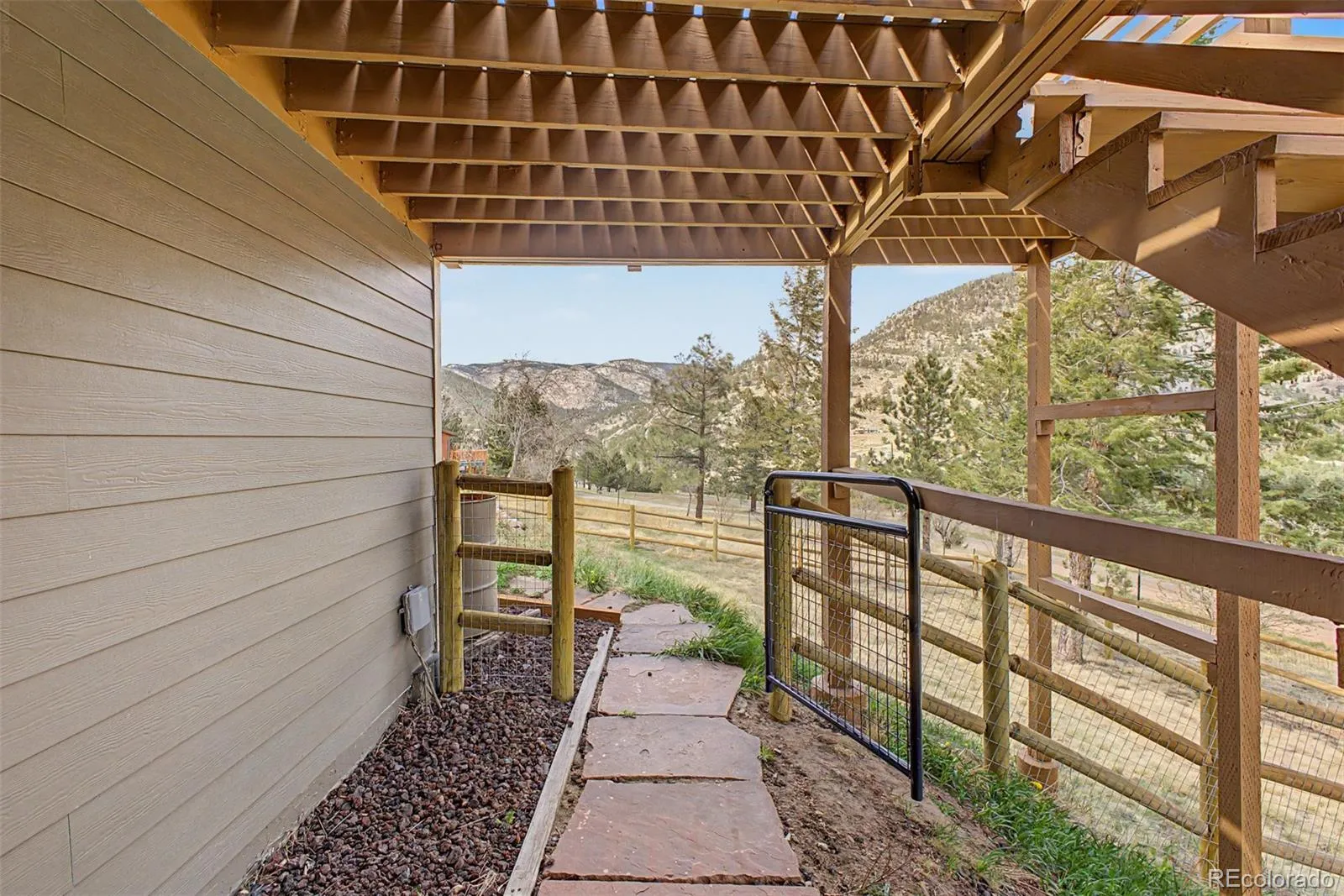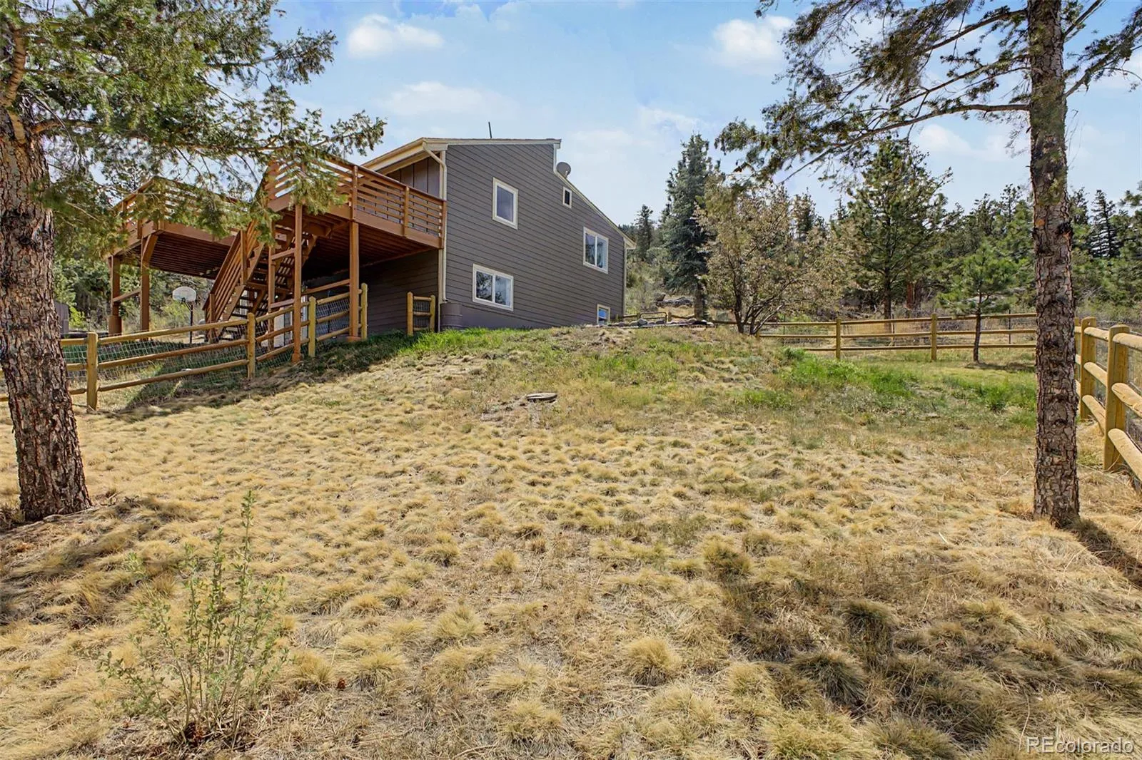 This beautifully updated Pinewood Springs mountain retreat nestled on a scenic hillside offers sweeping forest views, modern comforts, and a warm, inviting atmosphere throughout. The reimagined interior features a bright contemporary kitchen with an expansive island, high ceilings, and large windows that fill the home with natural light, while the open-concept living area showcases beamed vaulted ceilings, soothing tones, LVP flooring, and a cozy electric fireplace. The lower-level walkout lives like a first floor, providing a versatile living space with a comfortable family room, guest bedroom, open den ideal for an office or flex area, and direct access to the attached garage and a spacious laundry/utility room with abundant cabinetry. Outside, a large deck invites relaxation and entertaining amid breathtaking mountain scenery and a fenced in yard. Fire mitigation, a newer Class A fire-rated roof, and durable noncombustible James Hardie siding offer peace of mind, while an attached one-car garage and garden shed provide ample storage for mountain gear. With a voluntary HOA, residents enjoy unique community benefits including a rural water system, year-round road maintenance through county tax districts, and access to a private swimming hole on the Little Thompson River. Surrounded by Roosevelt National Forest, the neighborhood offers many opportunities for hiking, mountain biking, and wildlife viewing, all while being conveniently located just 10 minutes from downtown Lyons, 20 minutes from Estes Park, and 30 minutes from Boulder and Longmont—an ideal blend of seclusion, natural beauty, and accessibility.