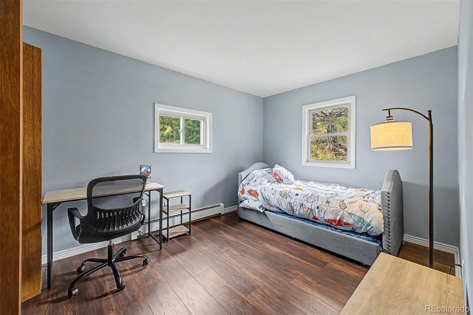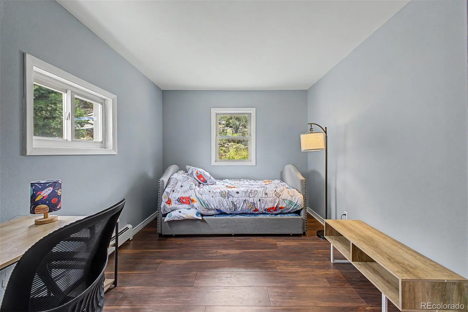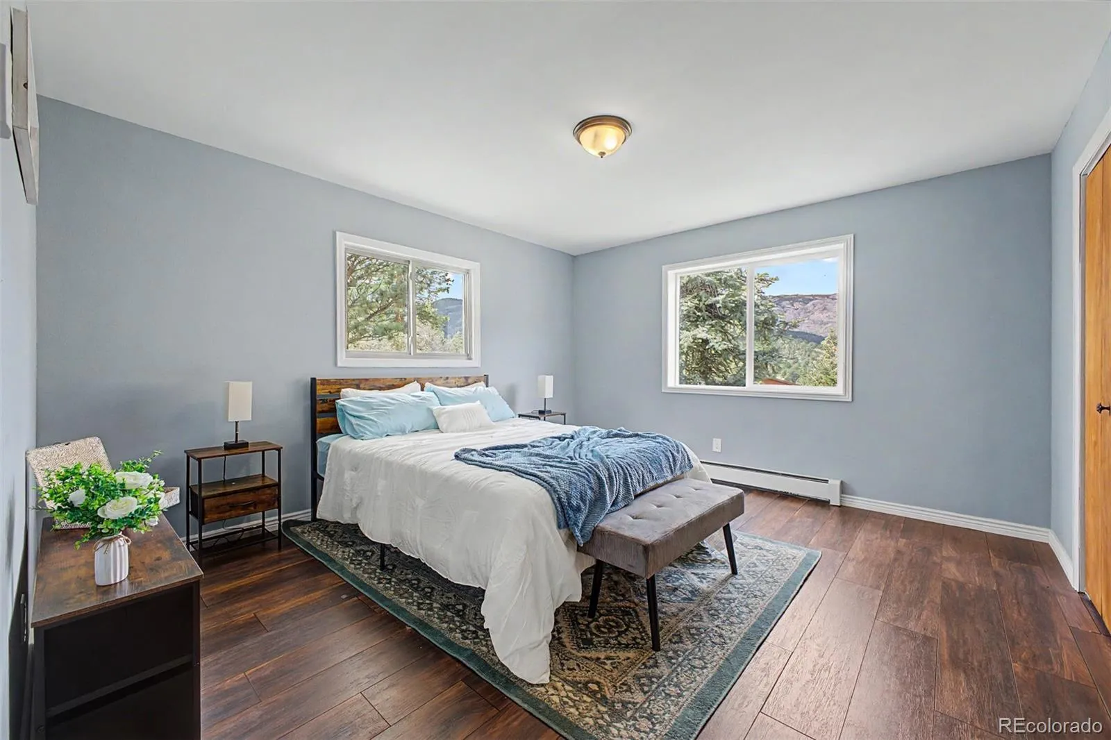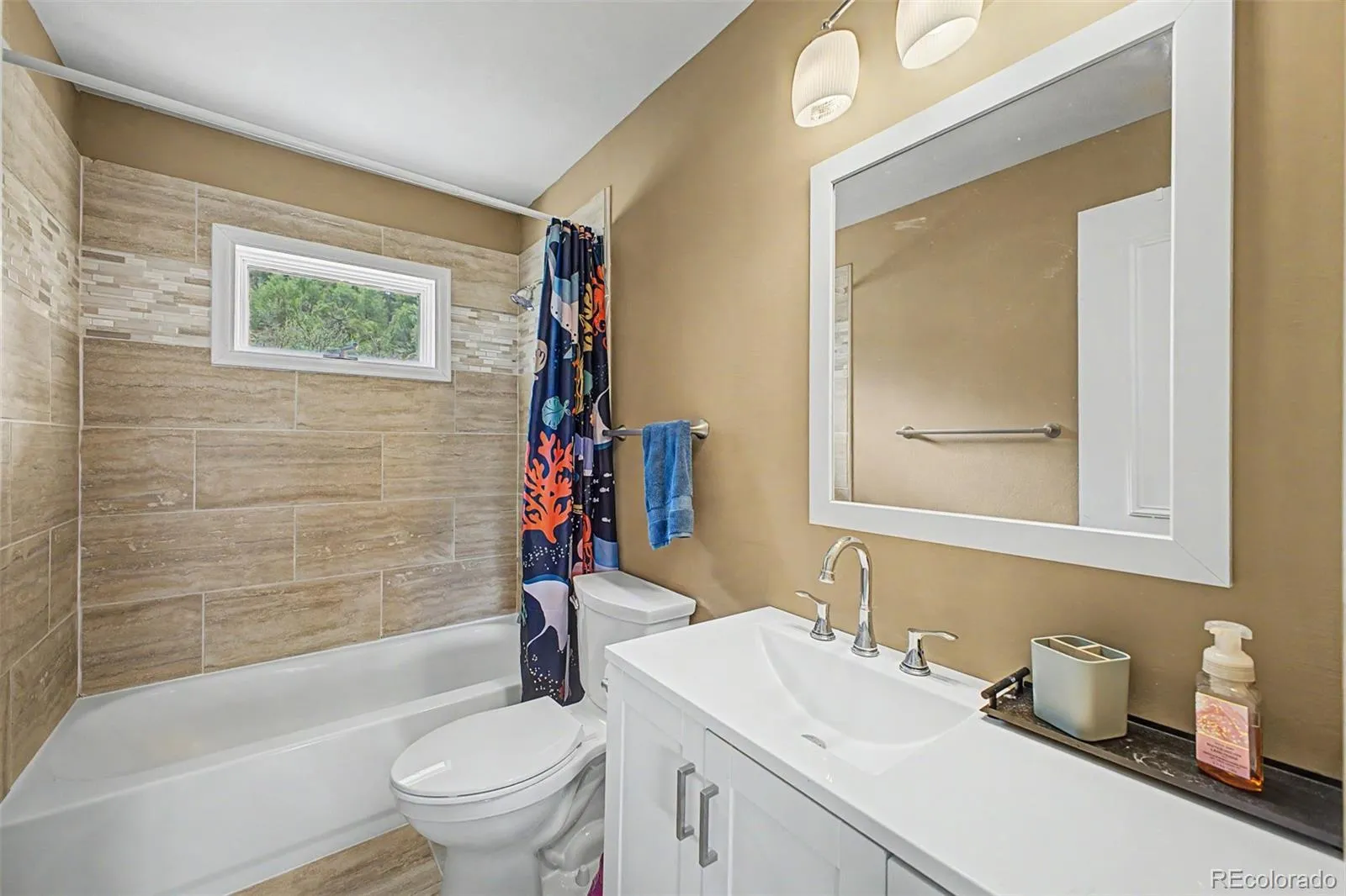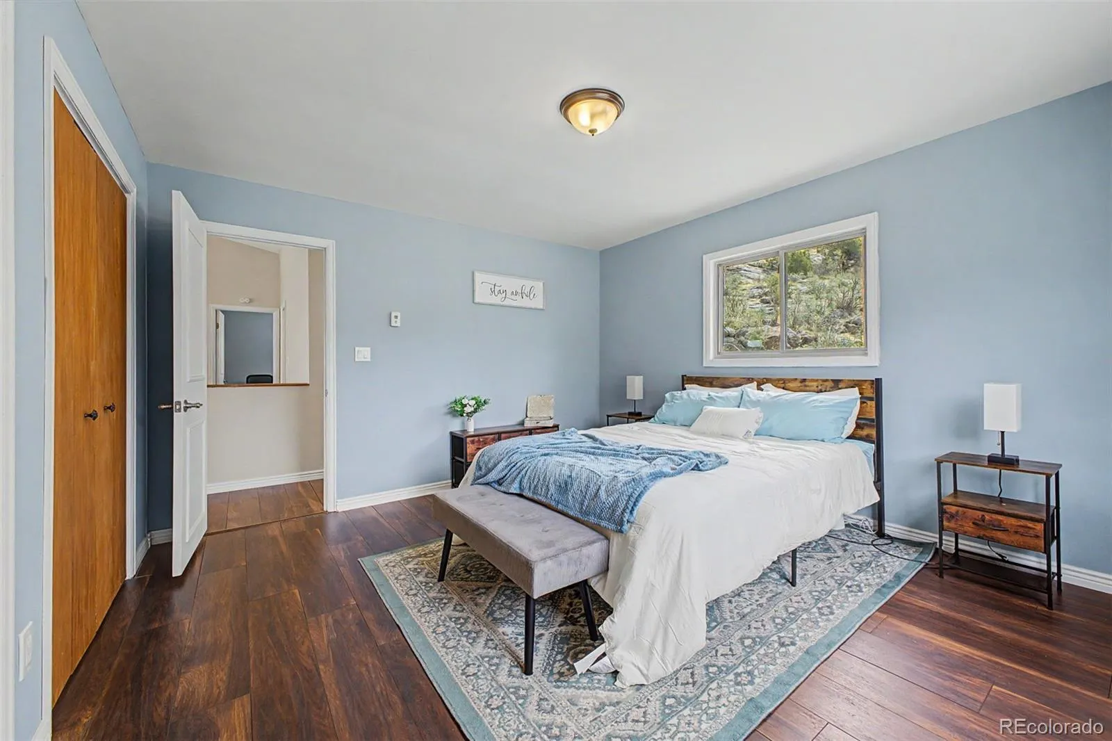 This beautifully updated Pinewood Springs mountain retreat nestled on a scenic hillside offers sweeping forest views, modern comforts, and a warm, inviting atmosphere throughout. The reimagined interior features a bright contemporary kitchen with an expansive island, high ceilings, and large windows that fill the home with natural light, while the open-concept living area showcases beamed vaulted ceilings, soothing tones, LVP flooring, and a cozy electric fireplace. The lower-level walkout lives like a first floor, providing a versatile living space with a comfortable family room, guest bedroom, open den ideal for an office or flex area, and direct access to the attached garage and a spacious laundry/utility room with abundant cabinetry. Outside, a large deck invites relaxation and entertaining amid breathtaking mountain scenery and a fenced in yard. Fire mitigation, a newer Class A fire-rated roof, and durable noncombustible James Hardie siding offer peace of mind, while an attached one-car garage and garden shed provide ample storage for mountain gear. With a voluntary HOA, residents enjoy unique community benefits including a rural water system, year-round road maintenance through county tax districts, and access to a private swimming hole on the Little Thompson River. Surrounded by Roosevelt National Forest, the neighborhood offers many opportunities for hiking, mountain biking, and wildlife viewing, all while being conveniently located just 10 minutes from downtown Lyons, 20 minutes from Estes Park, and 30 minutes from Boulder and Longmont—an ideal blend of seclusion, natural beauty, and accessibility.