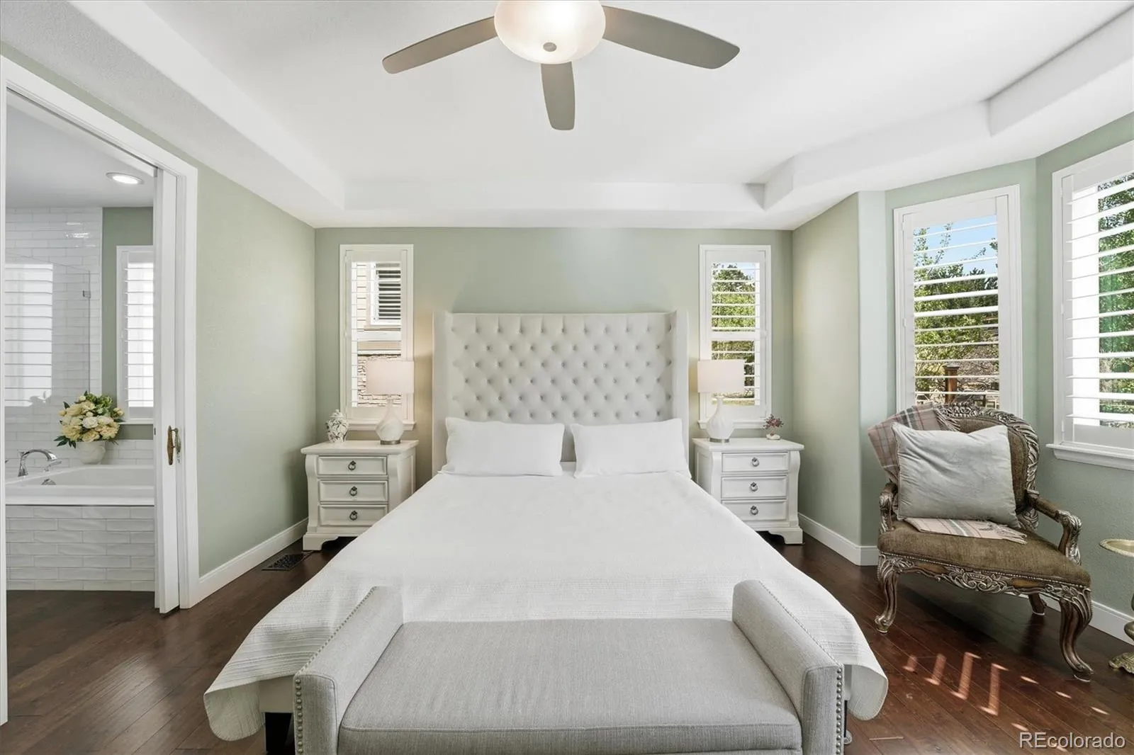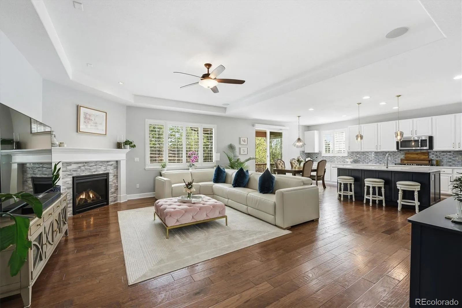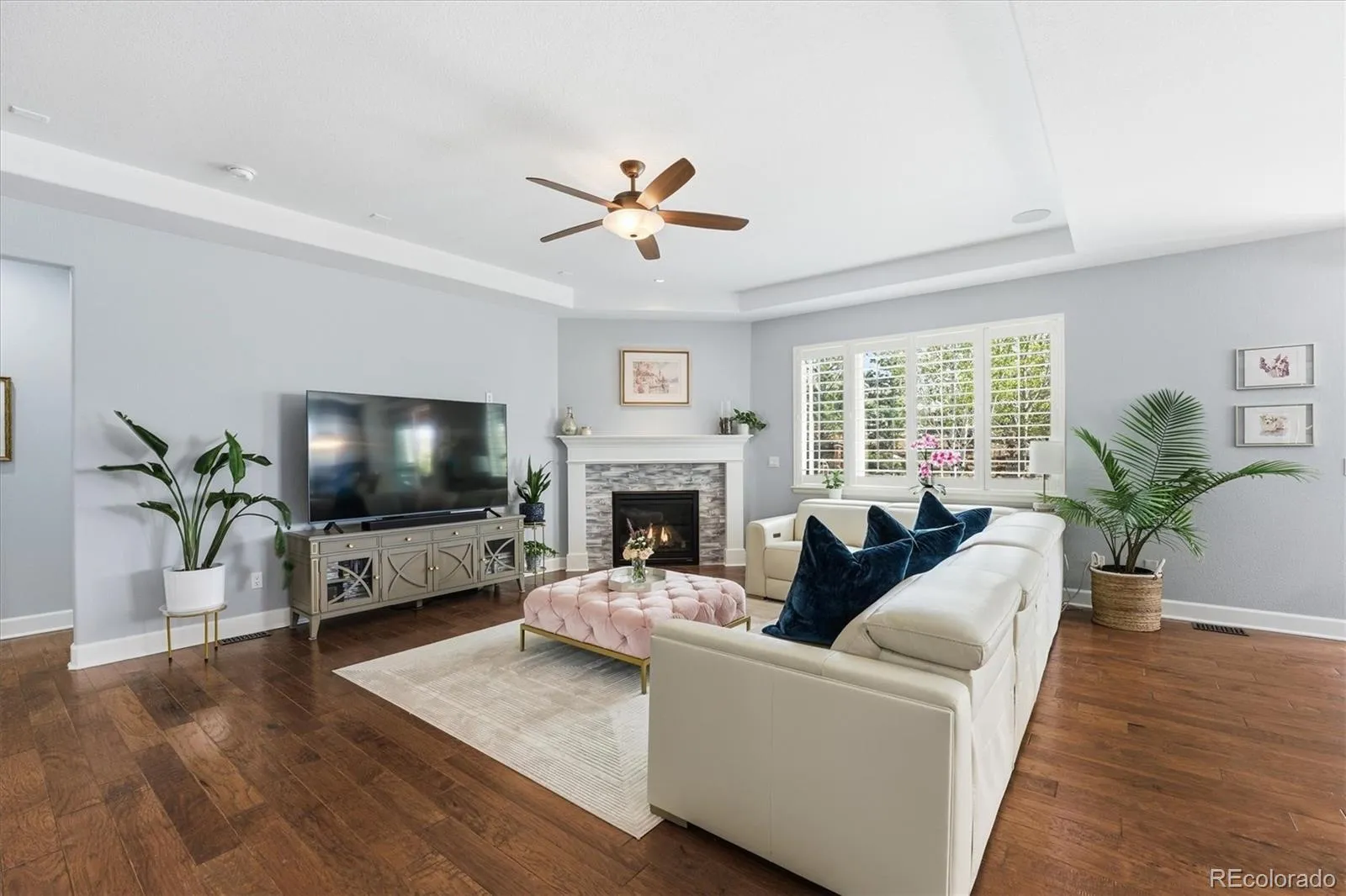 room offers a tray ceiling, tile fireplace, and abundant natural light. The primary suite features