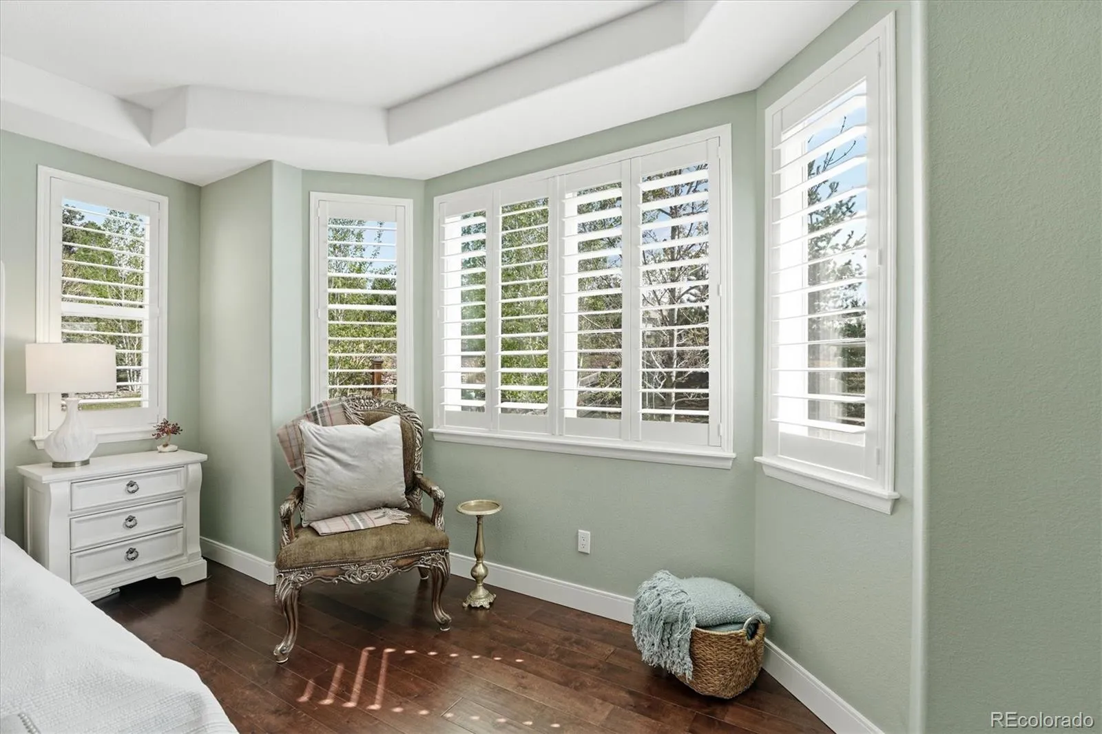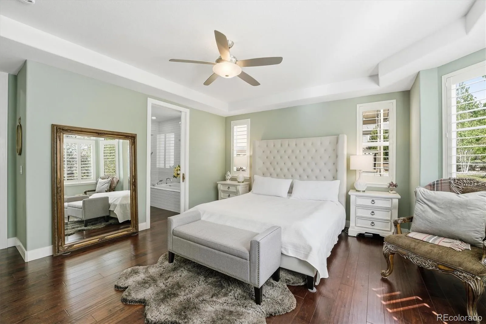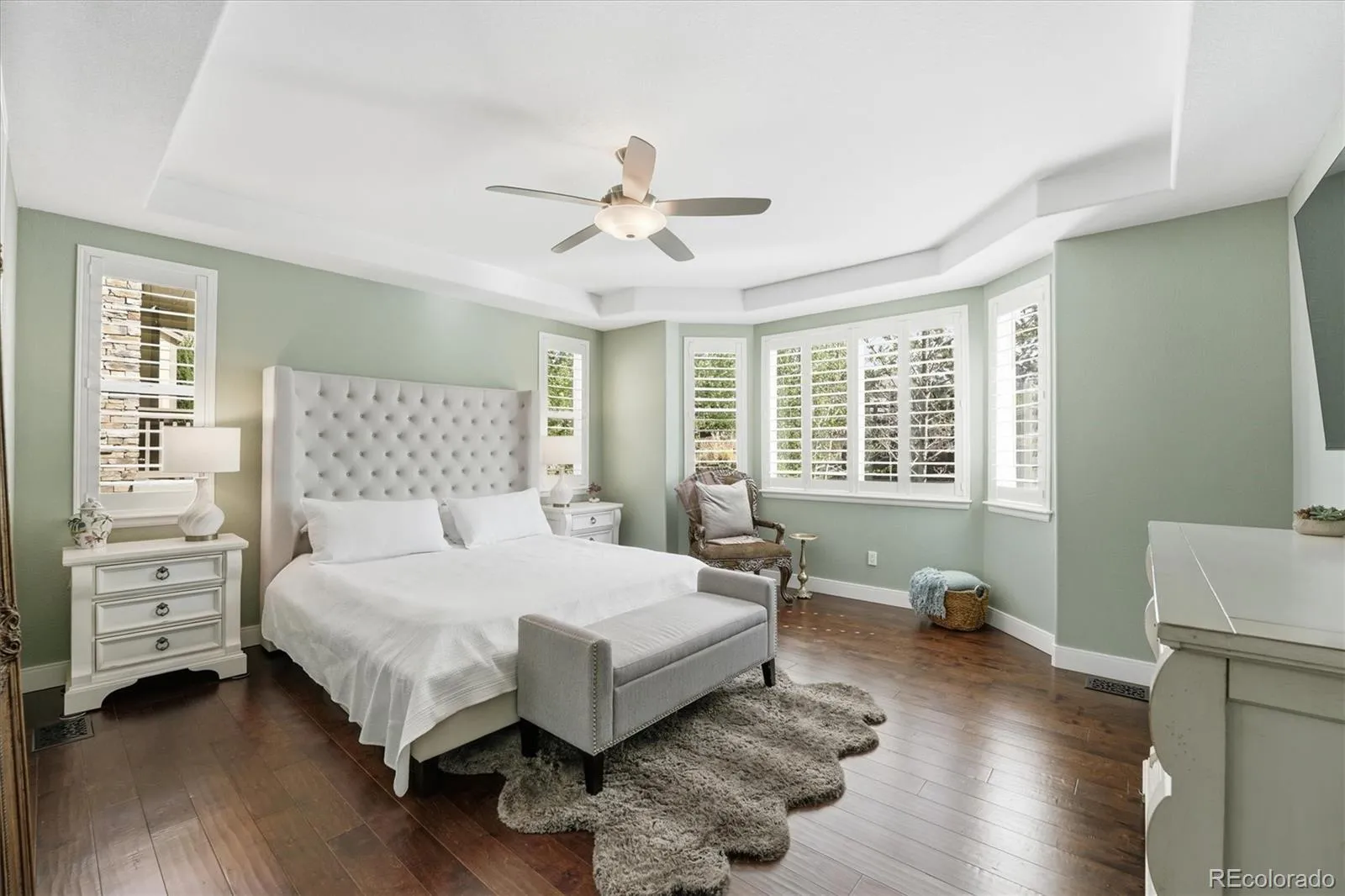 room offers a tray ceiling, tile fireplace, and abundant natural light. The primary suite features