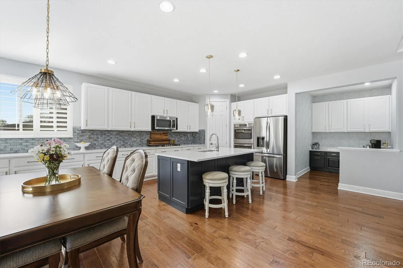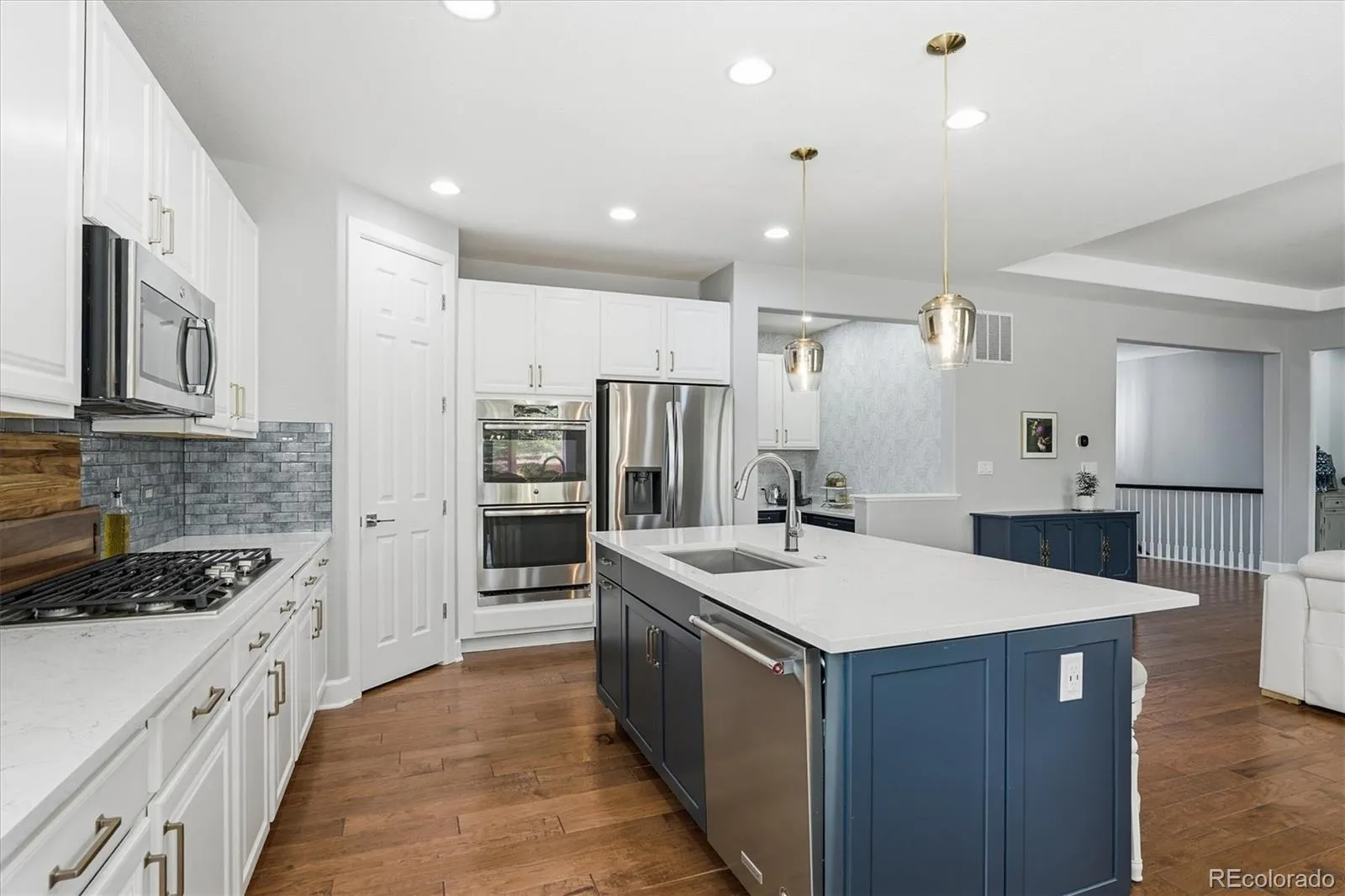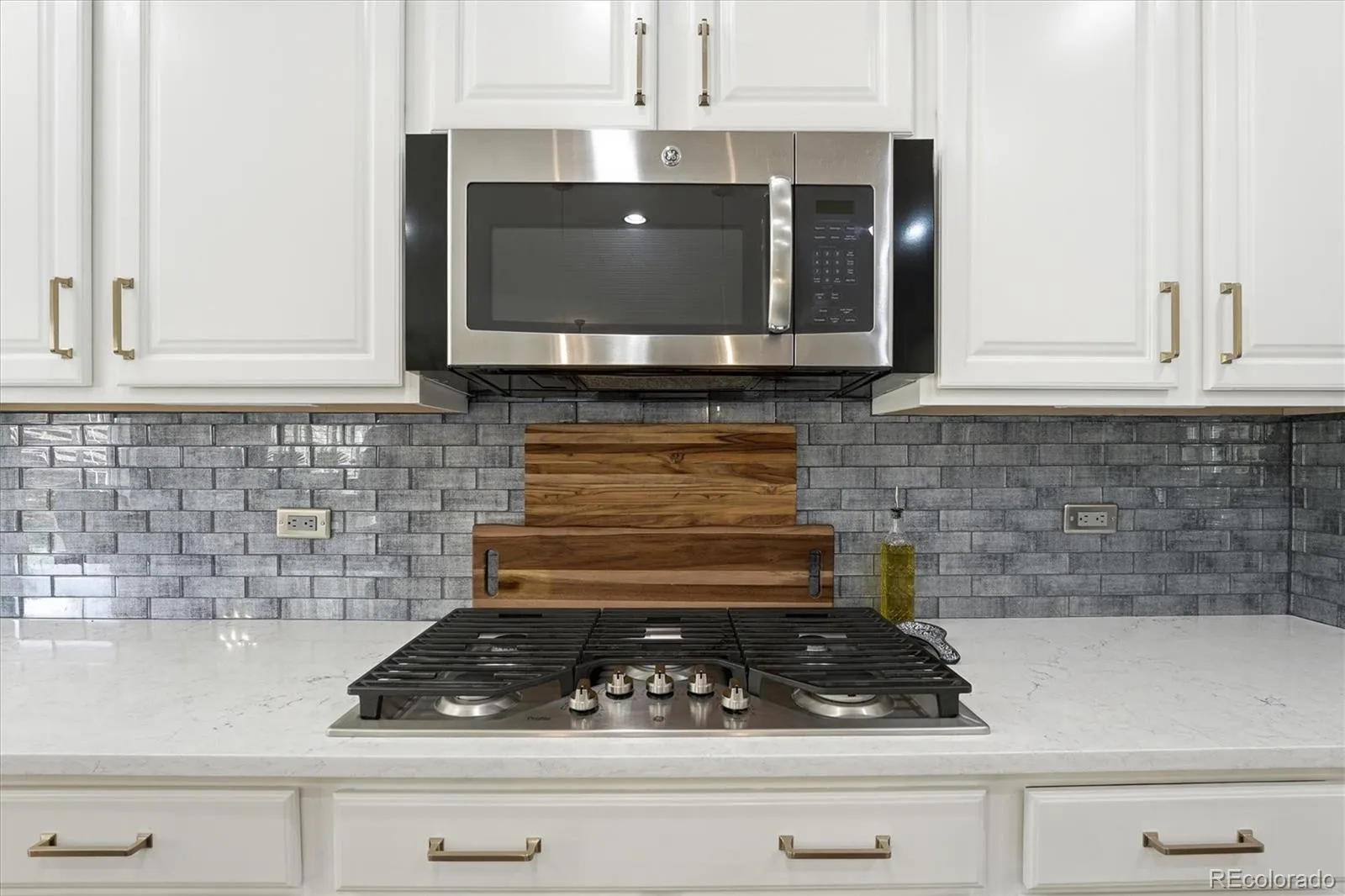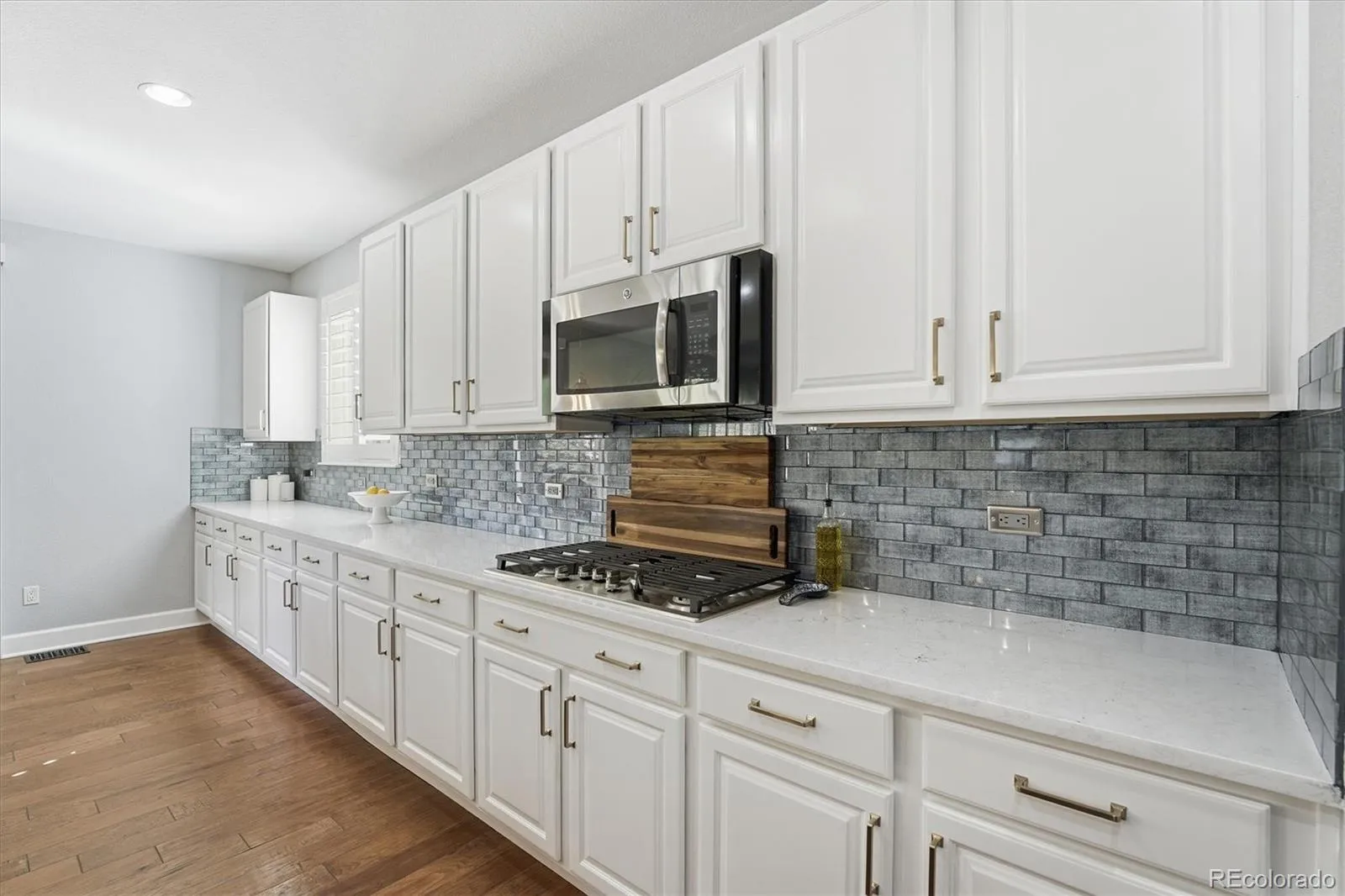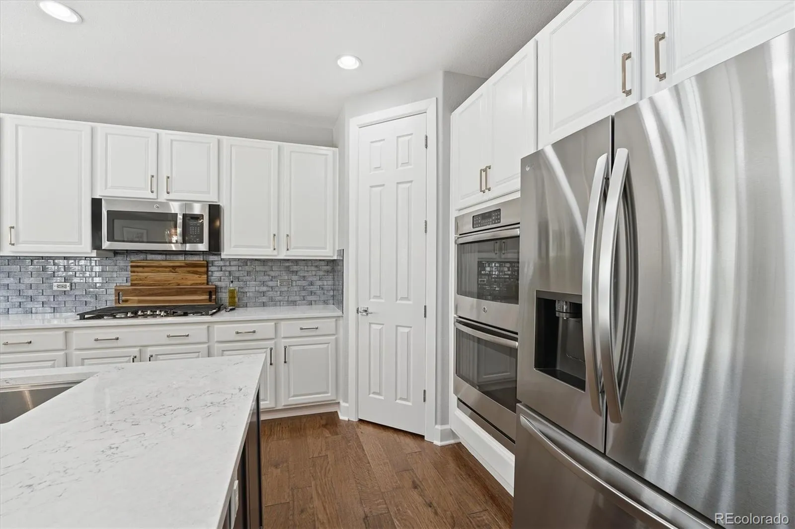 cooktop, double ovens, custom cabinetry, tile backsplash, and a walk-in pantry. The