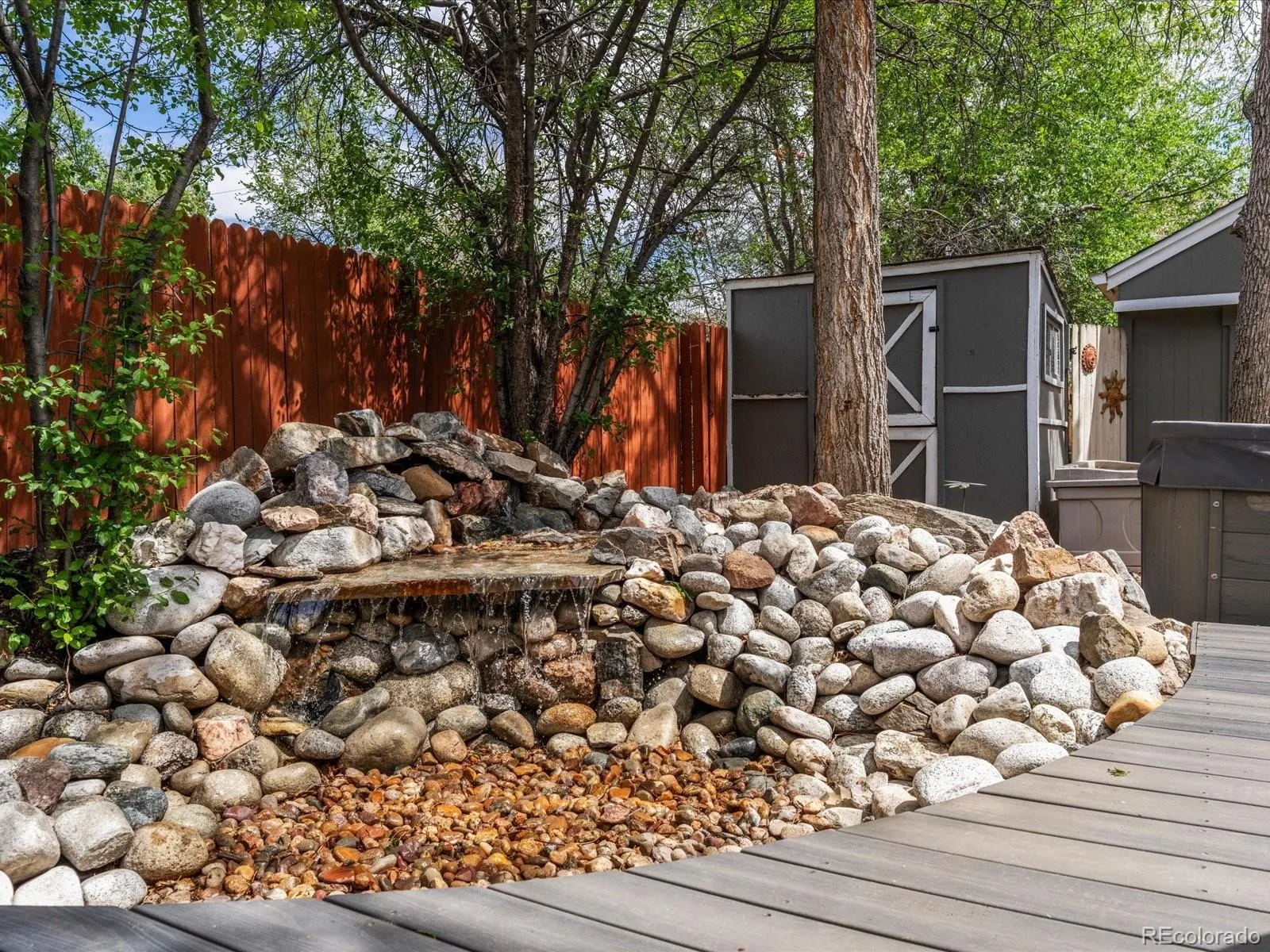 Outside, you’ll find a private backyard retreat featuring a Trex deck with a built-in waterfall feature and new sod installed last year – perfect for relaxing or entertaining. The oversized one-car detached garage (20 ft deep by 22 ft wide) offers the potential for a workspace or could even be converted into a two-car setup. Adjacent to the garage is an additional parking space that easily accommodates a camper or recreational vehicle.