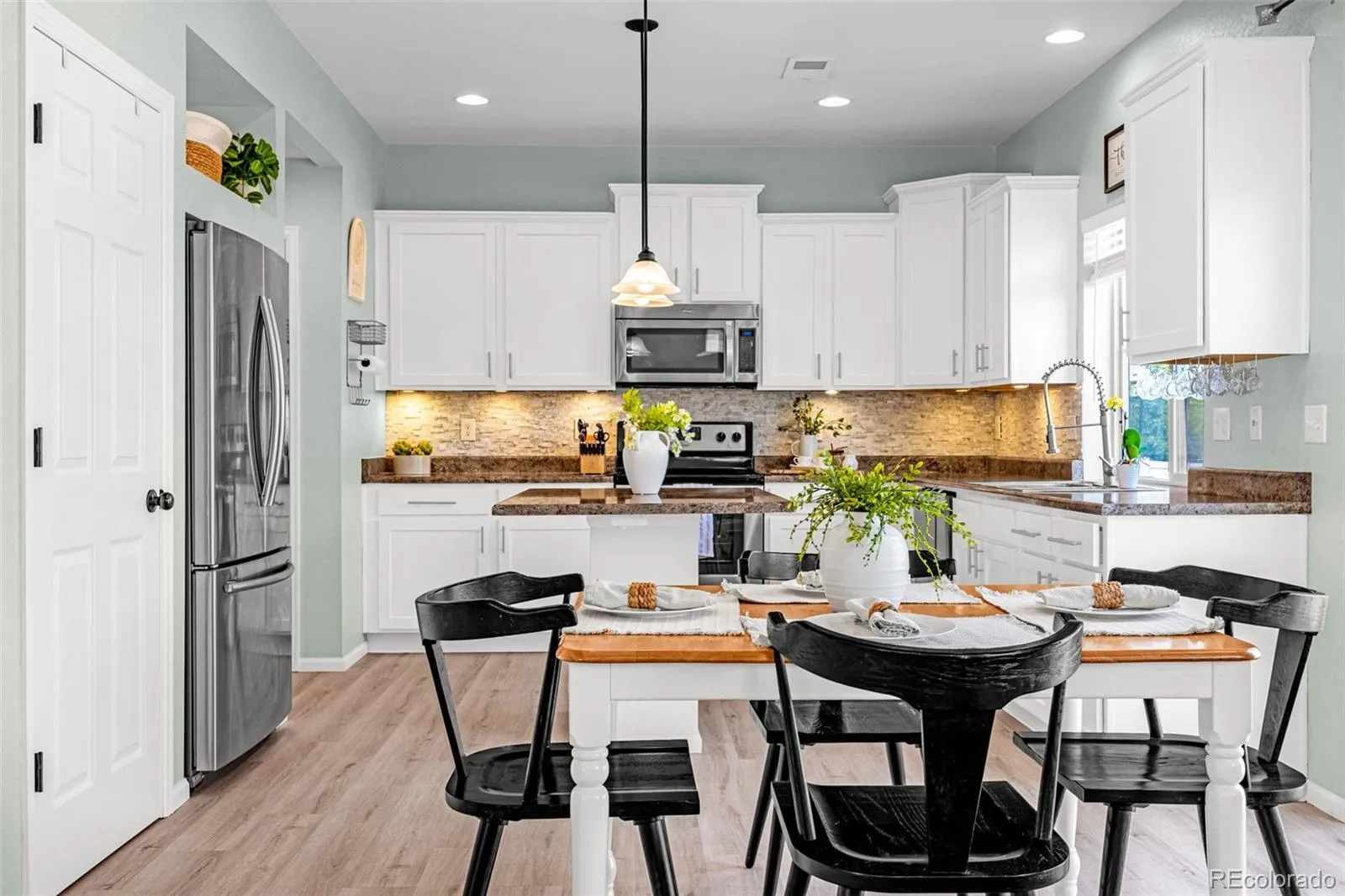 The upgraded chef’s kitchen flows seamlessly from the living area, featuring stainless steel appliances, recessed lighting, and a spacious eat-in island that naturally becomes the gathering spot. LVP flooring runs throughout the main level, offering both style and durability. Just off the living space, a functional mudroom and access to the fully finished garage keep everyday life organized and efficient.