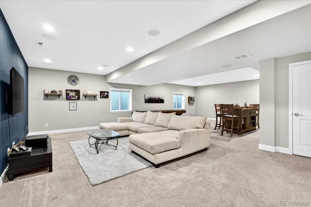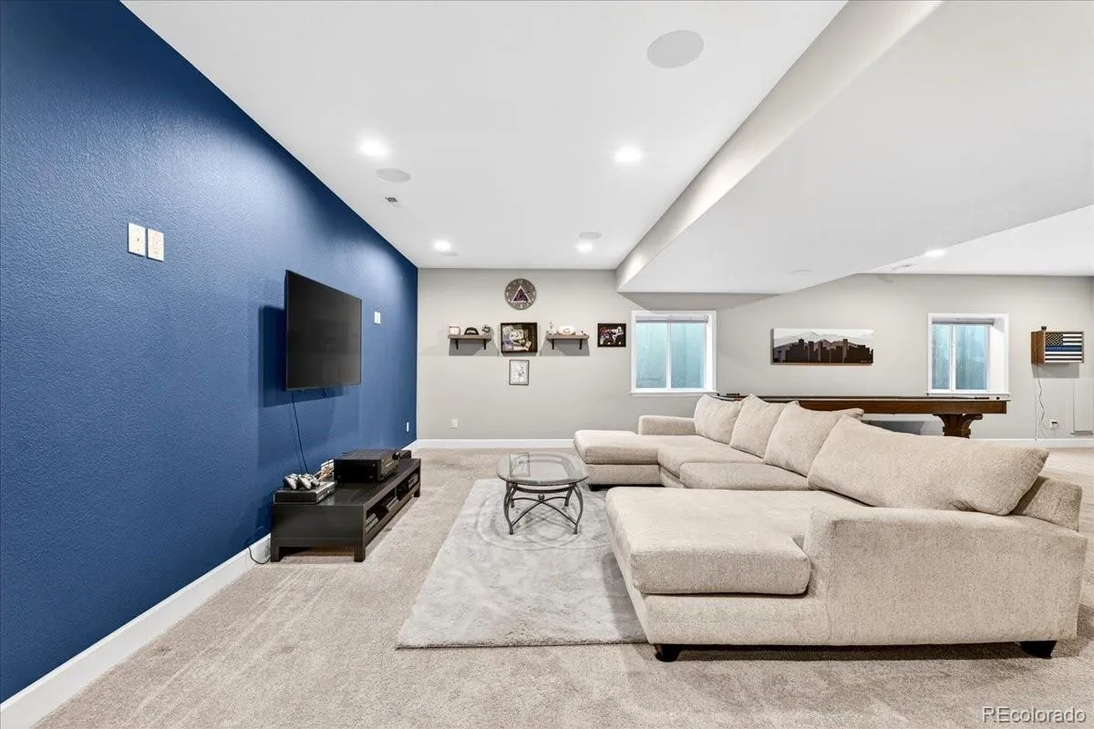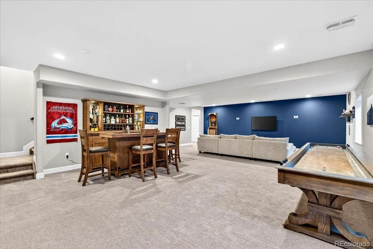 Downstairs, the basement is fully finished with a big, open, and functionally shaped living room and bar perfect for game days. There is also another bedroom, and a bathroom perfect for guests or roommates.