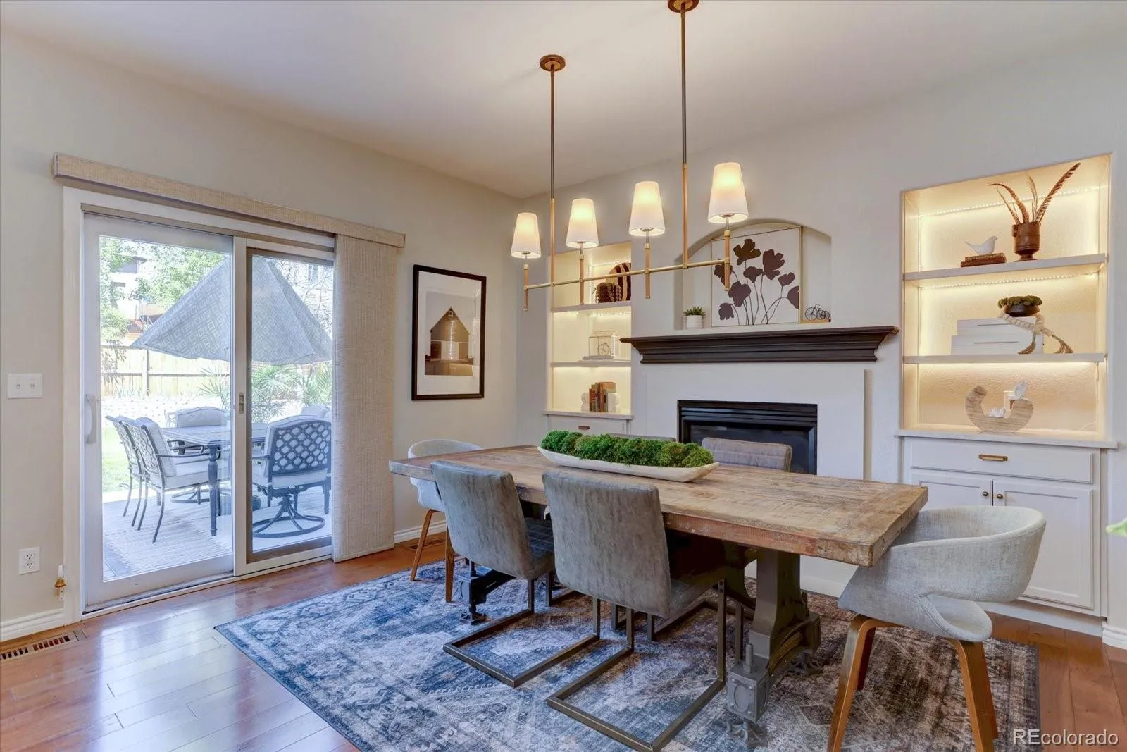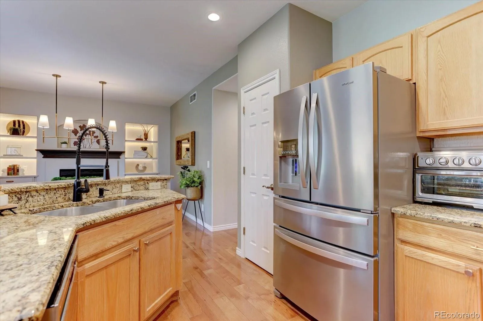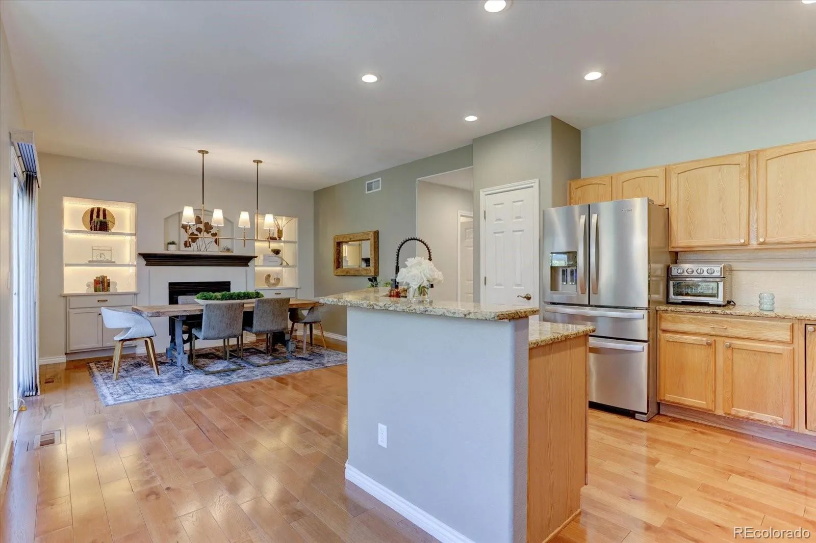 Upon entry, you are greeted by warm hardwood floors, designer paint selections, and a striking staircase that creates an inviting first impression. The main level features a dedicated front office, ideal for working from home or a quiet retreat, along with a spacious eat-in kitchen complete with slab granite countertops, double ovens, and a generous pantry designed for both everyday living and entertaining. Enjoy dining by a gas fireplace. Main floor laundry room with combo washer/dryer.