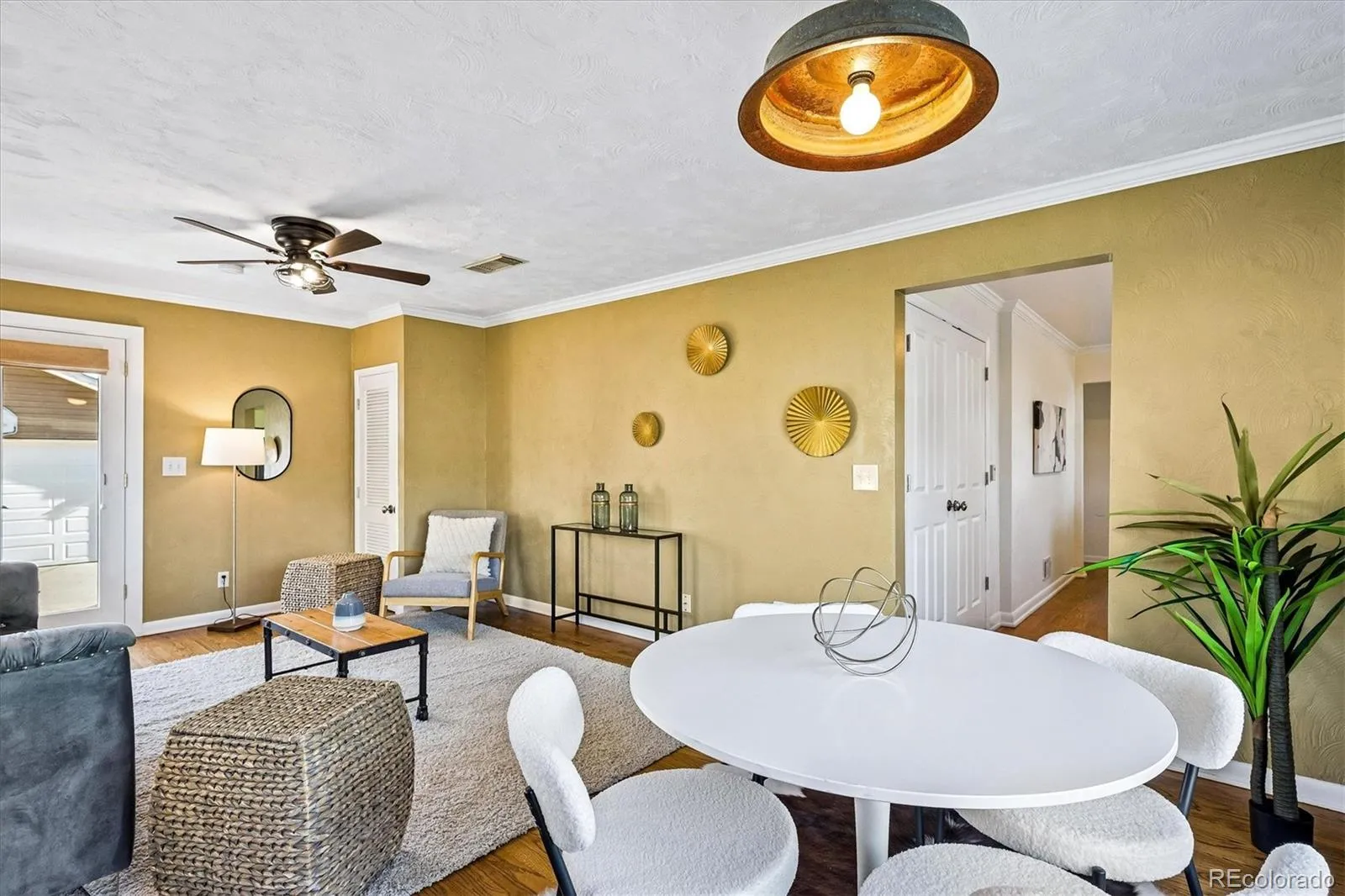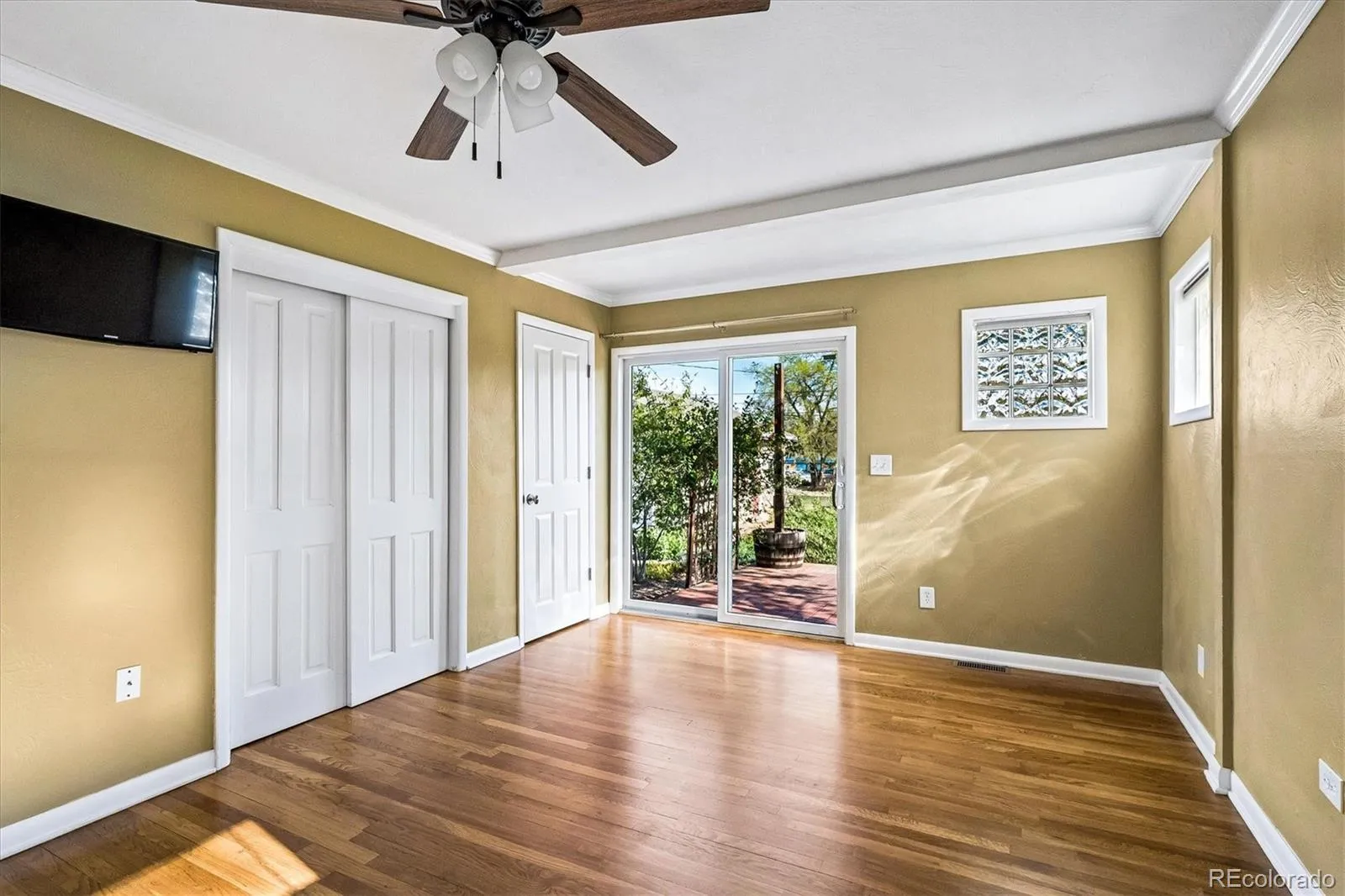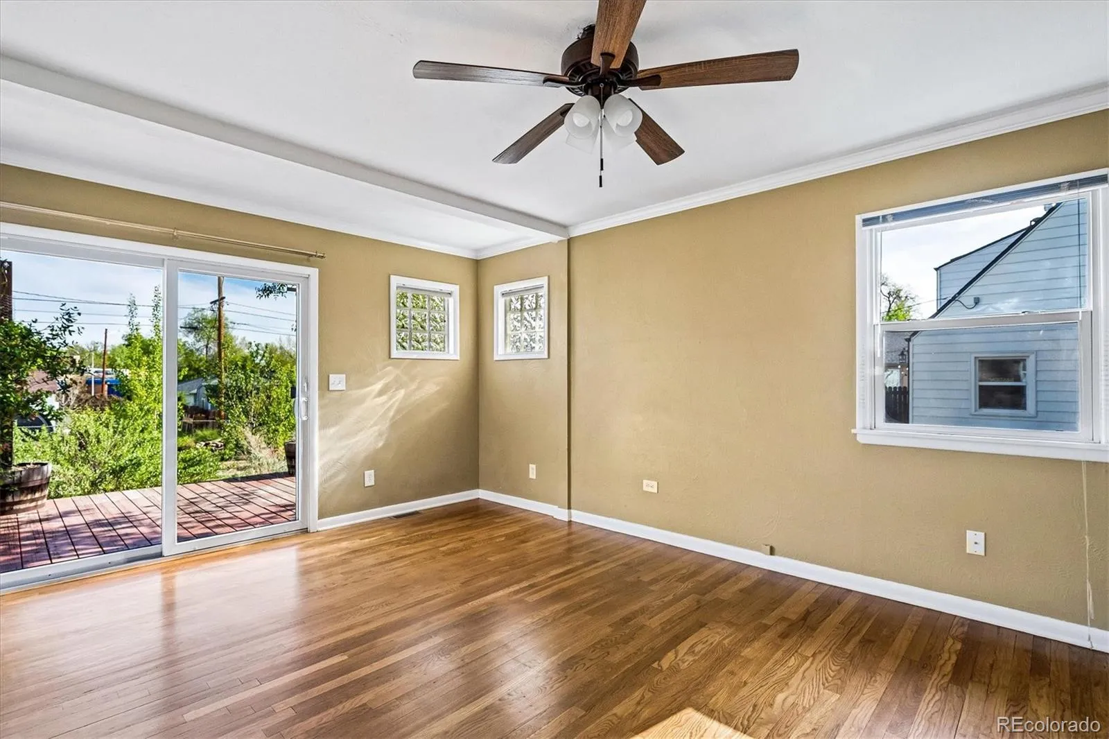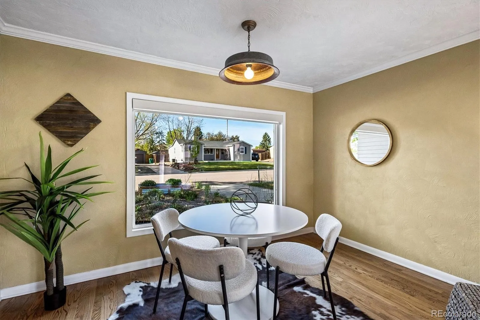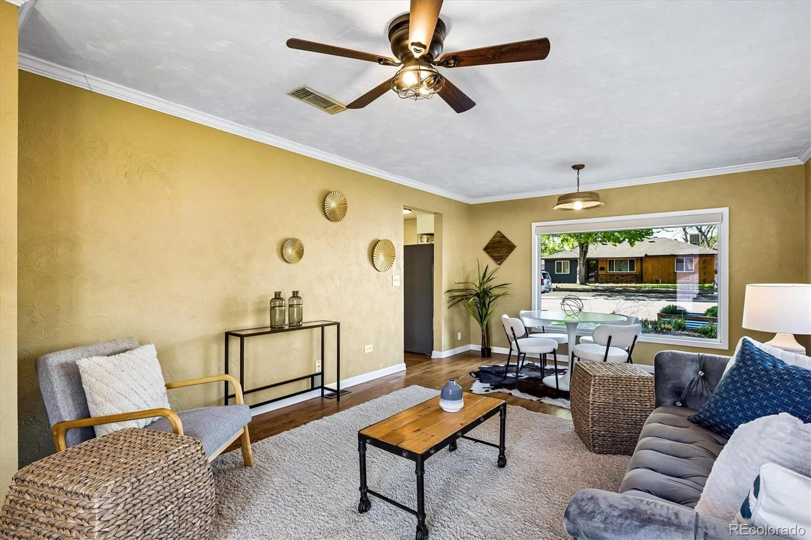 Gorgeous bungalow in the heart of sought-after Wheat Ridge – This beautifully renovated home offers a fantastic, functional floor plan paired with timeless character and beautiful finishes throughout. Gleaming hardwood floors span the entire main level, complemented by crown molding, smooth trowel-textured walls, and an abundance of natural light from large windows in every room. The spacious primary bedroom is a true retreat, featuring dual windows and a sliding glass door that opens to a private deck—perfect for morning coffee or evening relaxation. The updated kitchen is ideal for both everyday living and entertaining, complete with a gas range, ample cabinetry, and newer appliances. Enjoy gathering in the bright dining and great room, where expansive windows and atrium doors seamlessly connect indoor and outdoor living. Secondary bedrooms are generously sized and filled with natural light, while the beautifully updated bathroom features thoughtful finishes. Step outside to a backyard oasis, featuring a deck off the primary suite, a beautiful flagstone patio, custom water feature, garden beds, and mature landscaping. The oversized two-car garage and extended driveway provide plenty of parking and storage. Additional peace of mind with electrical panel, garage door, and appliances within the last year. With fantastic curb appeal this home truly has it all. Located in one of Wheat Ridge’s most desirable and rapidly growing pockets, just minutes from Tennyson Street, the Highlands, and easy access to I-70, Denver, and Golden