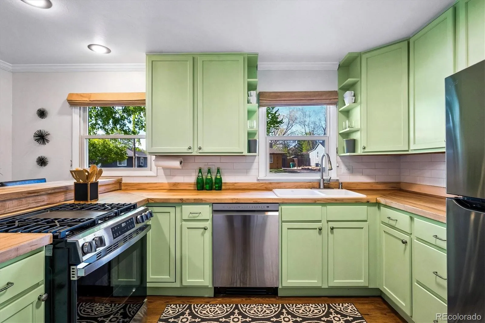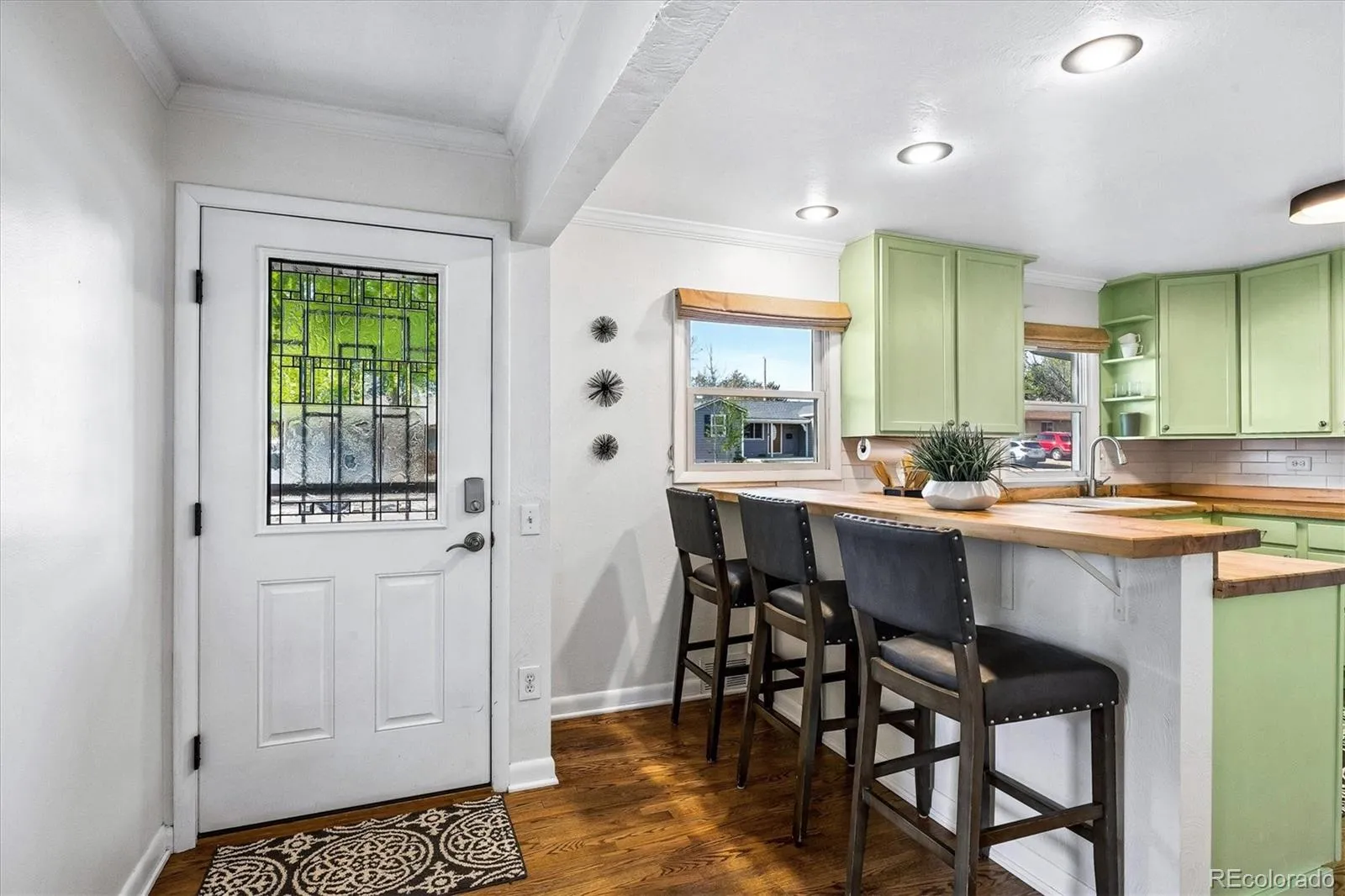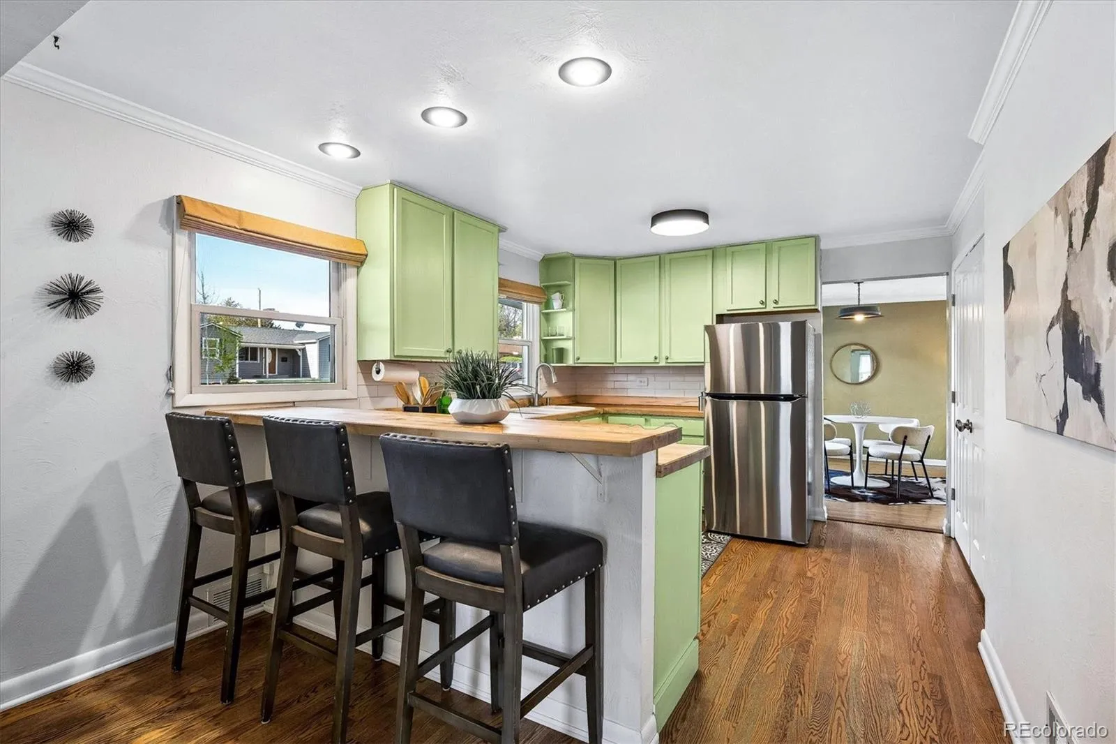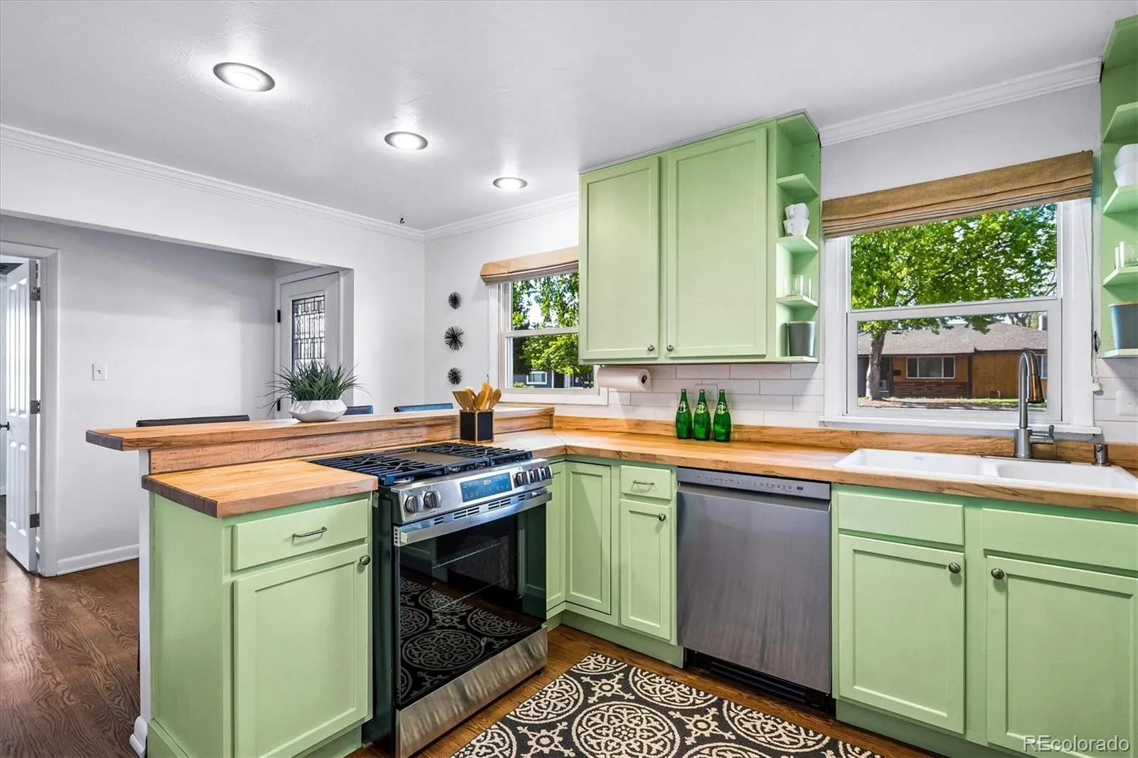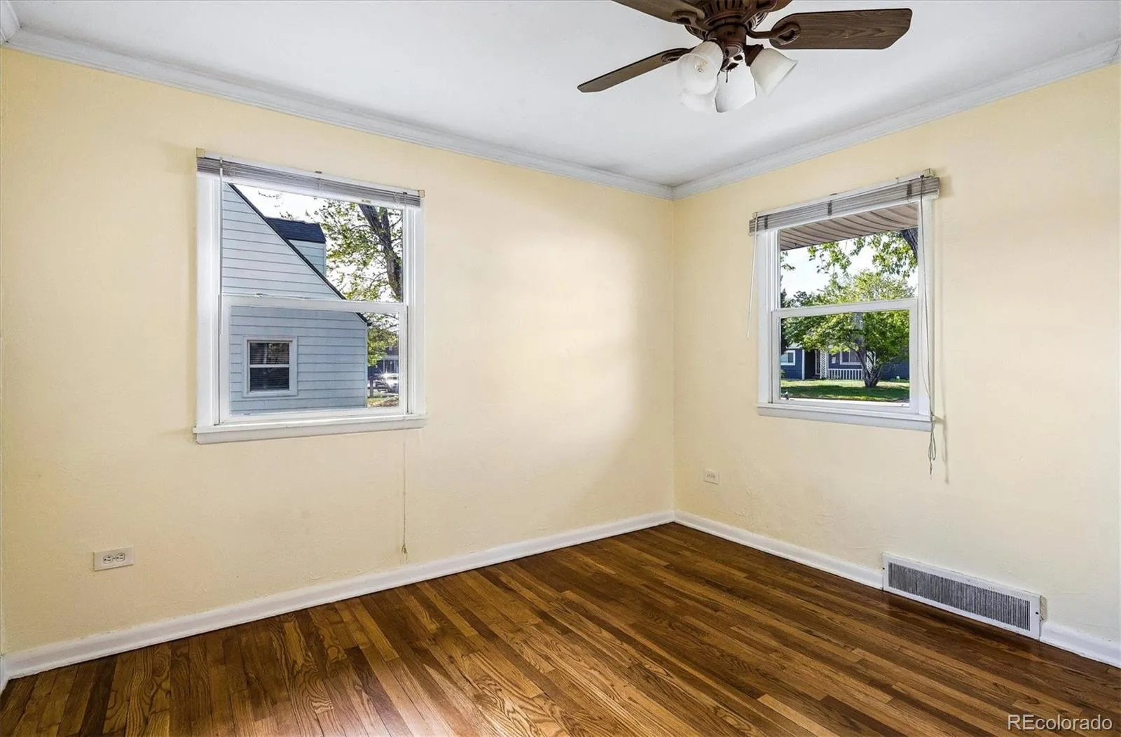 Gorgeous bungalow in the heart of sought-after Wheat Ridge – This beautifully renovated home offers a fantastic, functional floor plan paired with timeless character and beautiful finishes throughout. Gleaming hardwood floors span the entire main level, complemented by crown molding, smooth trowel-textured walls, and an abundance of natural light from large windows in every room. The spacious primary bedroom is a true retreat, featuring dual windows and a sliding glass door that opens to a private deck—perfect for morning coffee or evening relaxation. The updated kitchen is ideal for both everyday living and entertaining, complete with a gas range, ample cabinetry, and newer appliances. Enjoy gathering in the bright dining and great room, where expansive windows and atrium doors seamlessly connect indoor and outdoor living. Secondary bedrooms are generously sized and filled with natural light, while the beautifully updated bathroom features thoughtful finishes. Step outside to a backyard oasis, featuring a deck off the primary suite, a beautiful flagstone patio, custom water feature, garden beds, and mature landscaping. The oversized two-car garage and extended driveway provide plenty of parking and storage. Additional peace of mind with electrical panel, garage door, and appliances within the last year. With fantastic curb appeal this home truly has it all. Located in one of Wheat Ridge’s most desirable and rapidly growing pockets, just minutes from Tennyson Street, the Highlands, and easy access to I-70, Denver, and Golden