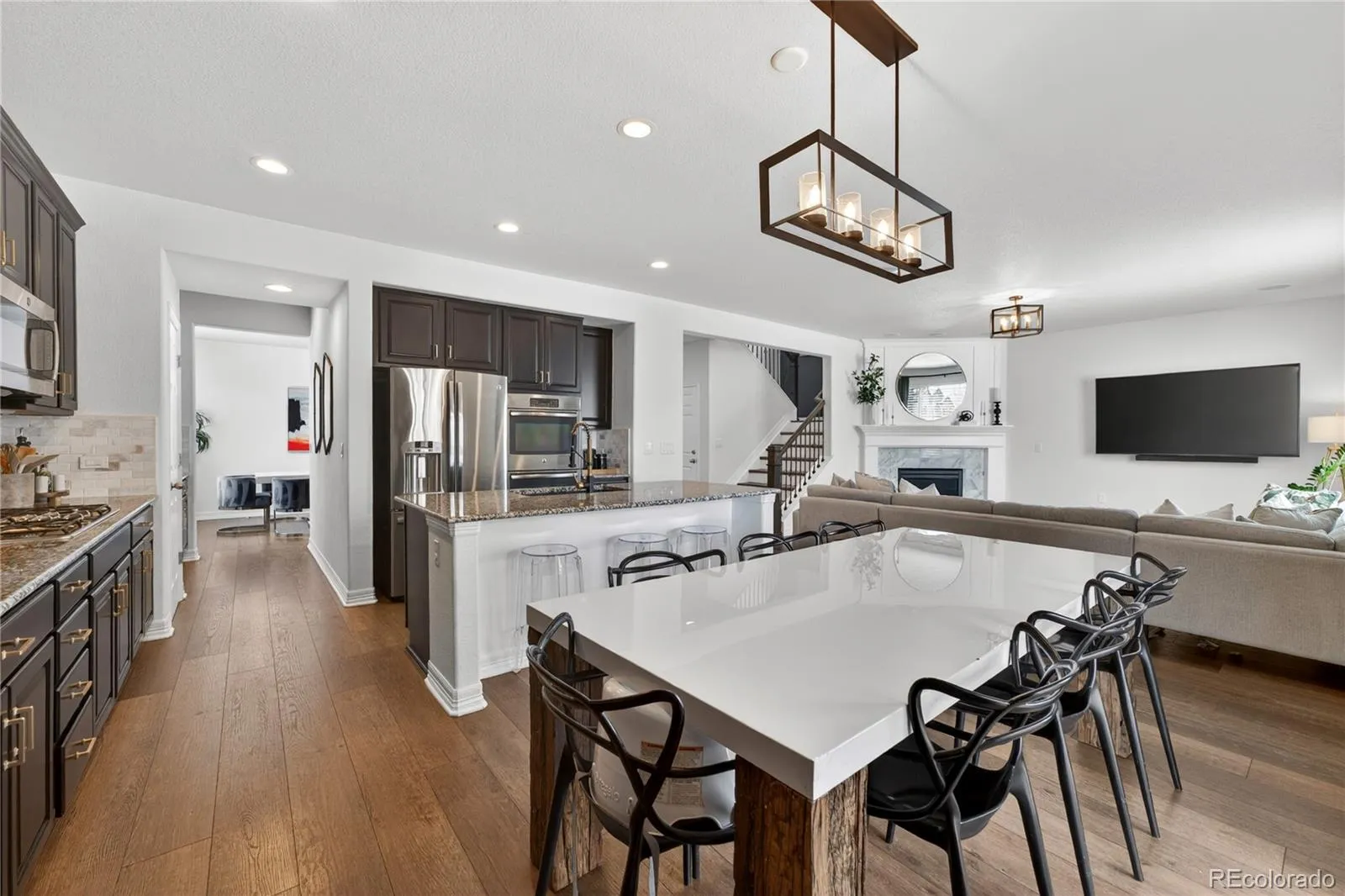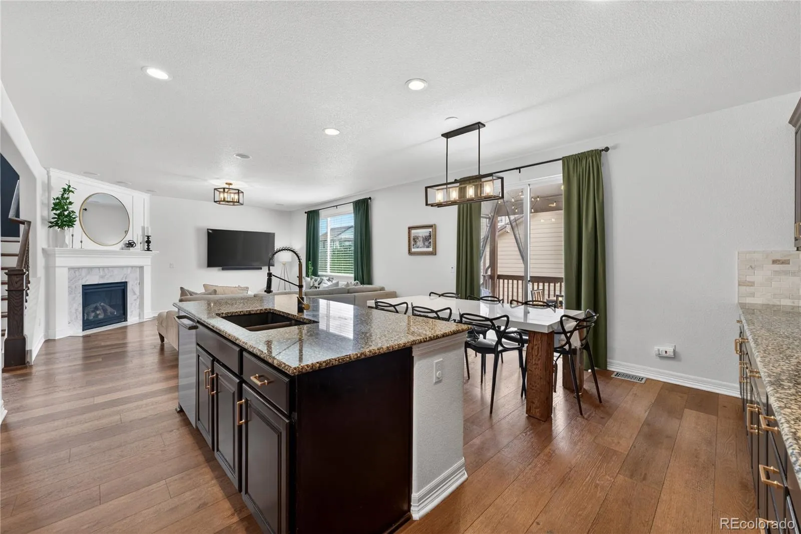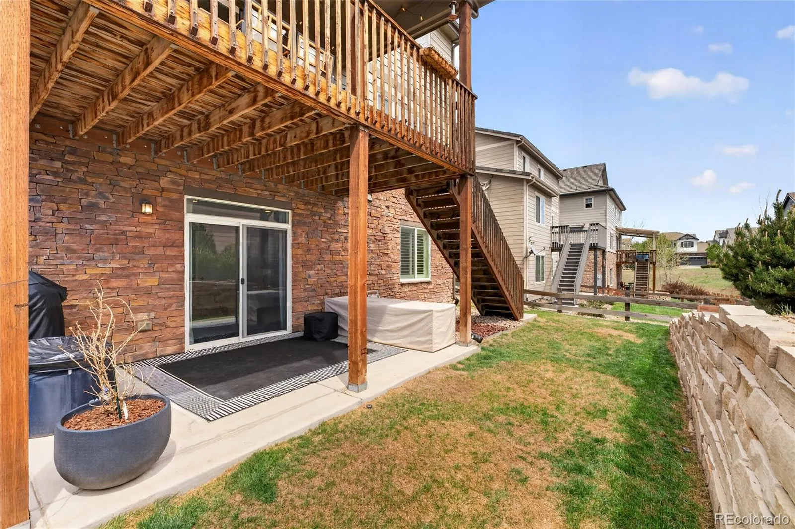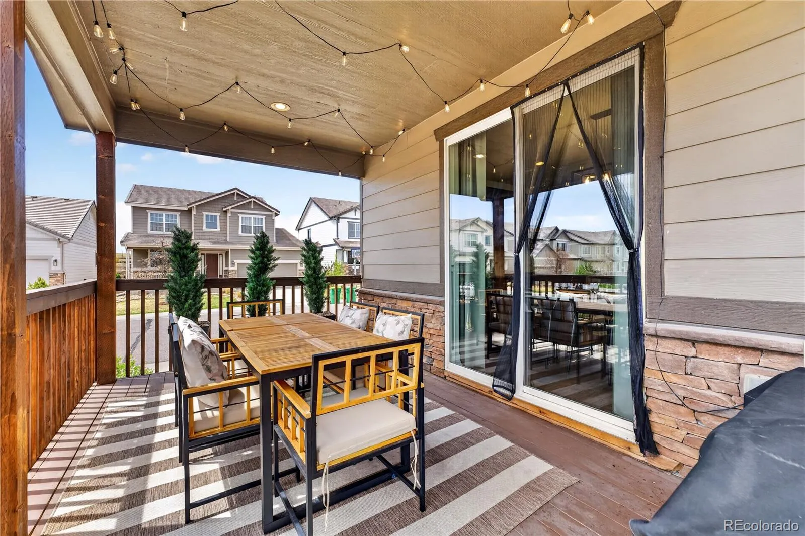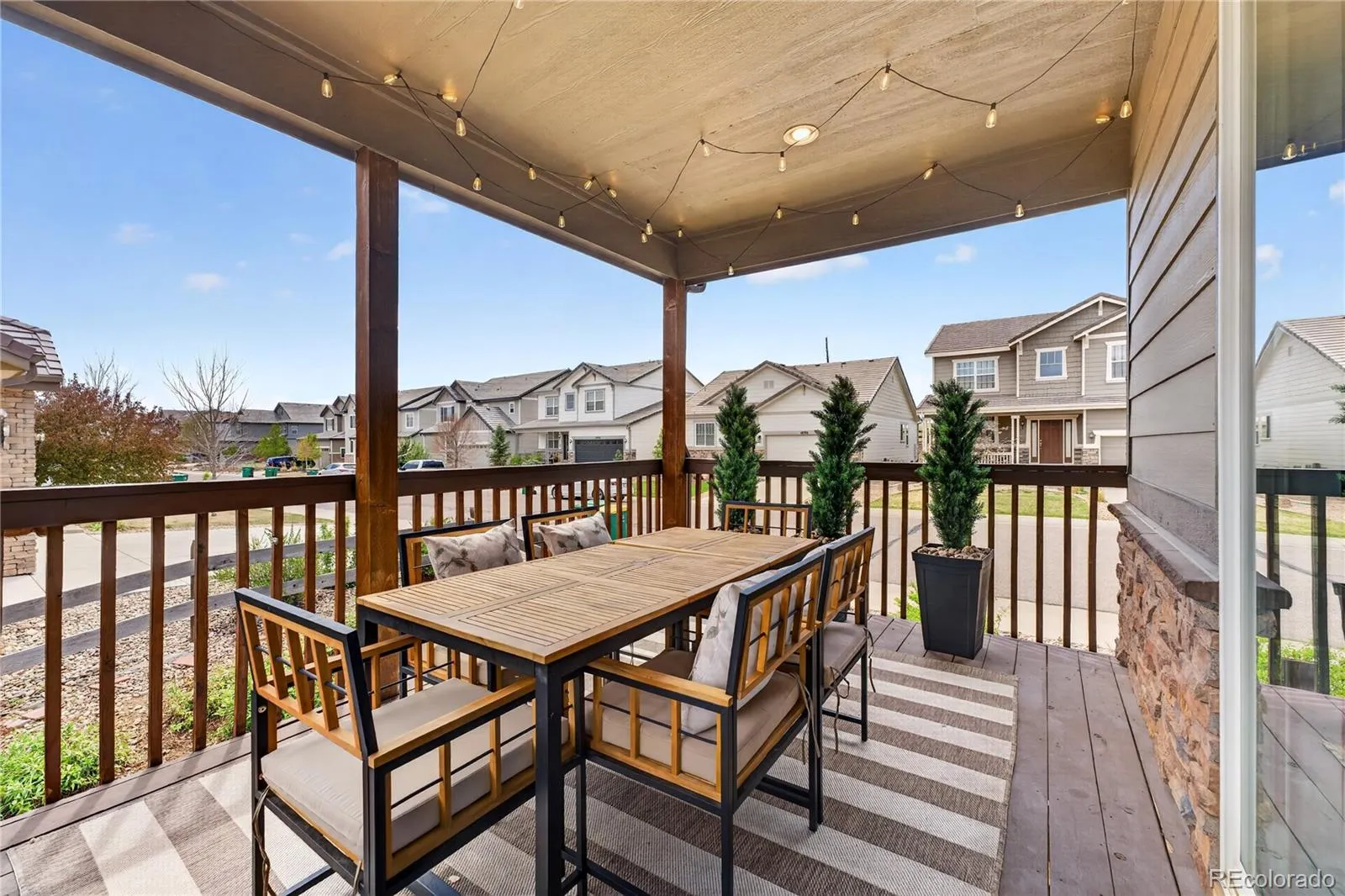 Fantastic, meticulously maintained home in the desirable Meridian Village community! Nestled on a quiet, low-traffic lot with friendly neighbors, this Craftsman-style residence offers charm, space, and everyday comfort. A classic covered front porch creates a warm welcome into a bright, open layout featuring easy-maintenance laminate wood flooring throughout the main living areas. The spacious living room flows seamlessly into the eat-in kitchen, complete with abundant warm wood cabinetry, granite countertops, stainless steel appliances including a 5-burner cooktop, a large center island with seating, and a convenient butler’s pantry. A cozy corner fireplace adds warmth and character, while the formal dining room is perfect for hosting gatherings. A main-level office provides an ideal work-from-home setup. Upstairs, you’ll find four generously sized bedrooms, including a relaxing primary suite with tray ceiling, a 5-piece en-suite bath, and an oversized walk-in closet. Convenient upper-level laundry adds ease to daily living. The finished walk-out basement expands your living space with a large family room, game area, an additional bedroom, and a nearby bathroom—perfect for guests. Enjoy Colorado living year-round with a large covered deck and lower-level covered patio, ideal for dining and relaxing in any weather. The yard is designed for low maintenance and includes garden boxes ready for spring planting. Recent updates include new carpet (2022), a beautifully remodeled basement bathroom (2024), upgraded lighting throughout key living spaces, new kitchen sink and cabinet hardware (2024), stylish backsplash update (2025), and fresh paint. Residents enjoy access to great HOA amenities including a pool, park, playgrounds, and walking paths just steps away. Conveniently located near E-470 and Parker Road for easy commuting, and served by highly regarded Douglas County Schools. Move-in ready and not to be missed!