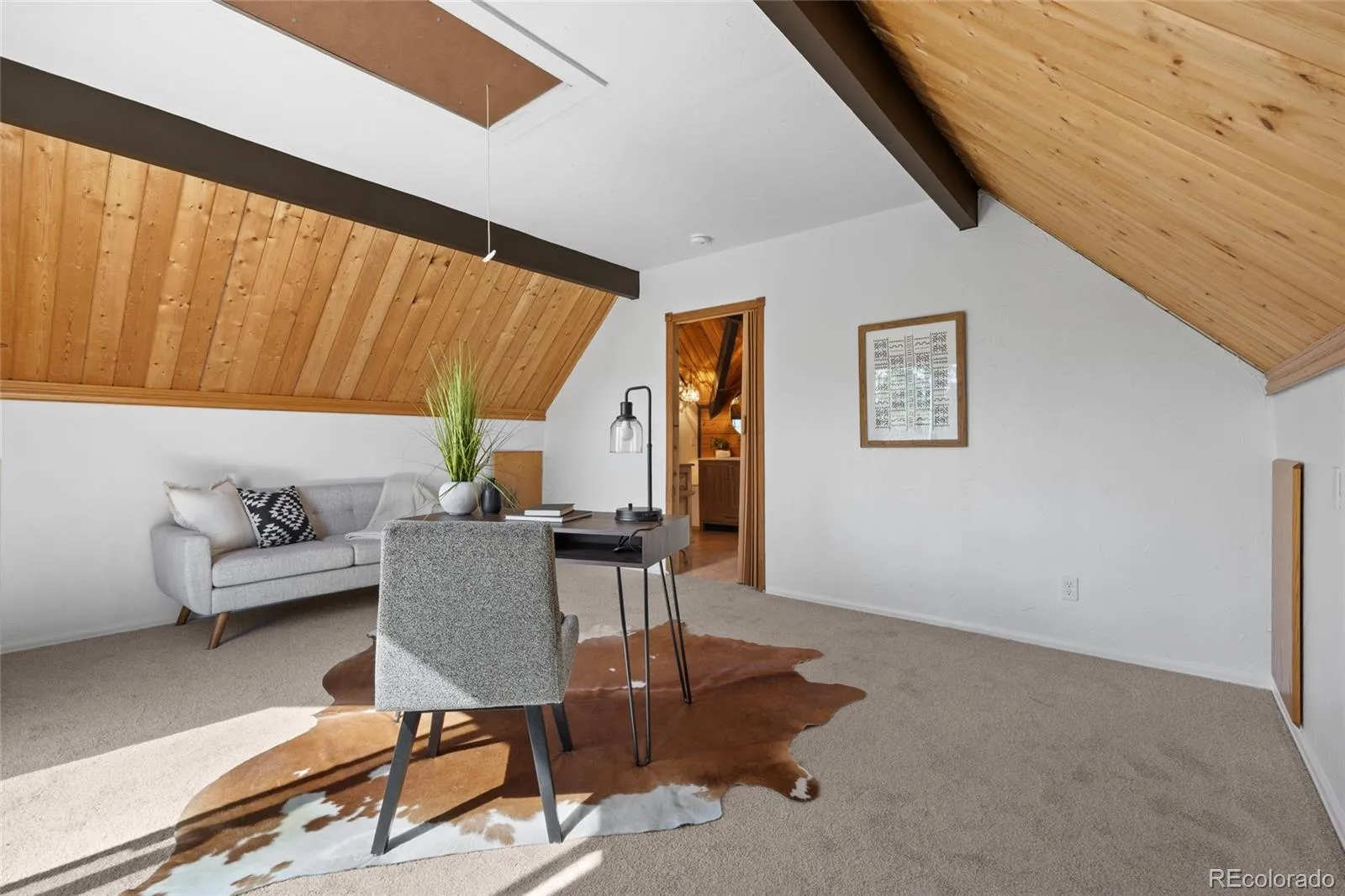 Stunning primary suite features a dramatic wood-accented vaulted ceiling, mountain views, and walk-in closet. Upper-level bedroom/office with private deck plus two main-floor bedrooms and full bath—ideal for multigenerational living.