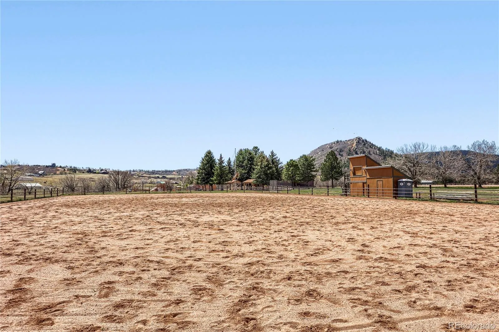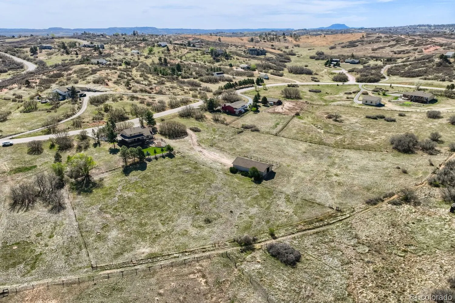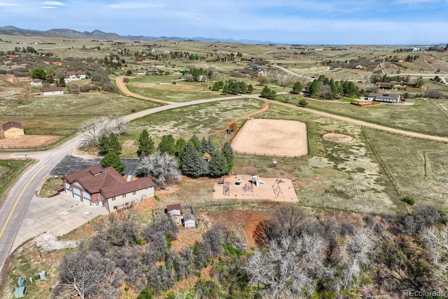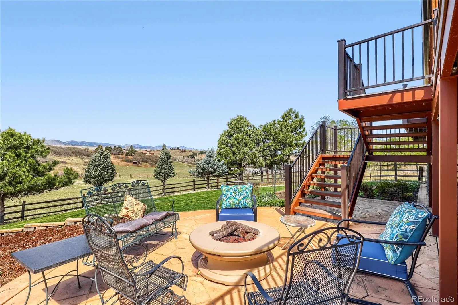 Experience elevated Colorado living with unmatched mountain views in this stunning home on 5.25 acres of pristine, fenced horse property. Perfectly balancing peaceful country living with convenience, this property is just 15 minutes from Castle Rock and within easy reach of both Denver and Colorado Springs. Designed for both lifestyle and functionality, this property is a true haven for equestrian enthusiasts. The impressive 2,000 sq. ft. pole barn features concrete floors, rubber matting, pipe-fenced runs, custom gates, hay storage, and upgraded 220-amp power. Residents also enjoy access to a vibrant community with a clubhouse, arena, playground, and miles of riding and hiking trails. Inside, the home showcases warmth and craftsmanship with solid custom wood doors and rich hardwood floors throughout. The gourmet kitchen features custom maple cabinetry, granite countertops, a gas range, and a high-end wall oven, perfect for everyday living and entertaining. The expansive family room offers vaulted ceilings and a cozy fireplace, flowing seamlessly into a walk-out basement ideal for guests or recreation. Flexible living spaces, including two home offices, provide versatility for today’s lifestyle. The oversized primary suite serves as a private retreat with a luxurious five-piece bath and a custom walk-in closet. Step outside to enjoy Colorado’s beauty from the wraparound covered Trex deck with custom wrought iron railings and a gas fire pit, perfect for year-round relaxation. The landscaped yard and decorative concrete patio create an ideal setting for entertaining while taking in breathtaking mountain vistas. Additional features include natural gas, underground utilities, a whole-house water filtration system, sprinkler system, and a community well. This is more than a home—it’s a lifestyle. Don’t miss this rare opportunity to own in a sought-after equestrian community. Clubhouse, community arena and playground located at 7149 Cherokee Dr, Sedalia, CO 80135