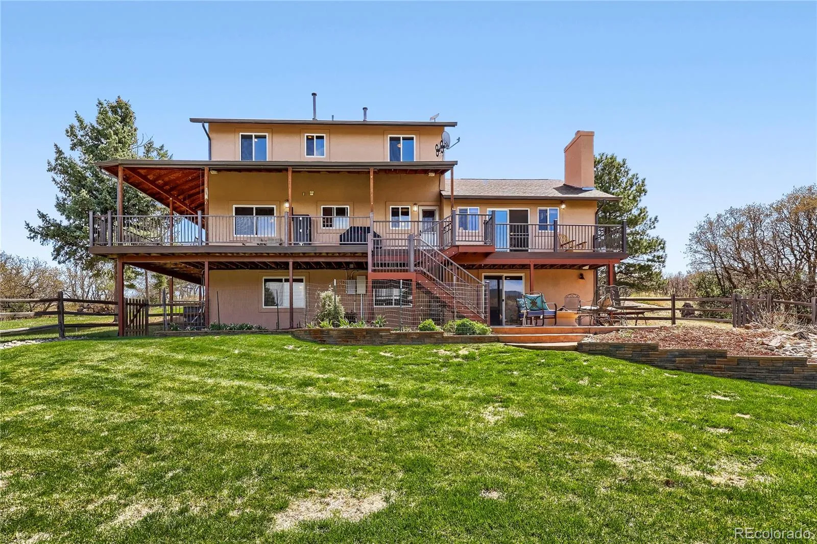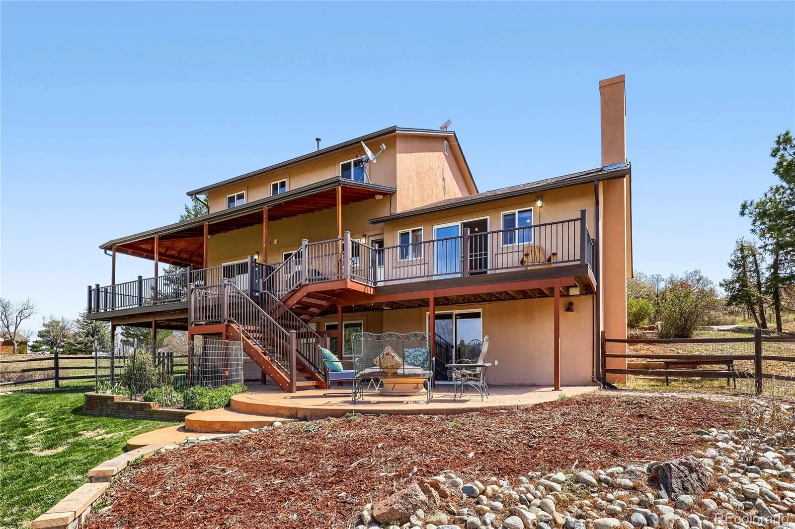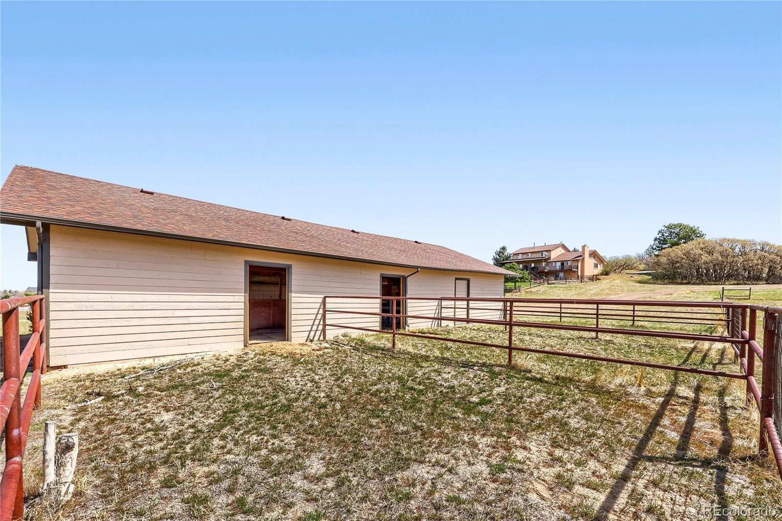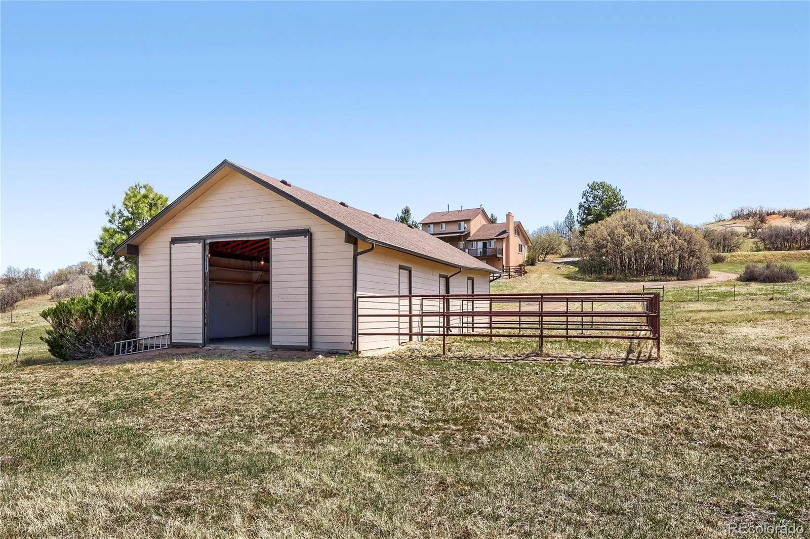 Experience elevated Colorado living with unmatched mountain views in this stunning home on 5.25 acres of pristine, fenced horse property. Perfectly balancing peaceful country living with convenience, this property is just 15 minutes from Castle Rock and within easy reach of both Denver and Colorado Springs. Designed for both lifestyle and functionality, this property is a true haven for equestrian enthusiasts. The impressive 2,000 sq. ft. pole barn features concrete floors, rubber matting, pipe-fenced runs, custom gates, hay storage, and upgraded 220-amp power. Residents also enjoy access to a vibrant community with a clubhouse, arena, playground, and miles of riding and hiking trails. Inside, the home showcases warmth and craftsmanship with solid custom wood doors and rich hardwood floors throughout. The gourmet kitchen features custom maple cabinetry, granite countertops, a gas range, and a high-end wall oven, perfect for everyday living and entertaining. The expansive family room offers vaulted ceilings and a cozy fireplace, flowing seamlessly into a walk-out basement ideal for guests or recreation. Flexible living spaces, including two home offices, provide versatility for today’s lifestyle. The oversized primary suite serves as a private retreat with a luxurious five-piece bath and a custom walk-in closet. Step outside to enjoy Colorado’s beauty from the wraparound covered Trex deck with custom wrought iron railings and a gas fire pit, perfect for year-round relaxation. The landscaped yard and decorative concrete patio create an ideal setting for entertaining while taking in breathtaking mountain vistas. Additional features include natural gas, underground utilities, a whole-house water filtration system, sprinkler system, and a community well. This is more than a home—it’s a lifestyle. Don’t miss this rare opportunity to own in a sought-after equestrian community. Clubhouse, community arena and playground located at 7149 Cherokee Dr, Sedalia, CO 80135