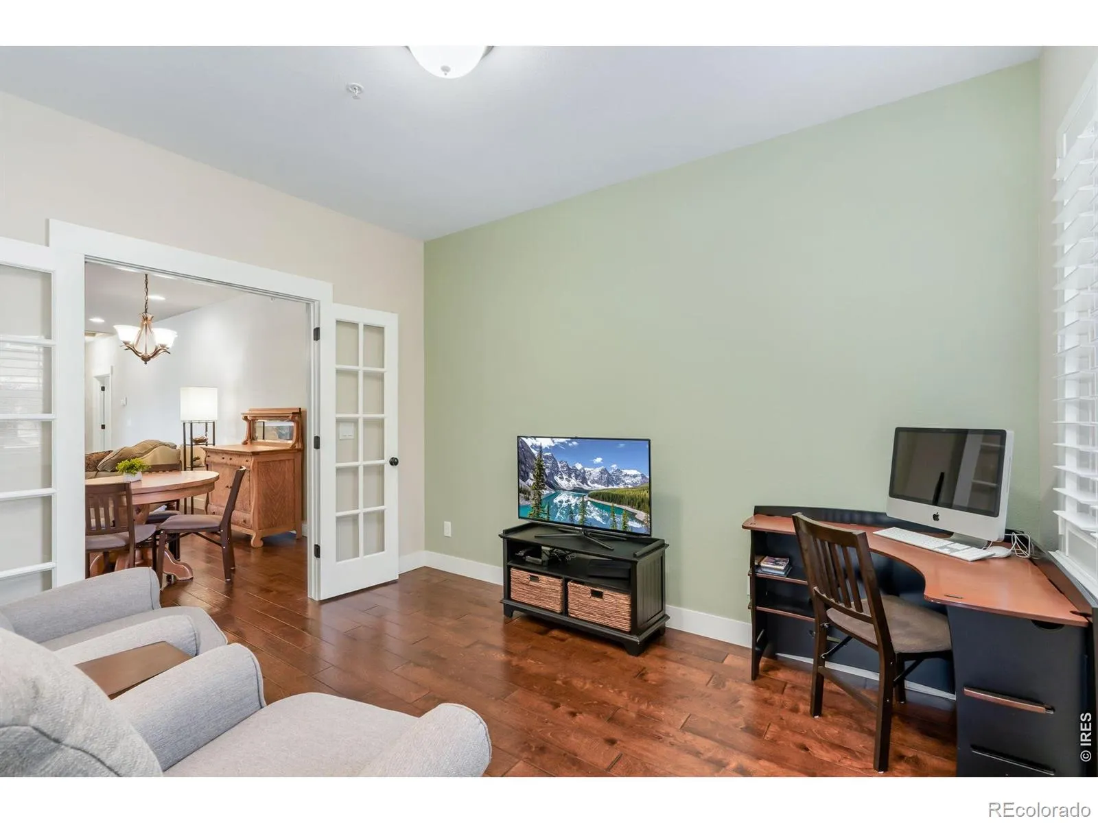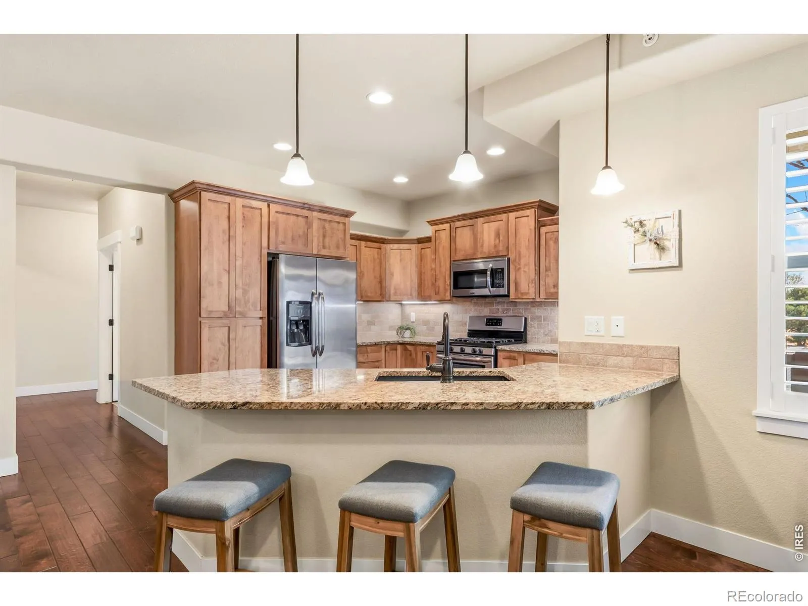 Rare main-level living with expansive finished space in this impeccably maintained Fossil Lake Ranch condo. Designed for accessibility, the floor plan features 9ft ceilings, engineered hardwoods, and roll-in access from the 2-car garage. The kitchen is appointed with hickory cabinetry, granite countertops, and a brand-new dishwasher, opening to a living area with a cozy fireplace. The main floor also includes an office with French doors, a primary suite with a full en-suite bath and walk-in closet, plus an additional bedroom and full bath. The finished basement offers LVP flooring, a cozy movie area, a rec room, a 3/4 bath, and two additional bedrooms, plus unfinished storage area. Outdoor features include a patio for dining al fresco and plenty of guest parking. Ideally located in SE Fort Collins near top-rated schools, shopping, dining, and I-25, with nearby walking and biking trails. Residents may also access the neighborhood pool for an additional annual fee. This home combines ranch-style convenience with the space of a larger residence.