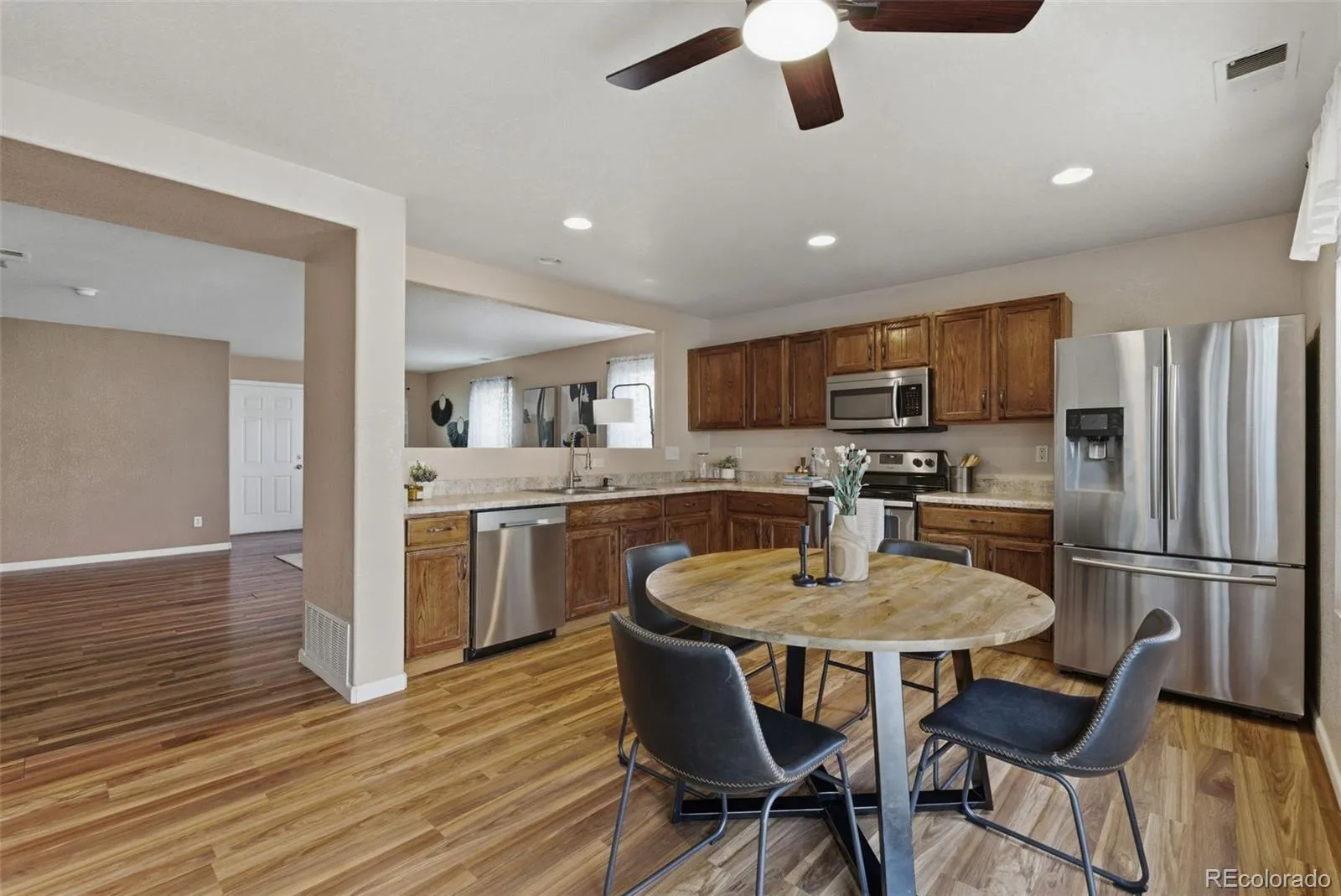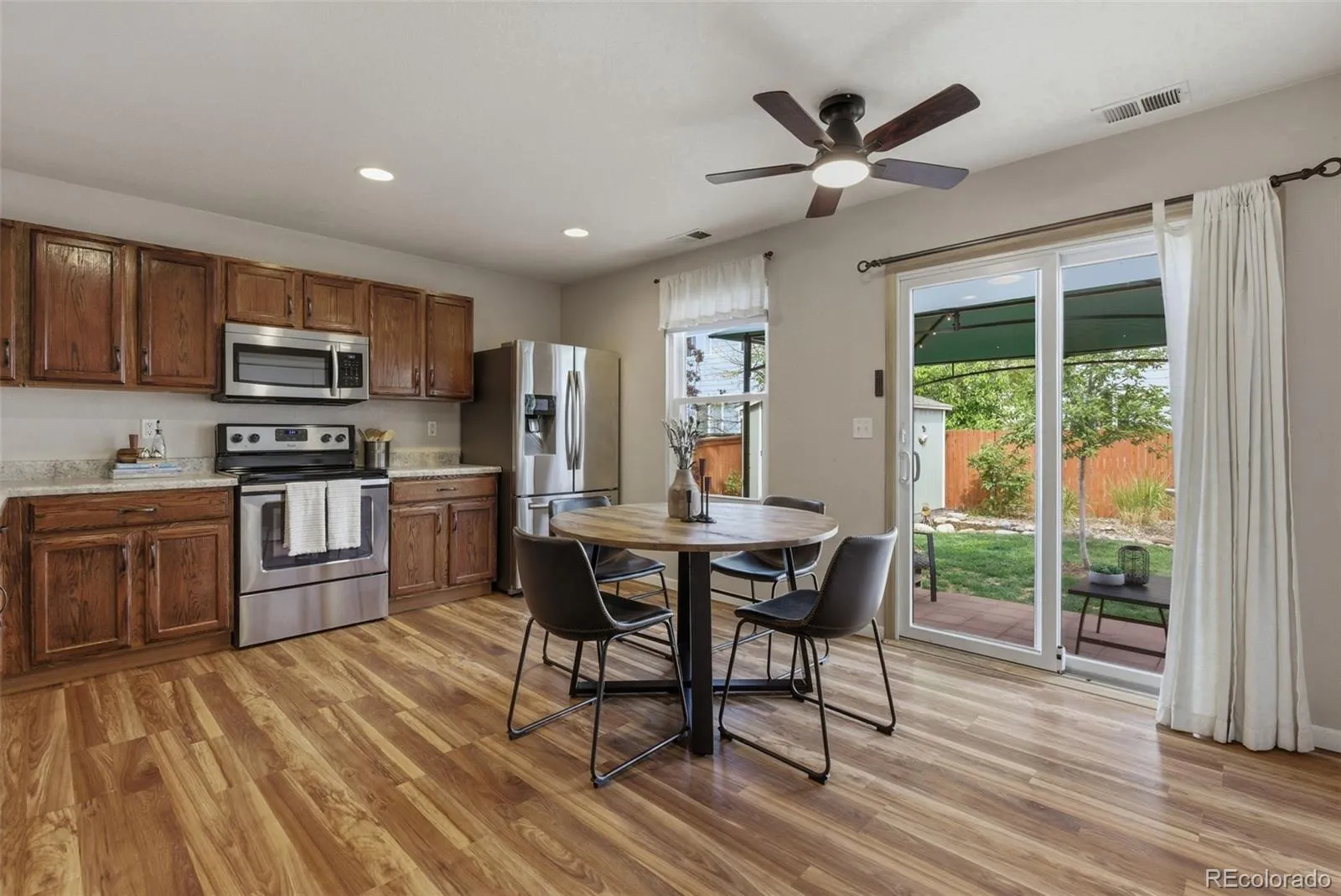 Beautifully maintained townhome in desirable Platte River Ranch. This immaculate 2-bedroom, 1-bath home features durable wood-look LVP flooring and an open-concept main level that flows seamlessly from living to dining to kitchen, ideal for everyday living and entertaining. The bright kitchen offers ample cabinets with a functional layout. Step outside to a nicely sized, private backyard that’s perfect for BBQs, gardening, or relaxing. An additional shed provides excellent storage or a flexible hobby space. Recent upgrades include new windows, north siding, and a newer heater, helping reduce future maintenance and improve comfort and efficiency. Enjoy the Colorado lifestyle right out your front door with nearby Ken Mitchell Park, offering scenic walking and biking trails along the lake and the South Platte River. This townhome is conveniently located less than 10 minutes from shopping, dining, and everyday services, with easy access to Highway 85 for commuting to the Denver metro area or Northern Colorado. If you’re looking for a low-maintenance townhome in a sought-after Brighton neighborhood with outdoor recreation, convenient access, and thoughtful updates, this property is a standout choice. Welcome home.