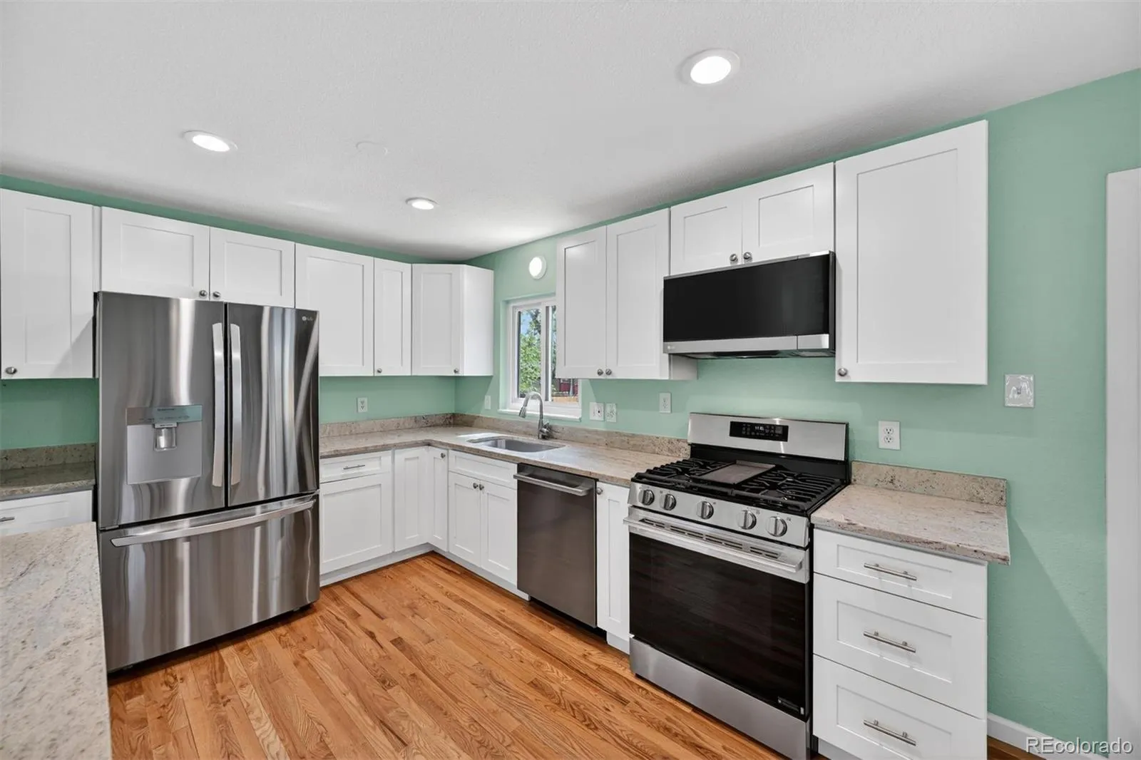 Beautifully remodeled Hutchinson brick ranch, perfectly situated on a quiet lot in the highly sought-after Green Mountain Village neighborhood. This timeless Hutchinson floor plan offers an effortless flow from the kitchen into the dining and family room, ideal for both everyday living and entertaining. Rich, natural-finish oak hardwood floors extend throughout the entire main level, adding warmth and character. The spacious family room features a stunning picture window that floods the space with natural light and creates a seamless connection to the outdoors. The thoughtfully updated kitchen showcases white shaker cabinetry, quartz countertops, newer stainless steel appliances, and modern fixtures. Just off the kitchen, the dining area provides direct access to the inviting backyard. Enjoy the ease of a beautifully xeriscaped yard designed for low maintenance, complete with a covered patio—perfect for relaxing or entertaining year-round. A utility shed adds convenient extra storage. All bathrooms have been tastefully updated with custom tile work, newer fixtures, and stylish vanities. The fully finished basement offers exceptional flexibility, featuring a fourth bedroom, updated ¾ bath, expansive second family room, laundry area, and dedicated storage space. Additional recent upgrades include: New/high quality wood frame Carport, Heil furnace & Bradford White water heater(2023), exterior paint & fence staining, fresh paint inside, LG Appliances including a high-end gas range & dishwasher(2025), newer garbage disposal & ceiling fan. Located less than two miles from Hayden Park Open Space Trailhead, this home provides easy access to some of the area’s best hiking and biking. Light rail is just 1.5 miles away, and you’ll enjoy quick access to downtown, the mountains, 6th Avenue, C-470, I-70, St. Anthony’s Hospital, the Federal Center, and the all the excellent Union Square dining options. Serviced by excellent schools, this is truly a special place to call home.
