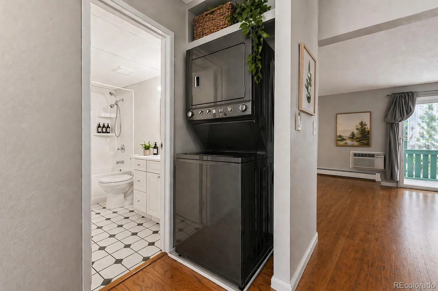The primary suite offers a comfortable retreat, complete with its own private bath. Both bathrooms feature one-piece tub and shower surrounds, designed for easy maintenance and a clean, streamlined look. Everyday living is made even more convenient with in-unit laundry, eliminating the need to leave home for routine tasks.