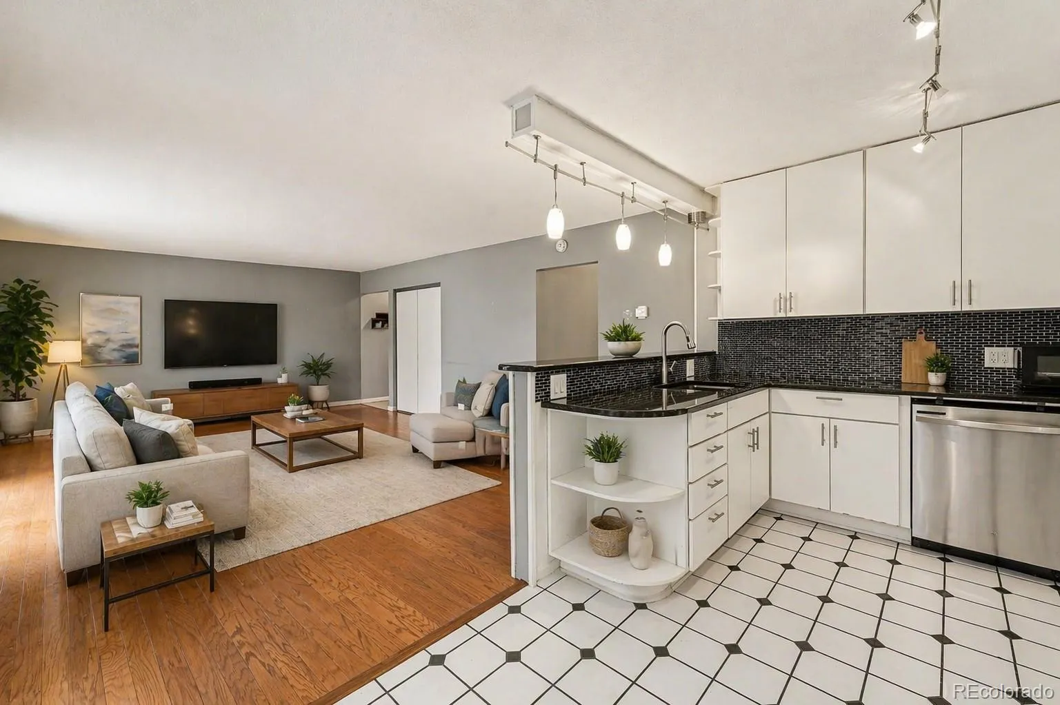 The kitchen blends style and function with sleek quartz countertops, modern cabinetry, and durable tile flooring that’s both practical and clean. Whether you’re preparing a quick meal or entertaining, the space feels efficient without sacrificing style. Just beyond, the open layout keeps everything connected while still allowing each area to feel defined.