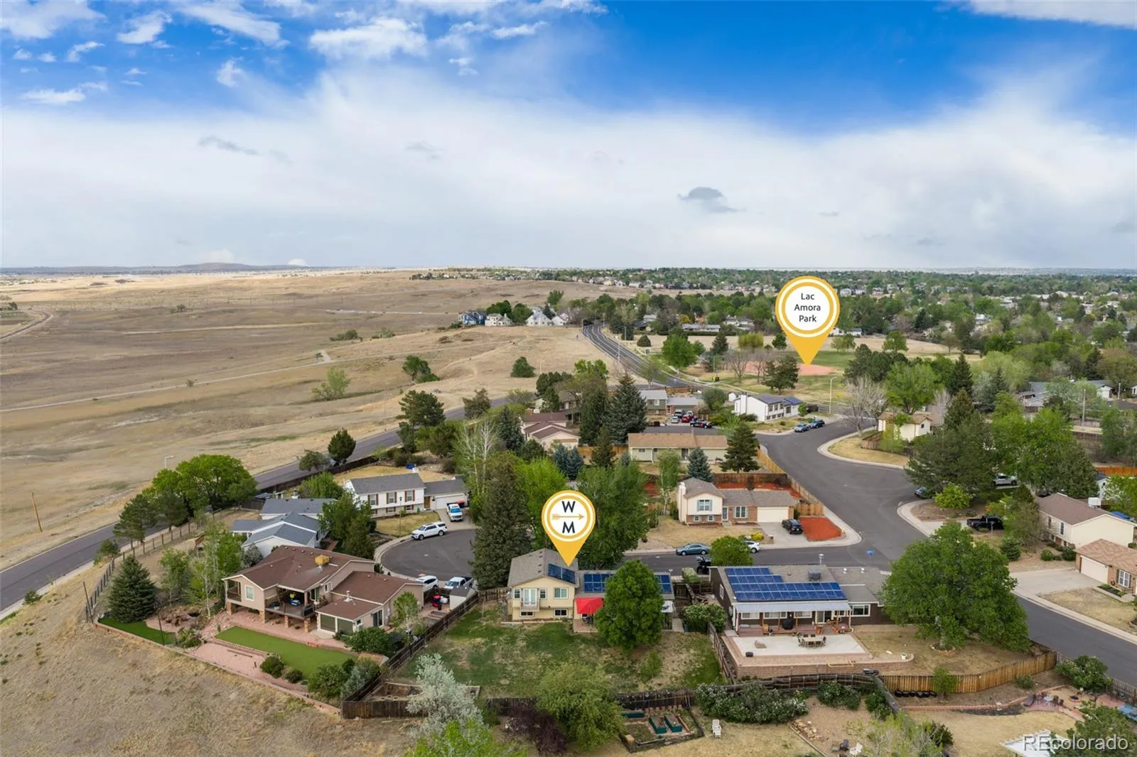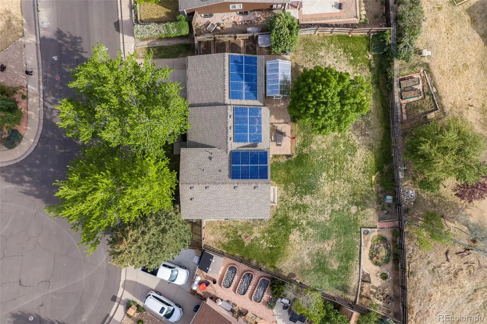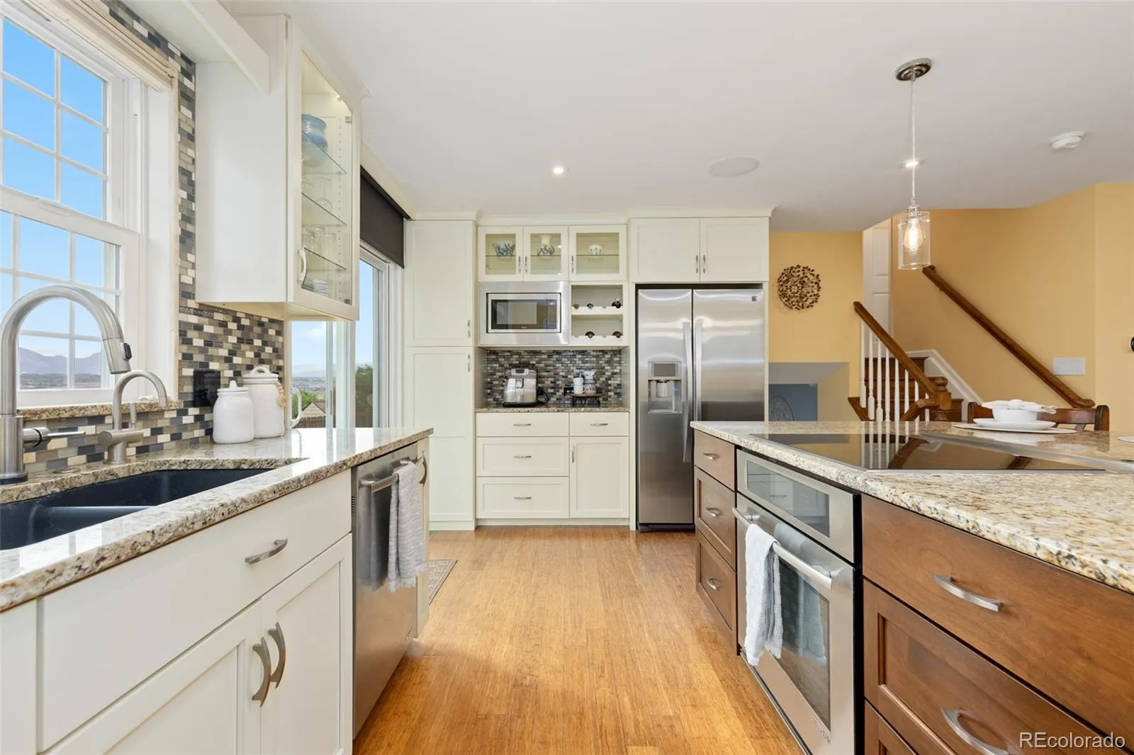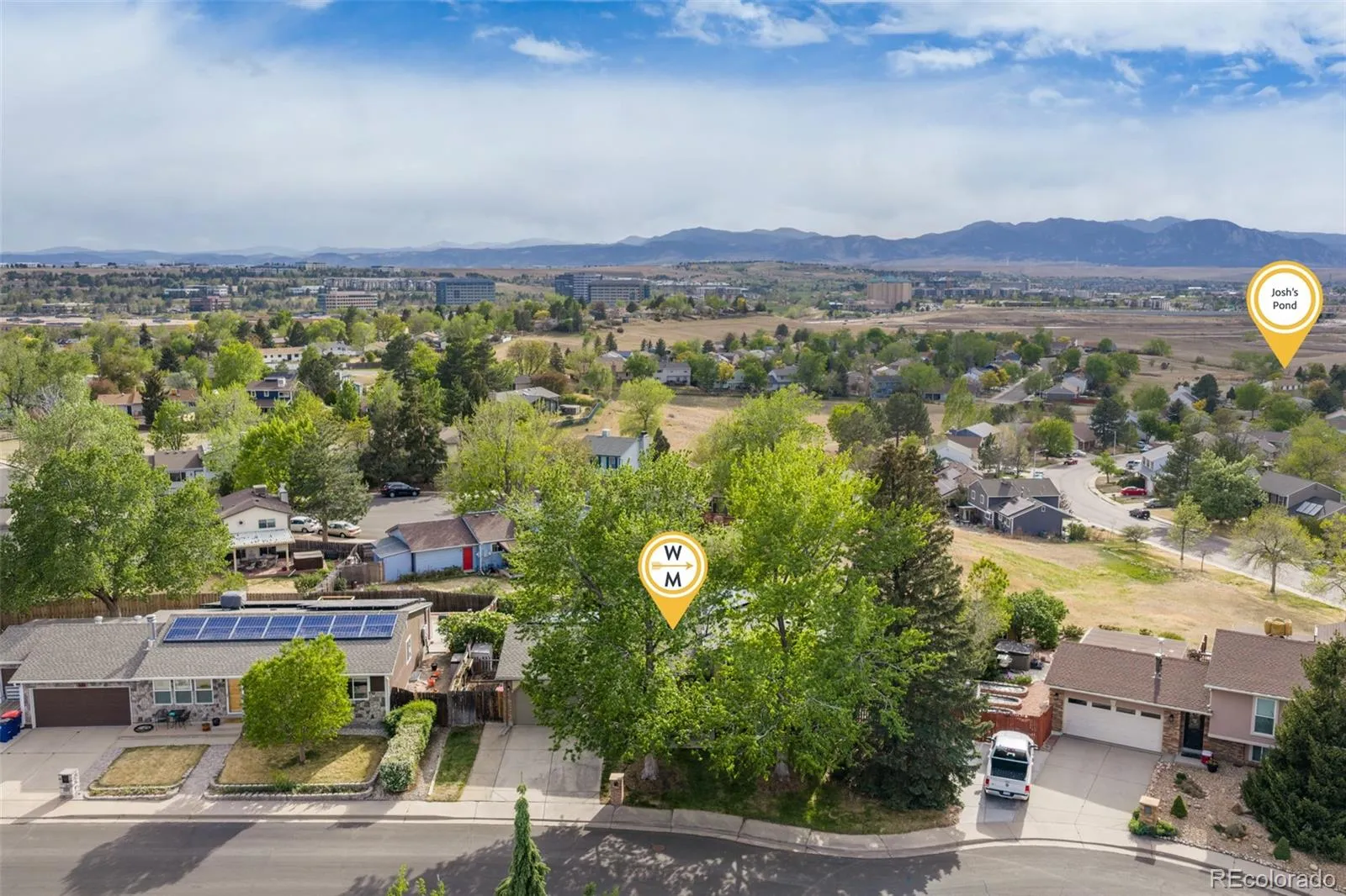Welcome to this truly one-of-a-kind home in the desirable Lac Amora with unobstructed mountain views! Thoughtfully redesigned, this home features *owned* 7.2kW solar, level 2 EV charger, smart home tech, roof (2025), upgraded plumbing, electrical, central vac + forced-air HVAC, delivering modern comfort + efficiency. From the moment you step inside, notice the meticulous craftsmanship, highlighted by bamboo wood flooring + smooth walls. The inviting front family room flows seamlessly into the fully remodeled kitchen, complete with custom cabinetry, granite counters + high-end JennAir appliances including an induction cooktop + double ovens. The oversized island provides seating for 5—perfect for entertaining or everyday living. Thoughtfully expanded mudroom to create a highly functional space with heated floors, pantry storage + convenient owner’s entry from the garage or yard. The lower level offers a spacious + cozy family room with gas fireplace + custom built-ins, along with a bright bedroom, full bath + stacked washer/dryer. An accessible crawlspace provides ample + accessible storage. Upstairs, you’ll find another bedroom with beautiful mountain views + full hall bath. Retreat to the private primary suite where a balcony showcases breathtaking mountain views. Luxurious 5-piece primary bath features dual vanities, soaking tub perfectly positioned by a window + a spa-like shower with dual independently controlled shower heads. Primary walk-in closet includes Elfa storage system + 2nd laundry area conveniently accessible from both the primary + hall. Fenced backyard offers a brick patio, garden boxes + heated greenhouse—an ideal setting for relaxing or cultivating your own garden oasis. Perfectly located with easy access to Denver, Boulder, + DIA, this home also enjoys proximity to exceptional amenities, including expansive trail systems, rec centers, playgrounds + more. This is a rare opportunity to own a home of this caliber in Broomfield with stunning views!