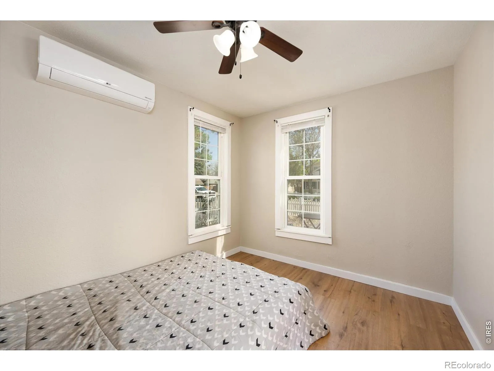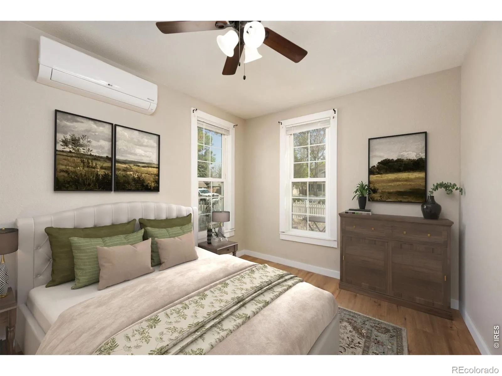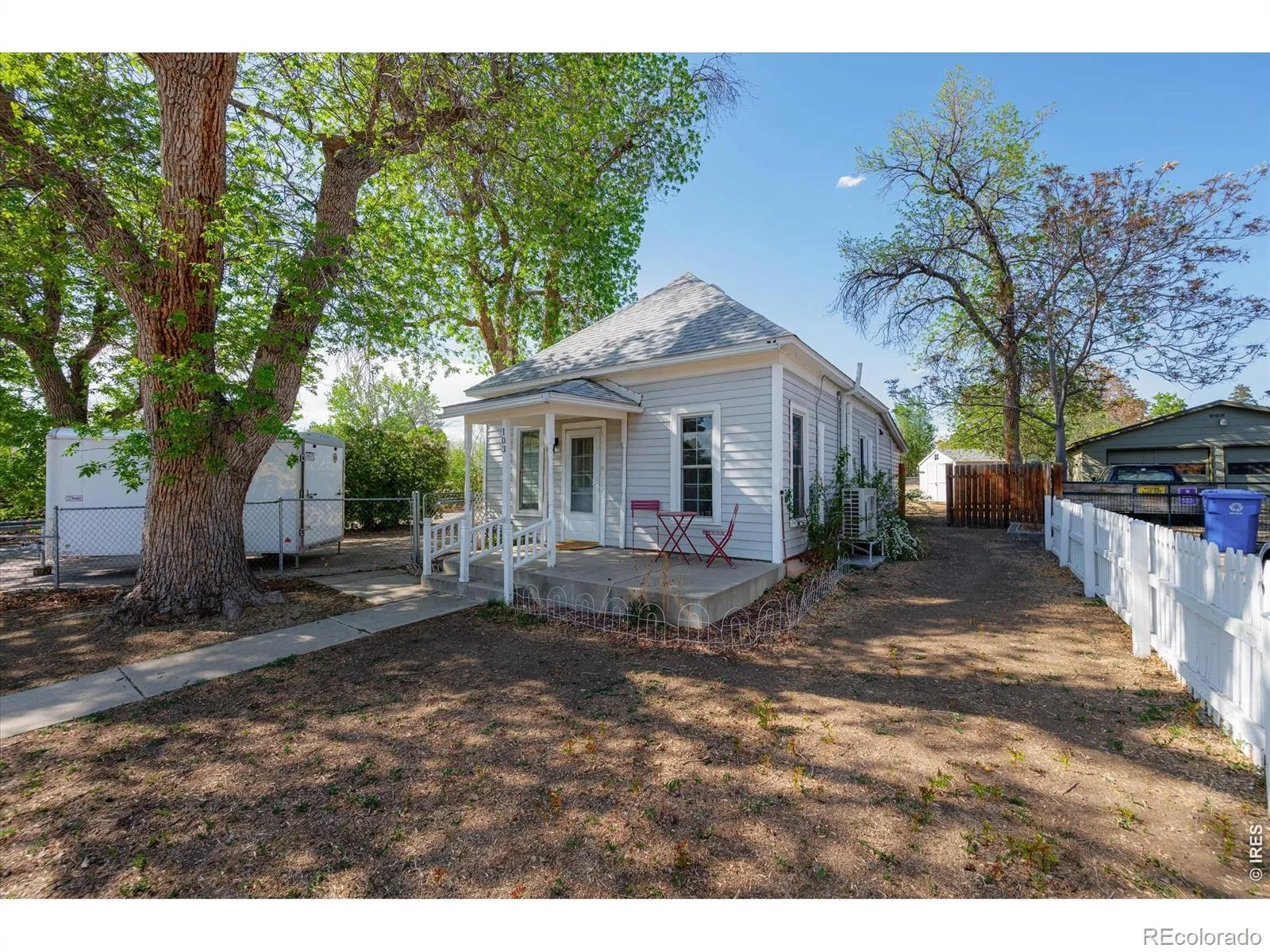 This charming turn-of-the-century cottage is tailor made for first time buyers or folks looking to downsize. The seller is offering a $10,000 concession to help with closing costs with a full priced offer. Situated on a nearly quarter acre lot shaded by mature trees in a quiet, tucked away neighborhood close to downtown, this home features a bright, open layout and loads of character! The home is approached through a cute white picket fence leading to a covered front porch. Upon entry, you are greeted with an expansive main living area featuring a large picture window that floods the home with natural light and much of the original late 19th century style trim. The large kitchen has ample counter space and is open to the expansive dining area, and features plenty of room for a coffee nook. Mini-splits installed in 2023 provide cooling and heating, and there’s also a wall-mount furnace for those really cold nights. There’s off-street parking in front and plenty of room for your toys behind the property. There is a fully fenced yard featuring a fire pit in the rear for outdoor living. About half the property is not fenced and faces Railroad Ave, making access for large vehicles easy! A pad for a future garage already exists. This well cared for home features several updates. The roof is 5 years old, the mini-splits are 3 years old, the kitchen features new butcher block countertops, a new modern stainless sink and a new dishwasher, and you will find new light fixtures, new interior paint and new flooring throughout the home. The sewer line was replaced in 2025. You won’t find more value at this price point in Loveland. Don’t miss this one-of-a-kind home!