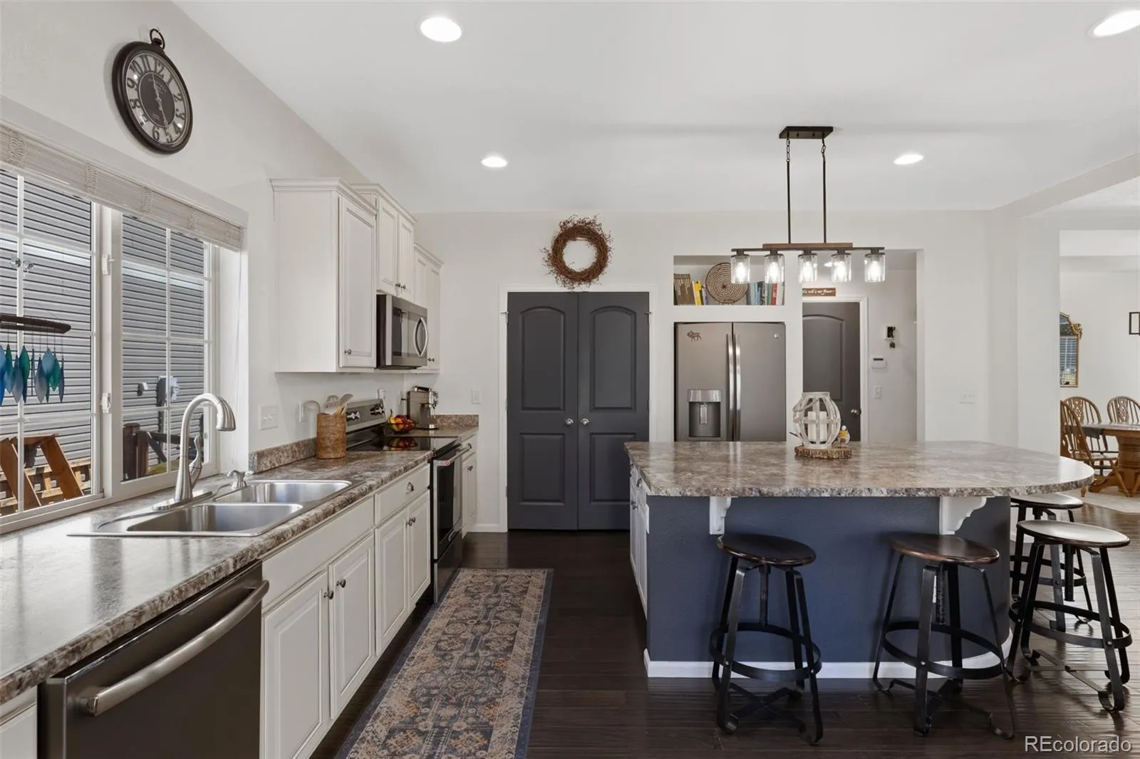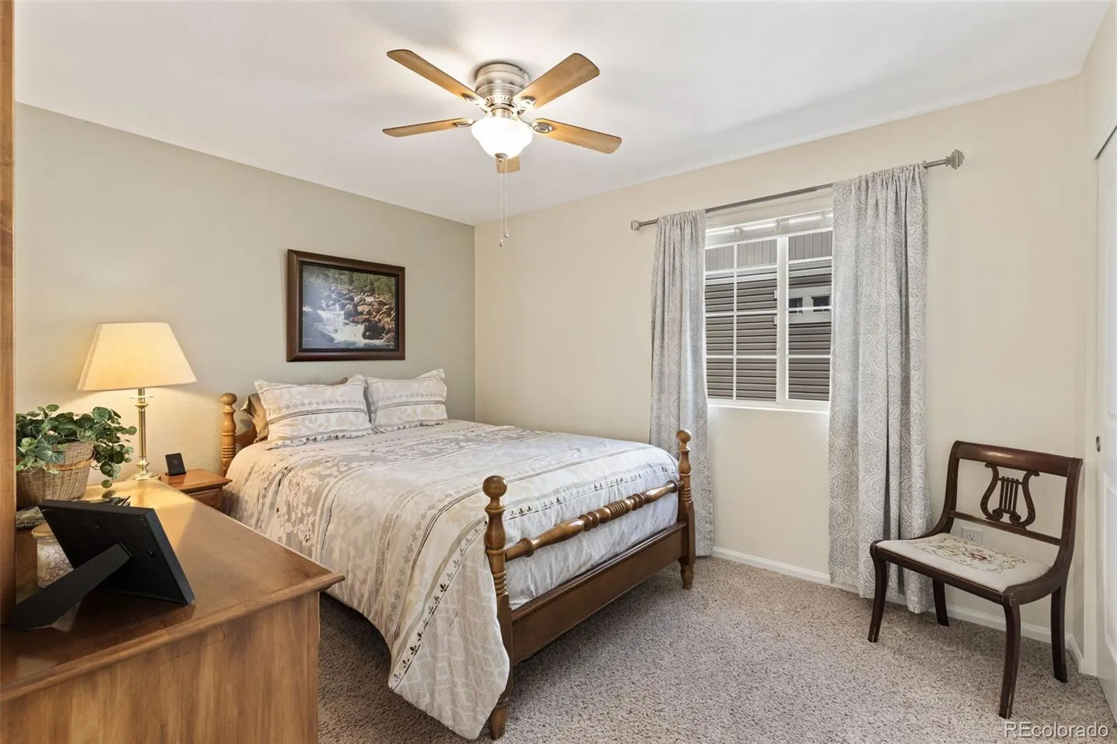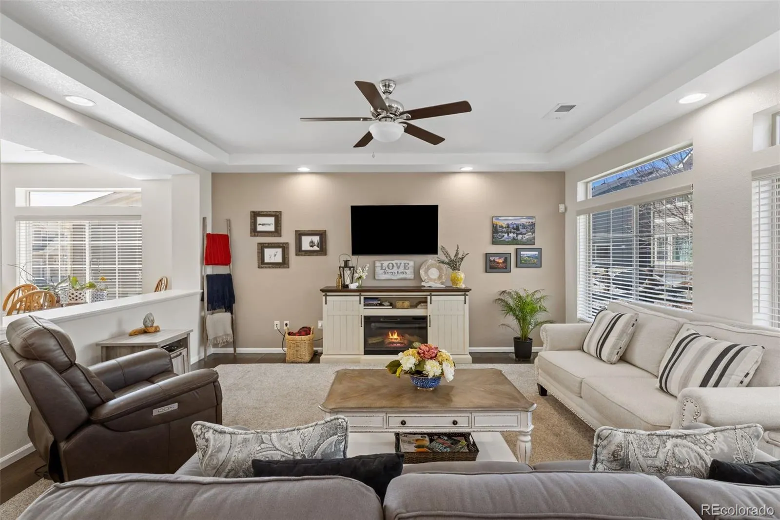 Discover this beautifully maintained, move-in ready home in Banning Lewis Ranch. Located just steps from Climbers Park, across from Cottonwood Preserve, and a short walk to the water park, gym, and Banning Lewis Academy K-5, this home combines comfort with convenience. Enjoy extra space throughout, with solid flooring on the main level. The covered front porch is perfect for relaxing and taking in the meticulously landscaped front yard. Inside, you’ll be greeted by a welcoming entryway, a private powder bath, and an open dining area that accommodates a large table. The bright family room flows into the kitchen, which features generous counter space, cabinets with pullouts, and stainless steel appliances—making it an ideal hub for cooking and gathering. Upstairs, a spacious loft offers flexibility for work or play, while a cozy nook adds more possibilities. Retreat to the primary suite complete with a double vanity and a large walk-in closet. Two additional bedrooms and a hall bath provide comfortable spaces for family or guests, and the laundry room is conveniently located on the upper floor. This home includes air conditioning and ceiling fans for added comfort. The backyard features a spacious patio with a pergola, and all rear-facing windows have a special tint for privacy and sun protection.