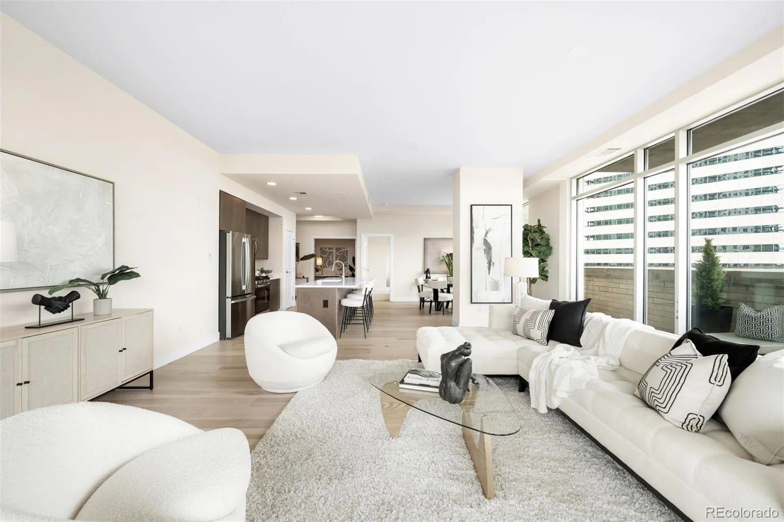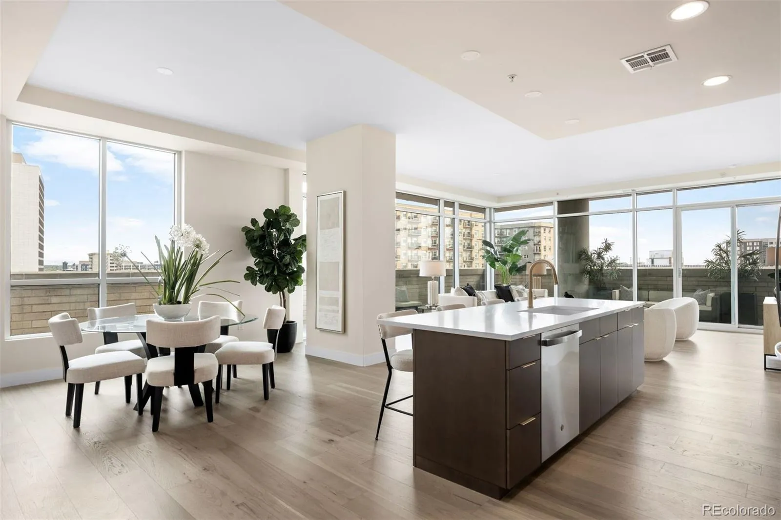 Wide-plank manufactured wood flooring enhances the light-filled living and dining areas, framed by expansive glass, and continues seamlessly into the executive office or non-conforming third bedroom for a unified flow.