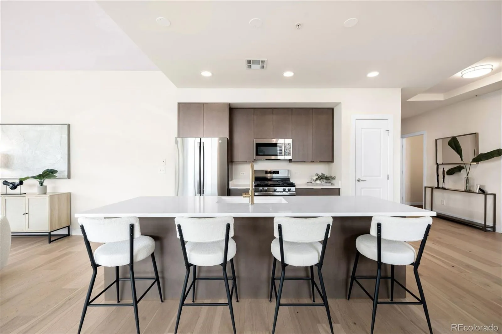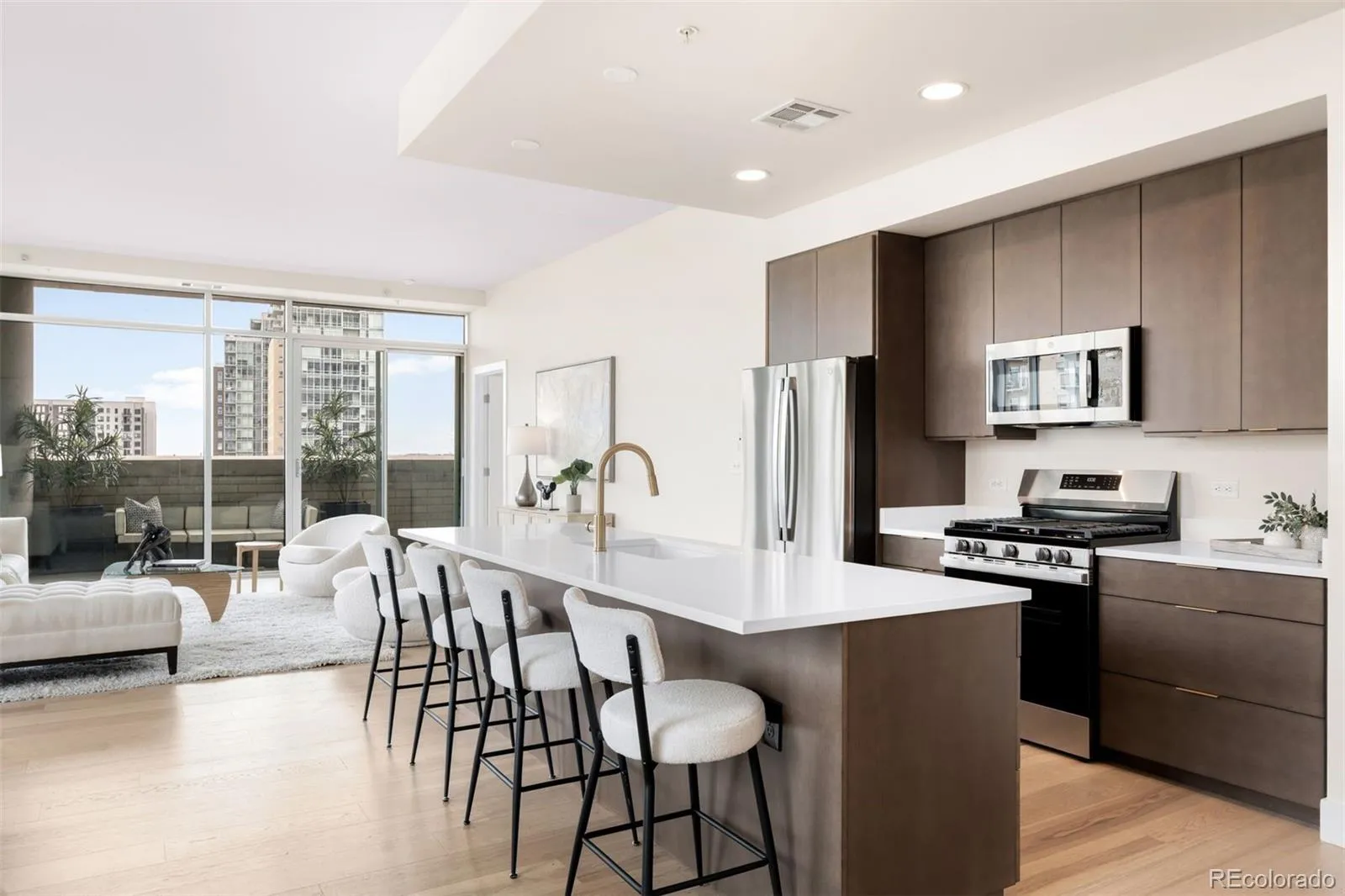 The reimagined kitchen showcases sleek, modern cabinetry with designer hardware, a softly marbled countertop and backsplash, a high-arc faucet, and all-new stainless steel appliances—creating a true centerpiece for the home.