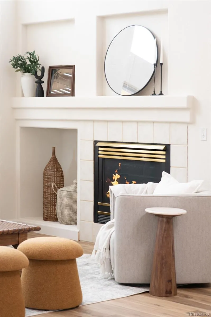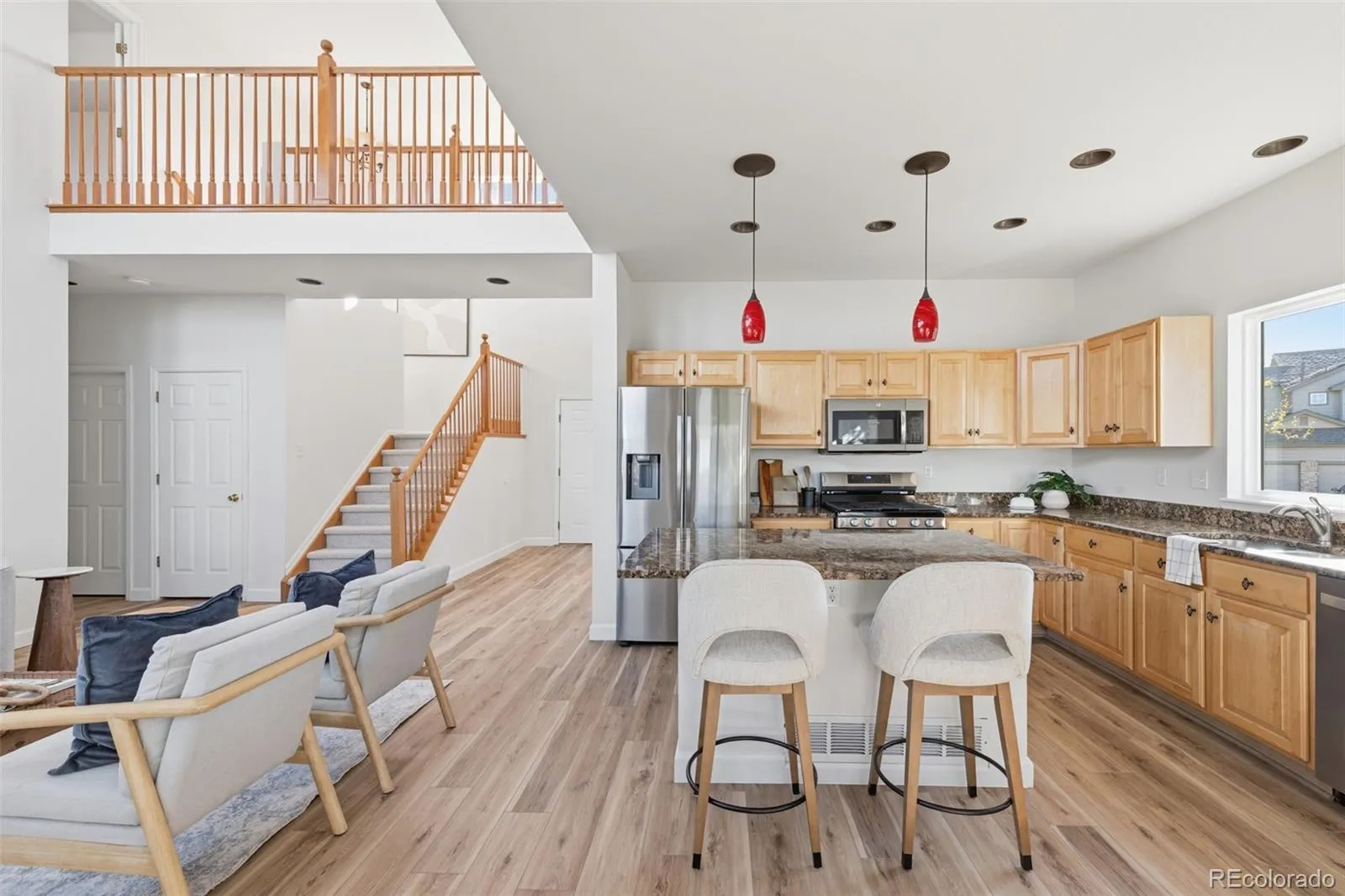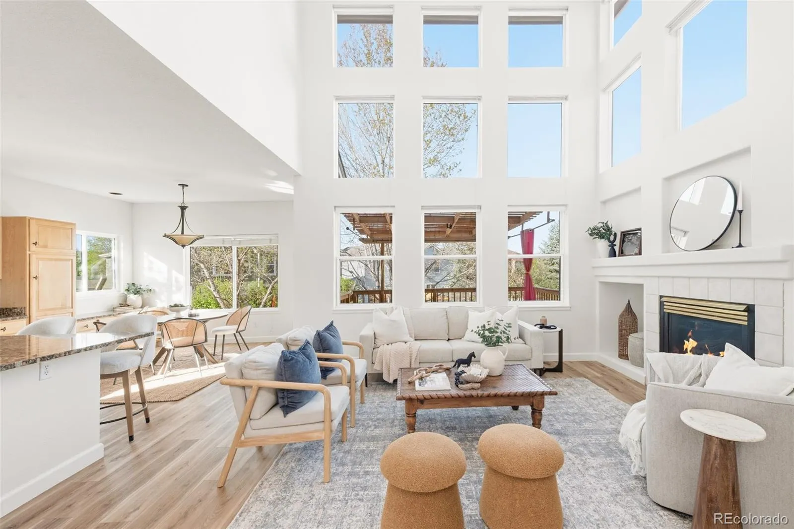 An exceptional blend of volume, light and livability defines this beautifully appointed Greenfield residence. Soaring two-story ceilings and an expansive wall of windows create a dramatic great room filled with natural light, anchored by a tiled gas fireplace. The open main level flows effortlessly into a spacious kitchen featuring granite countertops, light wood cabinetry, a center island and a bright breakfast nook with direct access to an elevated deck and pergola for seamless indoor-outdoor entertaining. Thoughtful updates include new laminate flooring on the main level (2025) and new upstairs carpeting. A dedicated home office with glass French doors and a picture window adds flexibility. Upstairs, the primary suite impresses with a wood-paneled accent wall and a five-piece bath boasting refreshed tile. A finished basement with a large rec room expands living space, while a generous backyard with a large patio and proximity to community amenities complete this luminous haven.