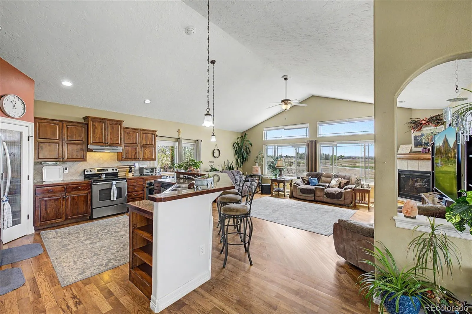 Nestled in a quiet cul-de-sac, this beautifully updated home offers stunning mountain views, a stone-accented exterior, and energy-efficient solar. Inside, vaulted ceilings, rich wood flooring, and a cozy fireplace create a warm, inviting atmosphere. The gourmet kitchen features a two-tier island, stainless steel appliances, walk-in pantry, and custom cabinetry.