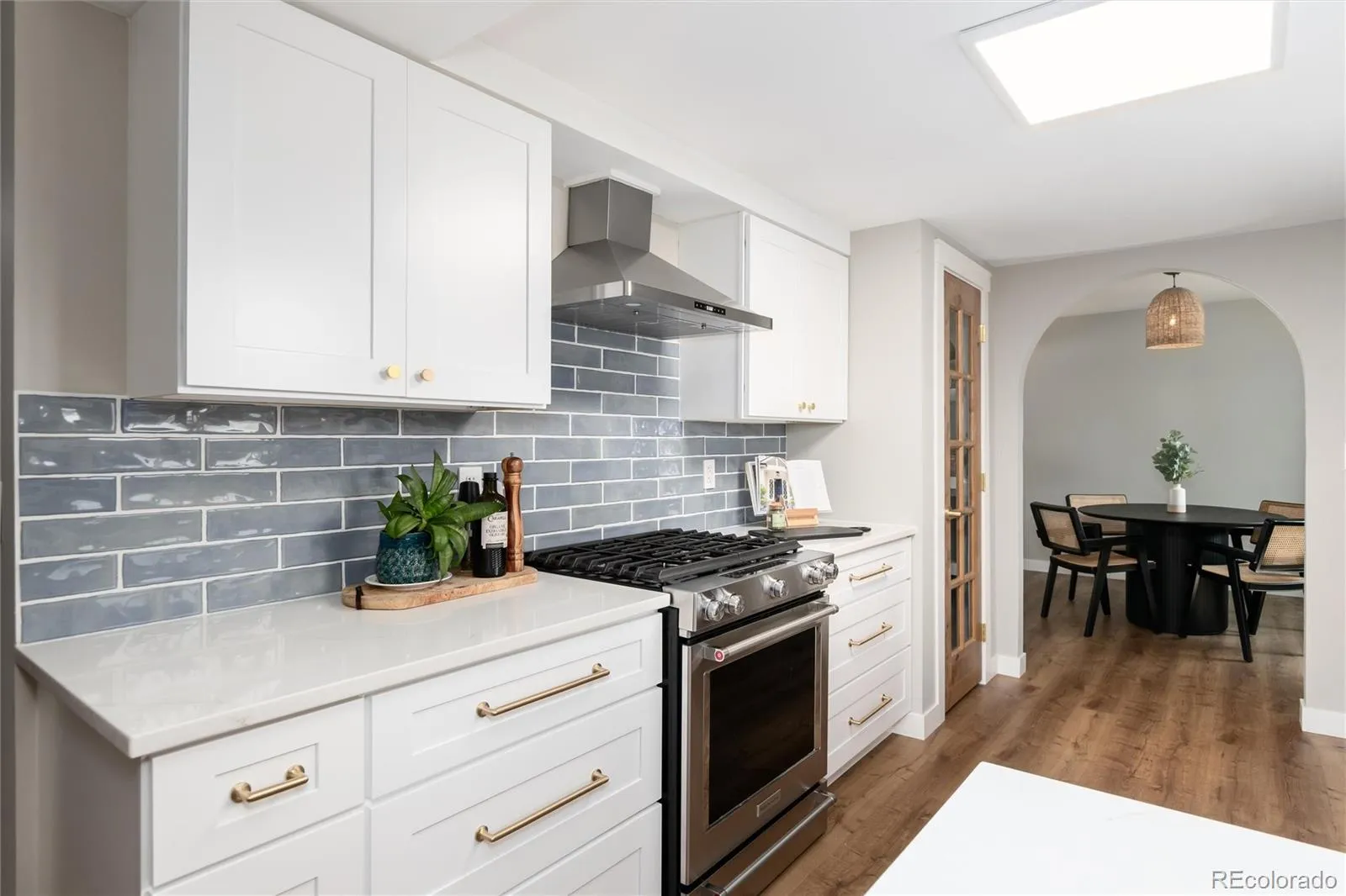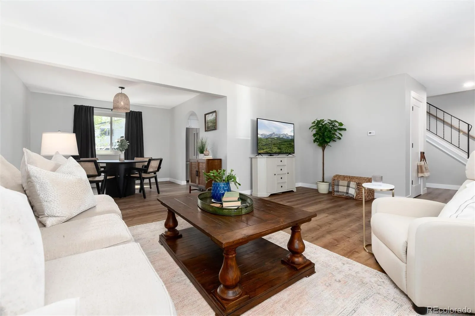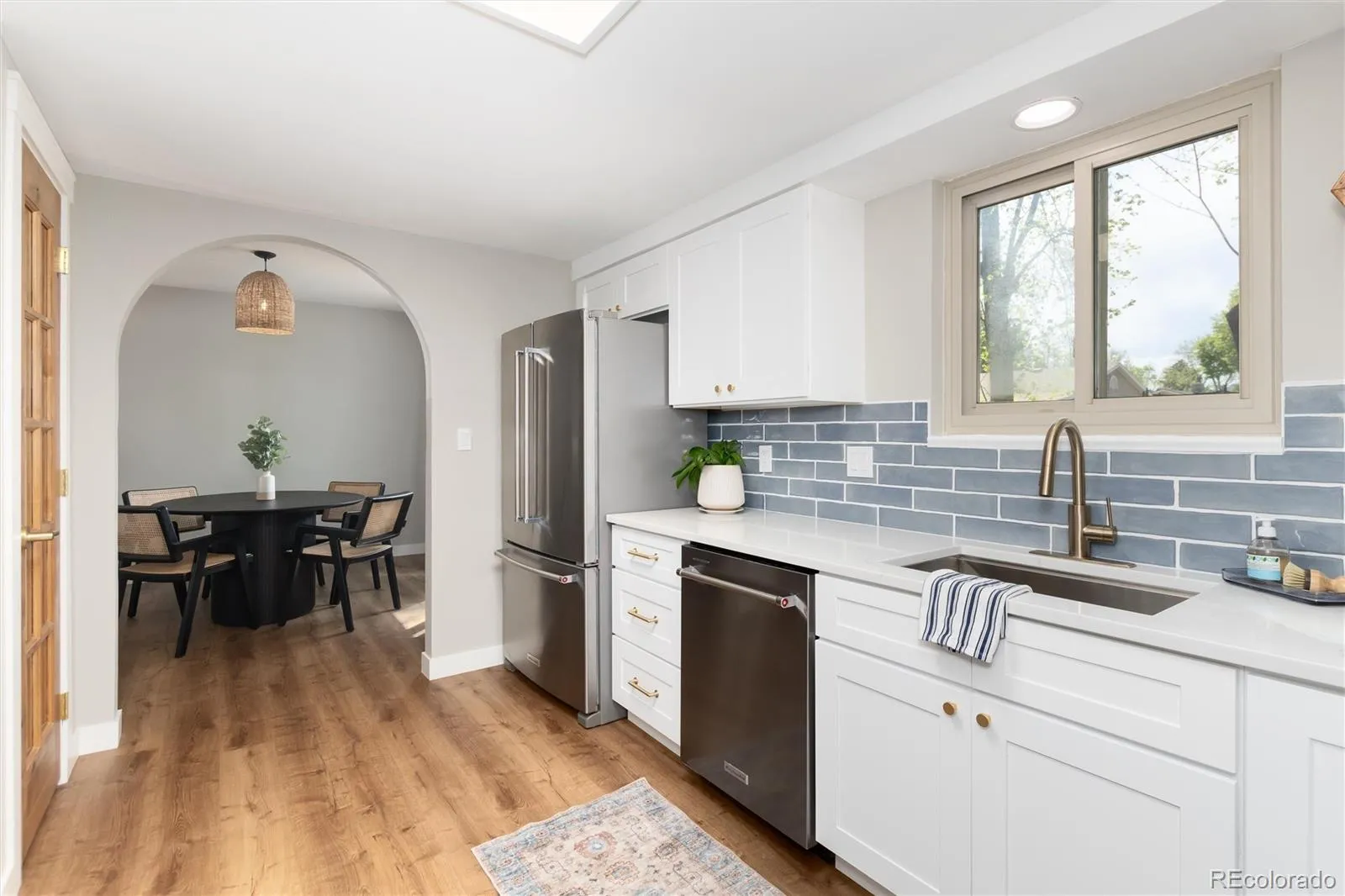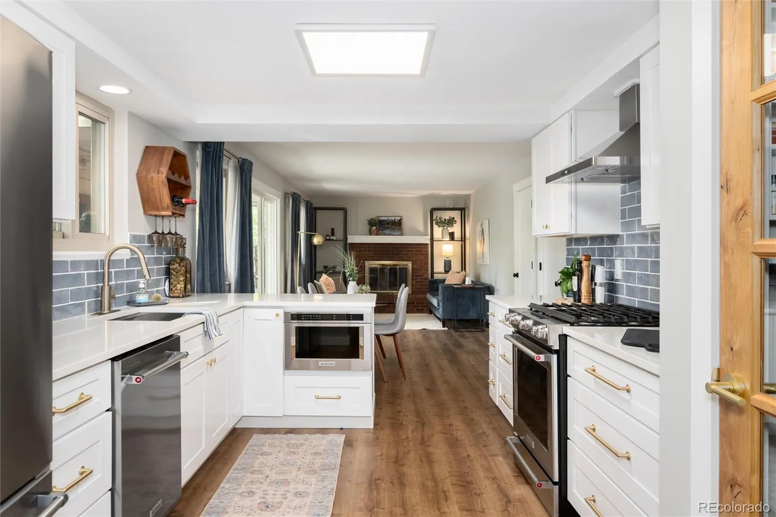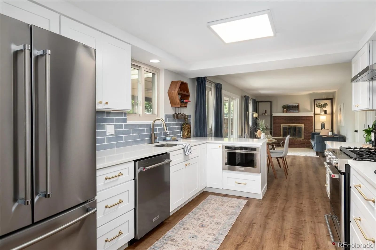 Inside, every detail has been thoughtfully curated to balance style and function. The stunning custom kitchen anchors the home, featuring quartz countertops, a new tile backsplash, all-new KitchenAid appliances, and a beautifully designed pantry that makes everyday living feel effortless. The expansive main level flows seamlessly between multiple living and dining spaces, ideal for entertaining or simply settling into the rhythm of daily life. Just off the kitchen, the covered patio offers a private, serene escape surrounded by mature trees, perfect for summer evenings. A freshly updated powder room adds the finishing touch of refinement.