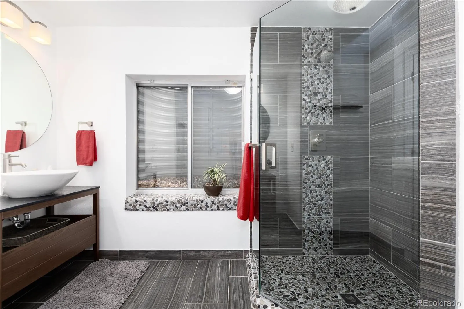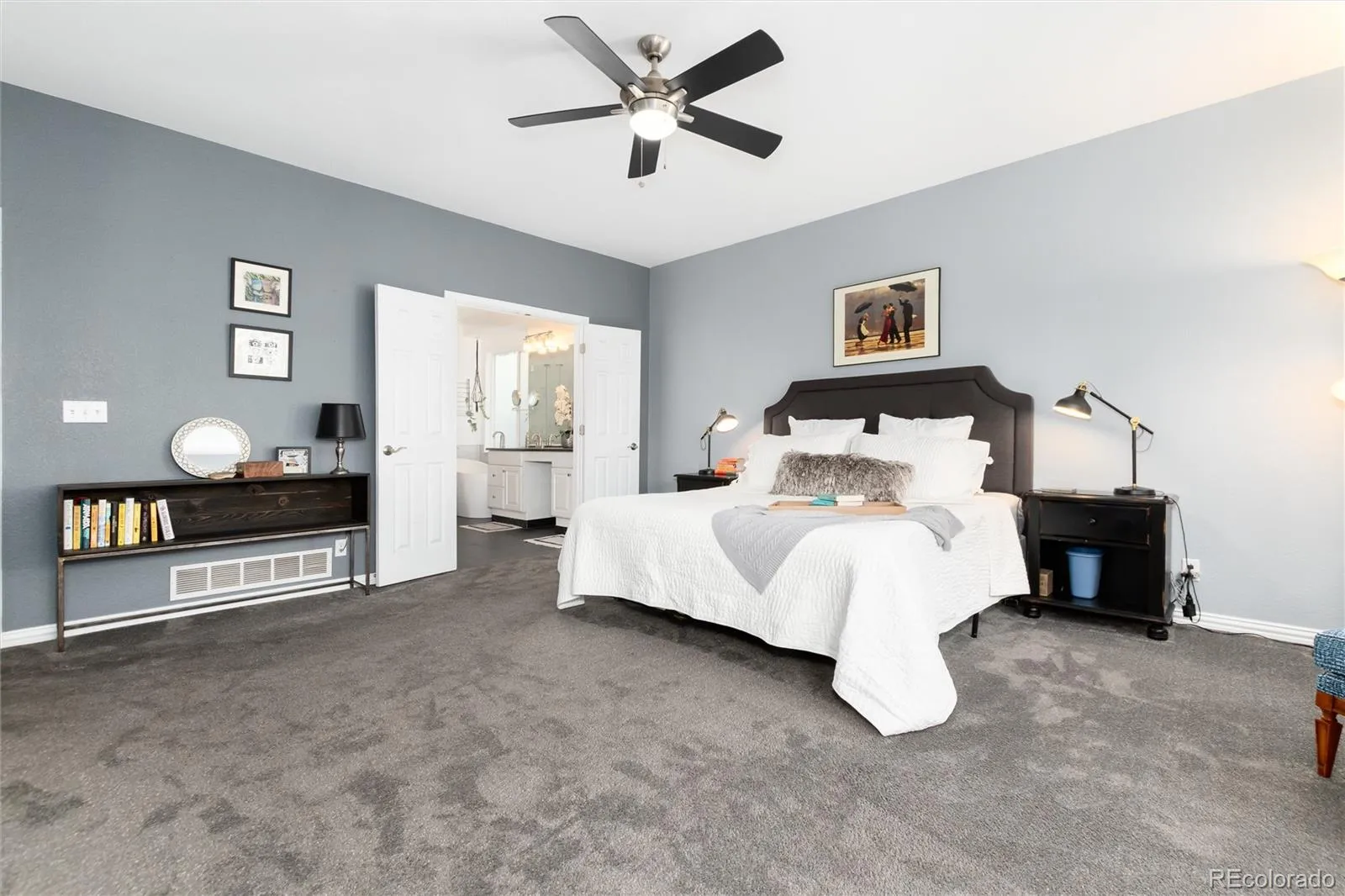The main-floor primary suite is privately positioned away from all other bedrooms. Enjoy the benefits of the fully remodeled bath with a clean, spa-inspired design.