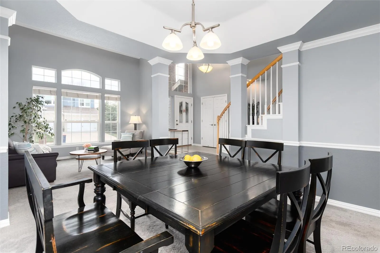 As you enter the home you are greeted with a dramatic staircase which anchors the main level, flanked by formal living and dining rooms that set an elegant tone. The family room flows naturally from this space, with soaring vaulted ceilings and a gas fireplace creating a warm, open gathering point.