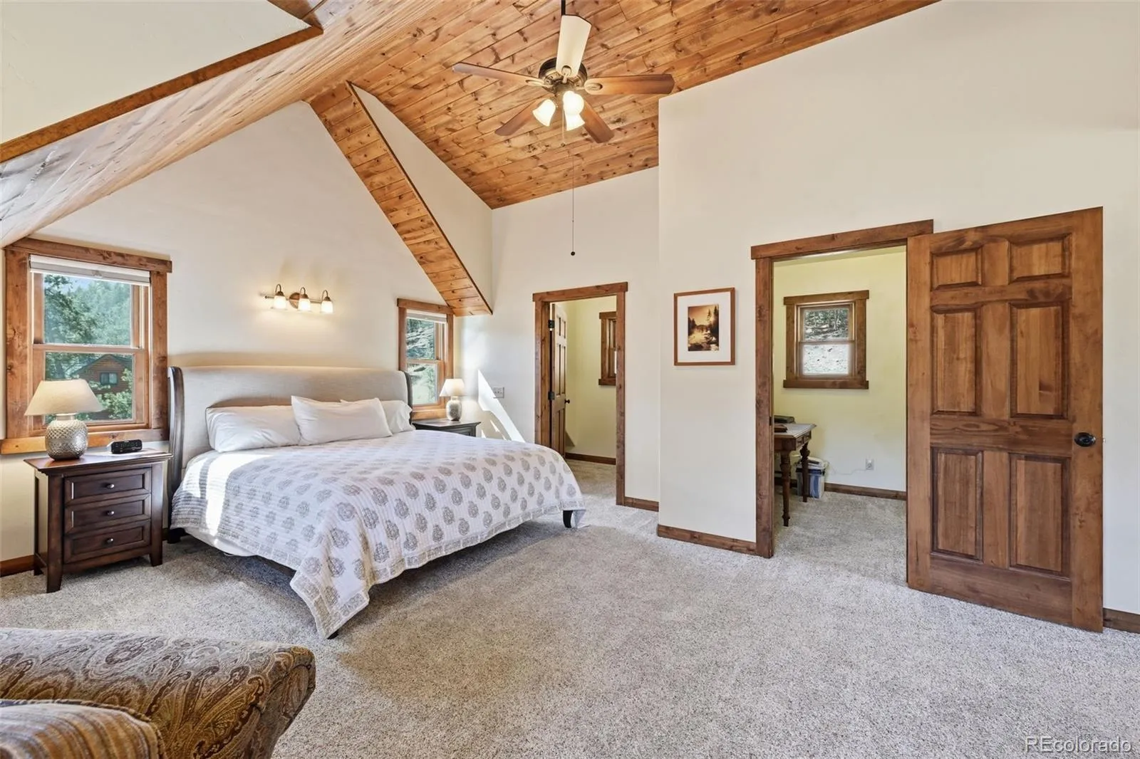 This extraordinary property offers 10.70 acres of pristine Colorado wilderness, where peaceful meadows, towering pines, striking rock outcroppings, & sweeping mountain vistas create a truly unforgettable setting. The home’s inviting wraparound covered porch sets the tone for the warmth & elegance found within. Step inside to a breathtaking interior where natural light pours through picturesque windows, illuminating the formal living room. Anchored by cozy hardwood floors & dramatic cathedral ceilings, this space is both grand & inviting, centered around a stunning stone fireplace that creates the perfect gathering place year-round. The open-concept dining area & kitchen are designed with entertaining in mind, offering seamless flow & generous seating around the central island. The kitchen is a chef’s delight, featuring upgraded appliances, abundant cabinetry, & expansive countertops, all thoughtfully designed to blend beauty with everyday functionality. Upstairs, the expansive primary retreat provides a private sanctuary. Soaring cathedral ceilings continue here, enhancing the spacious feel, while a charming seating nook invites quiet moments of relaxation. The suite includes a private¾ bath, dual walk-in closets, & a versatile bonus space ideal for a home office, personal library, hobby room, or dressing area. The newly refinished basement expands the home’s living possibilities with a large family room perfect for hosting guests, along with a garden-level bedroom complete with a cozy reading nook. This level also features a ¾ bathroom, a dedicated laundry/utility room, & 2 generous storage areas. Perfectly positioned adjacent to BLM land, this property offers unmatched access to outdoor adventure. Just across the road, a private stream stocked with rainbow & brook trout, adds to the serene, nature-rich lifestyle. This is more than a home; it’s a rare opportunity to live immersed in Colorado’s natural beauty without sacrificing comfort or elegance.
