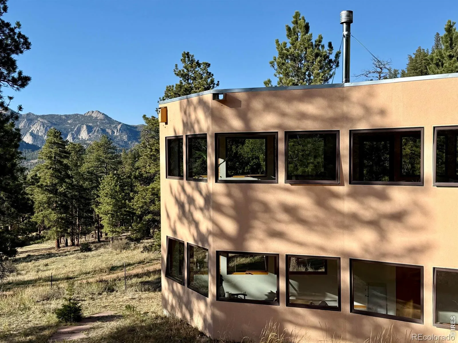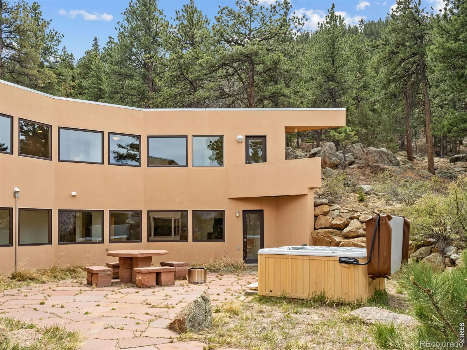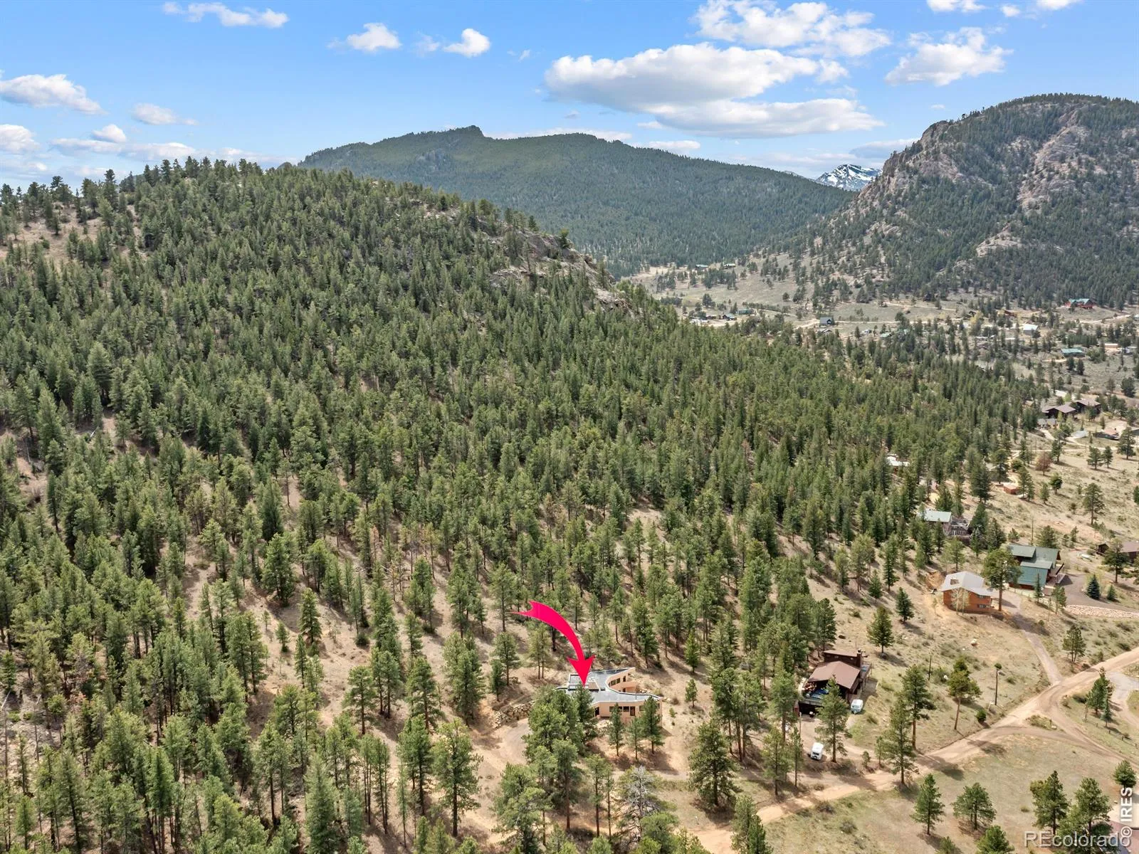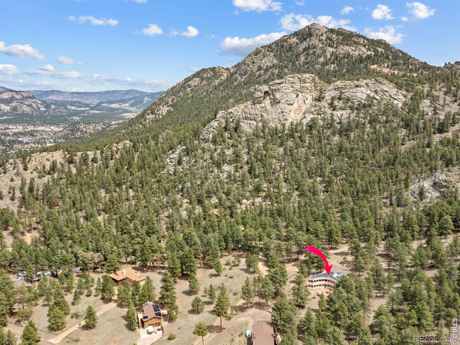 On the west side of Estes Park, 700 Spring St is anything but ordinary. This striking crescent-shaped home feels like it was sketched by an architect who refused to color inside the lines & the result is unforgettable. Perched at the end of a quiet road, the post-modern home delivers something rare: privacy, panoramic views of peaks & valley, & architecture that settles naturally into the landscape. The sweeping, curved design embraces its mountain surrounding. The concave facade wraps around a flagstone courtyard w/ a hot tub, framed by native landscaping & mountain backdrop. Inside, the design does something quietly elegant. Morning light enters along the inner curve & moves across the open interior throughout the day. Living, dining, & gathering spaces flow in a single unbroken gesture. Clean lines meet warm, livable spaces, w/ each level anchored by a double-sided gas fireplace. Red countertops & tile add a splash of color. Skylights & an unending line of windows bring the outside in, each window framing something beautiful. Lumpy Ridge fills one view, a massive lichen-covered boulder another, & the King Tut rock formation rises above it all. At night, the lights of the valley twinkle through the glass. The property backs to 8 acres of private Land Trust open space. Offering 3,334 finished sq ft across 2 levels, the home includes 2 BRs, 3 baths, a walk-in closet, main-level laundry, & a dedicated office where the mountain backdrop becomes your commute. Located in West Estes, you’re just over the hill from Rocky Mountain National Park, with easy access to hiking, wildlife, & everything that defines mountain living in Estes Park. Move-in ready where it counts. The bones & setting are exceptional, w/ room for a buyer to make cosmetic updates & add their own touch. That opportunity is reflected in the price. Quiet, privacy, & space at the end of Spring Street. This home is a conversation piece, a sanctuary, & a rare opportunity to own something truly unique.