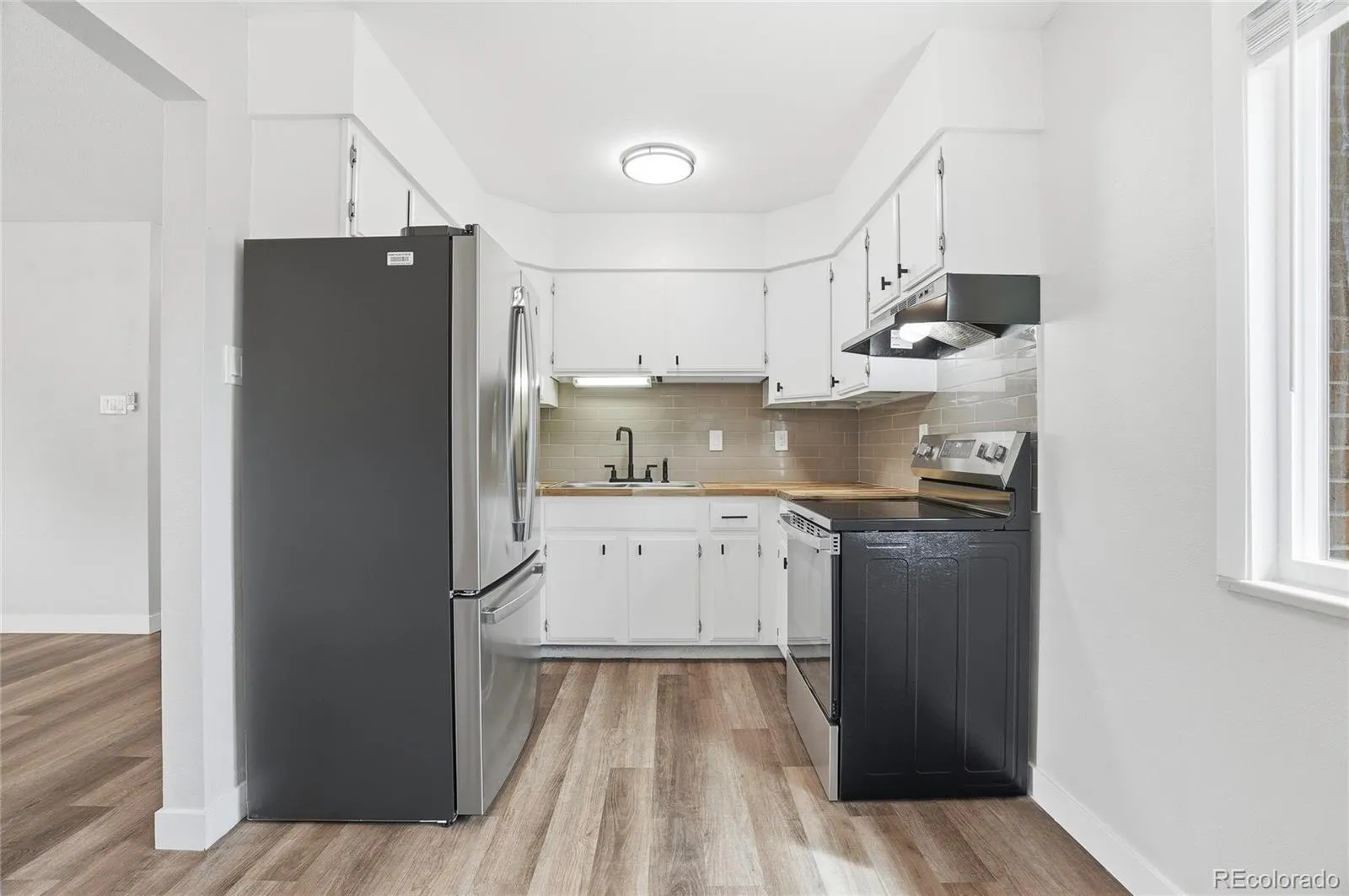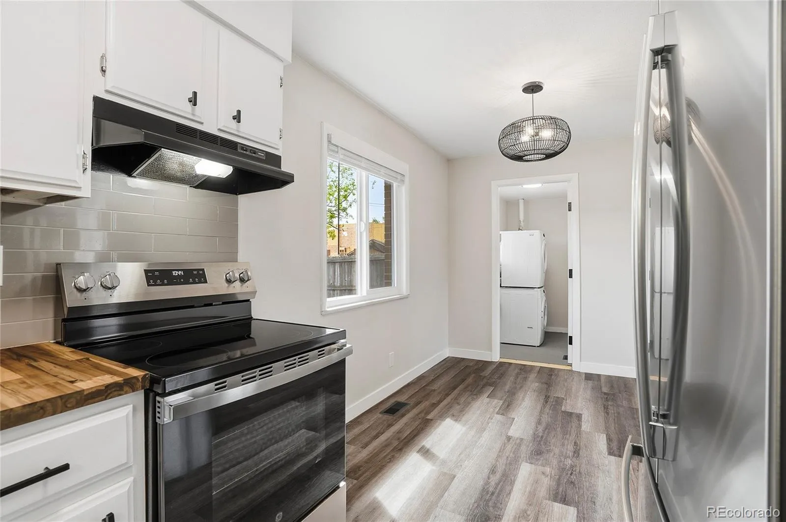 Inside, durable laminate flooring runs throughout, complemented by updated lighting that creates a clean, contemporary feel. The kitchen is both stylish and functional, featuring butcher block countertops, a classic subway tile backsplash, and brand new appliances, including a refrigerator and stove—ready for daily living from day one.