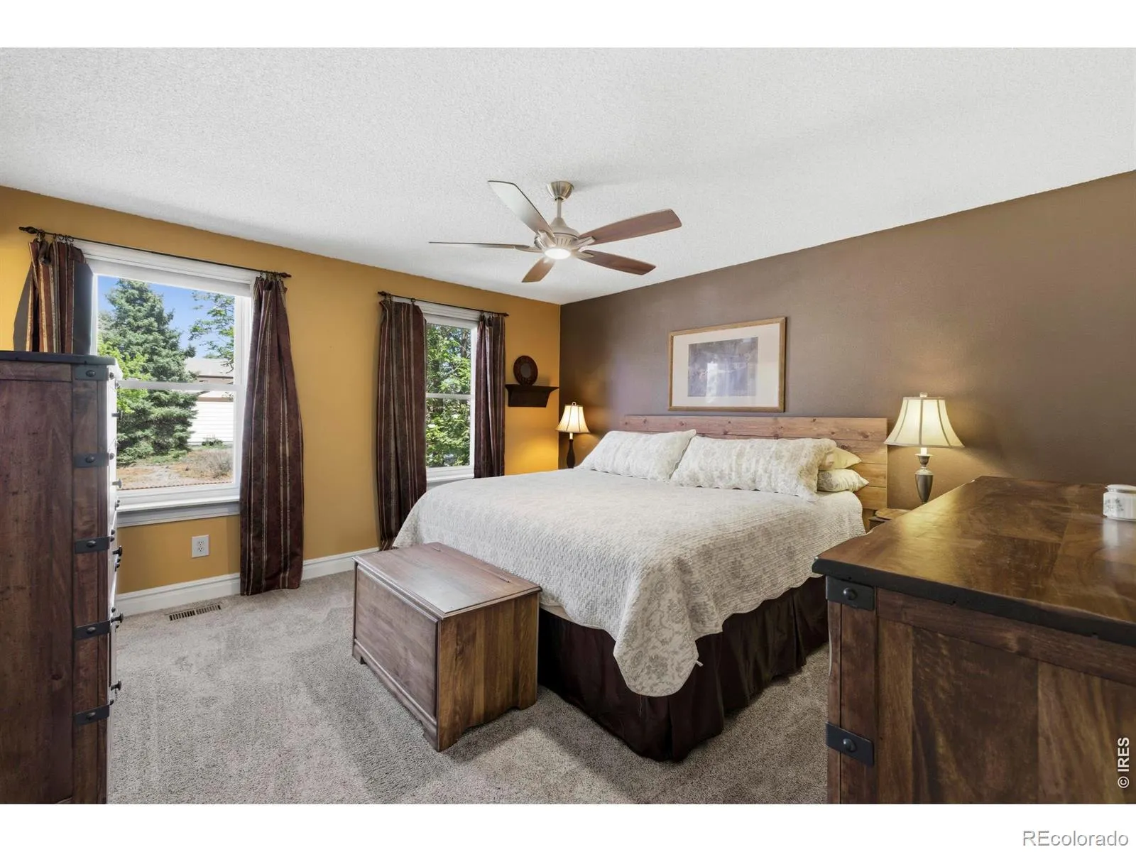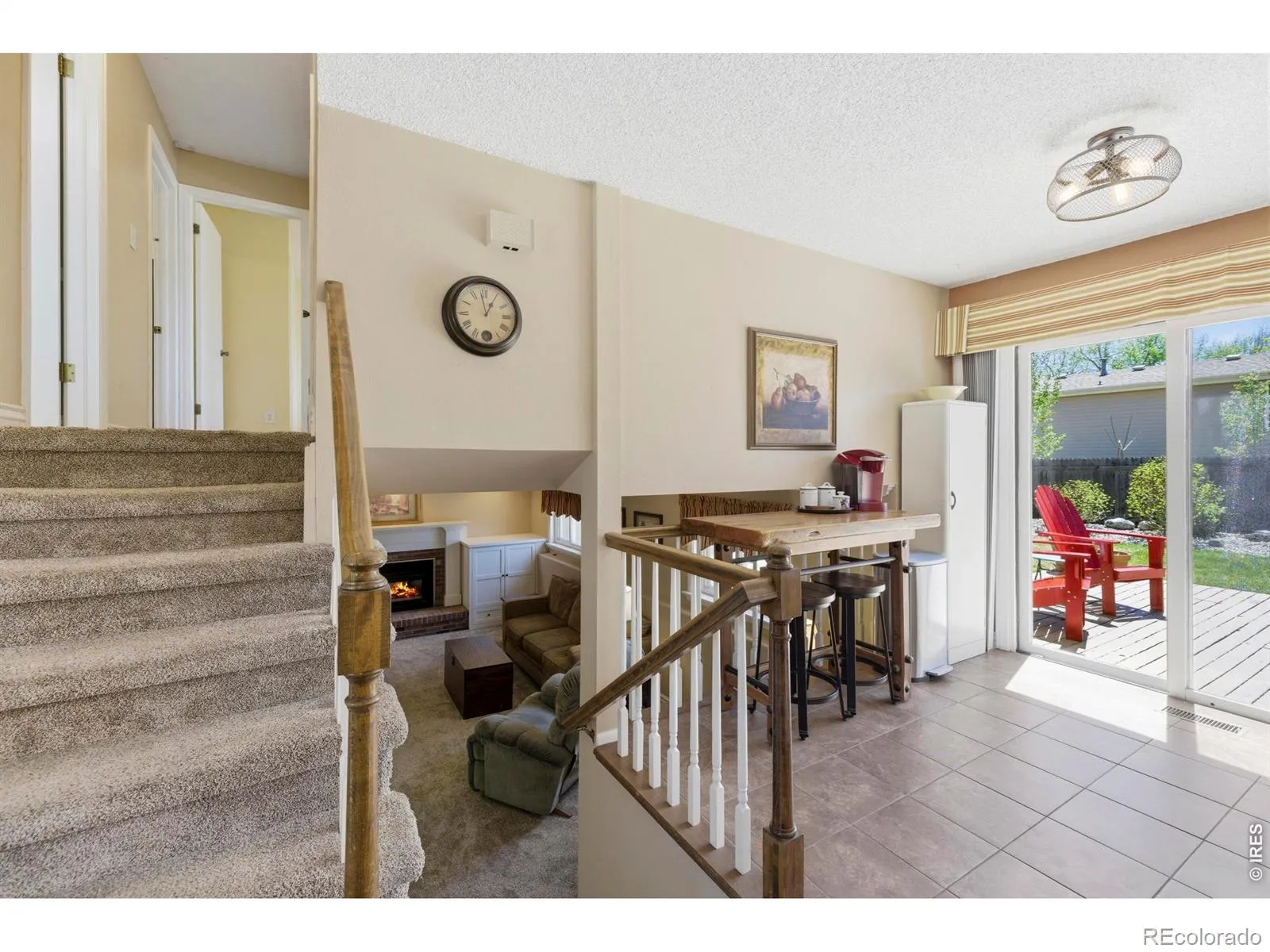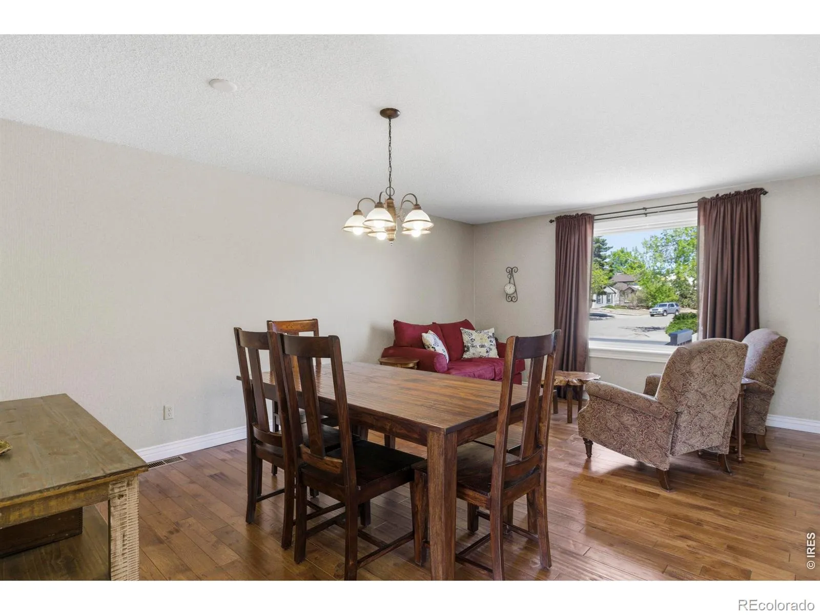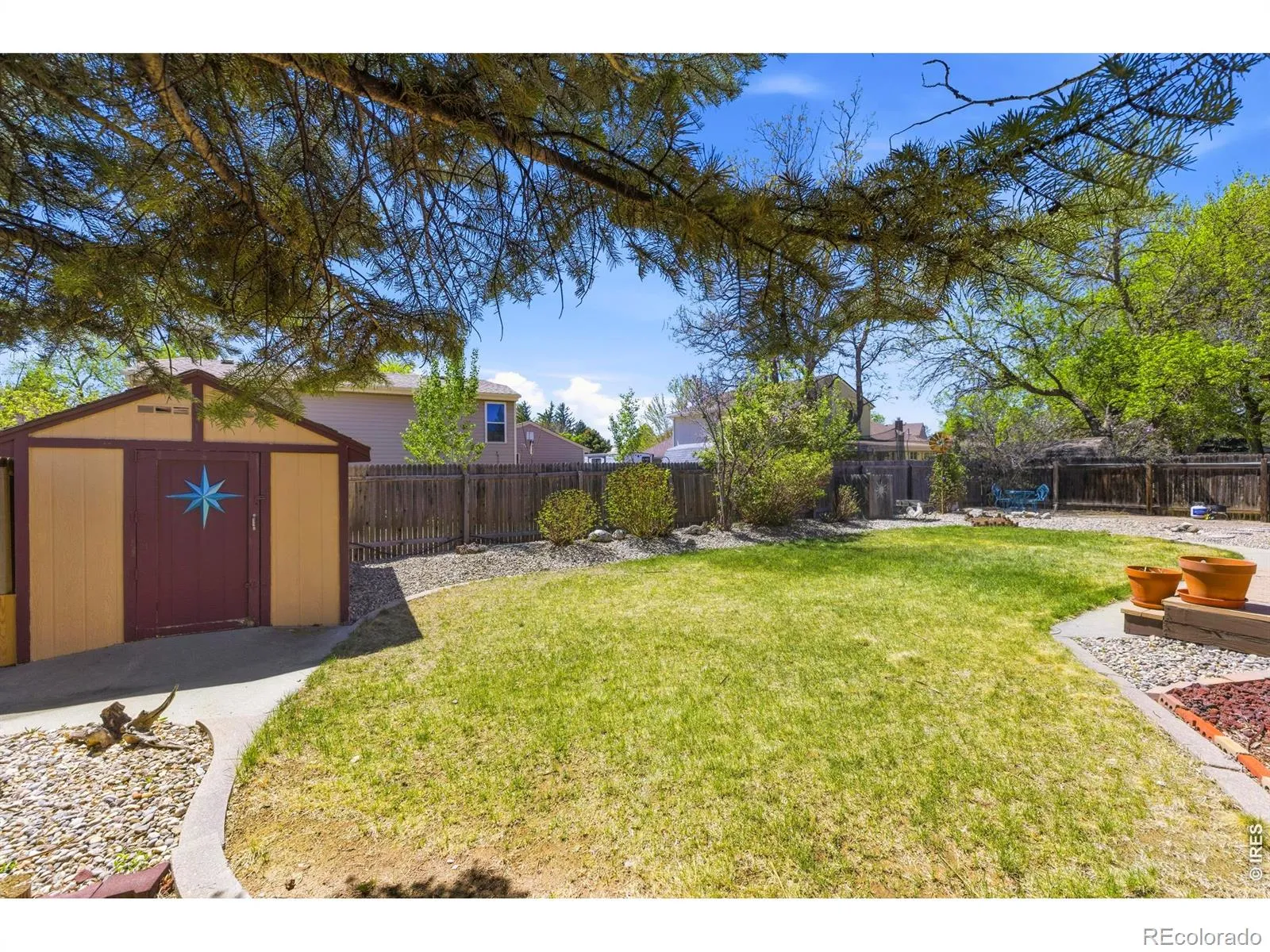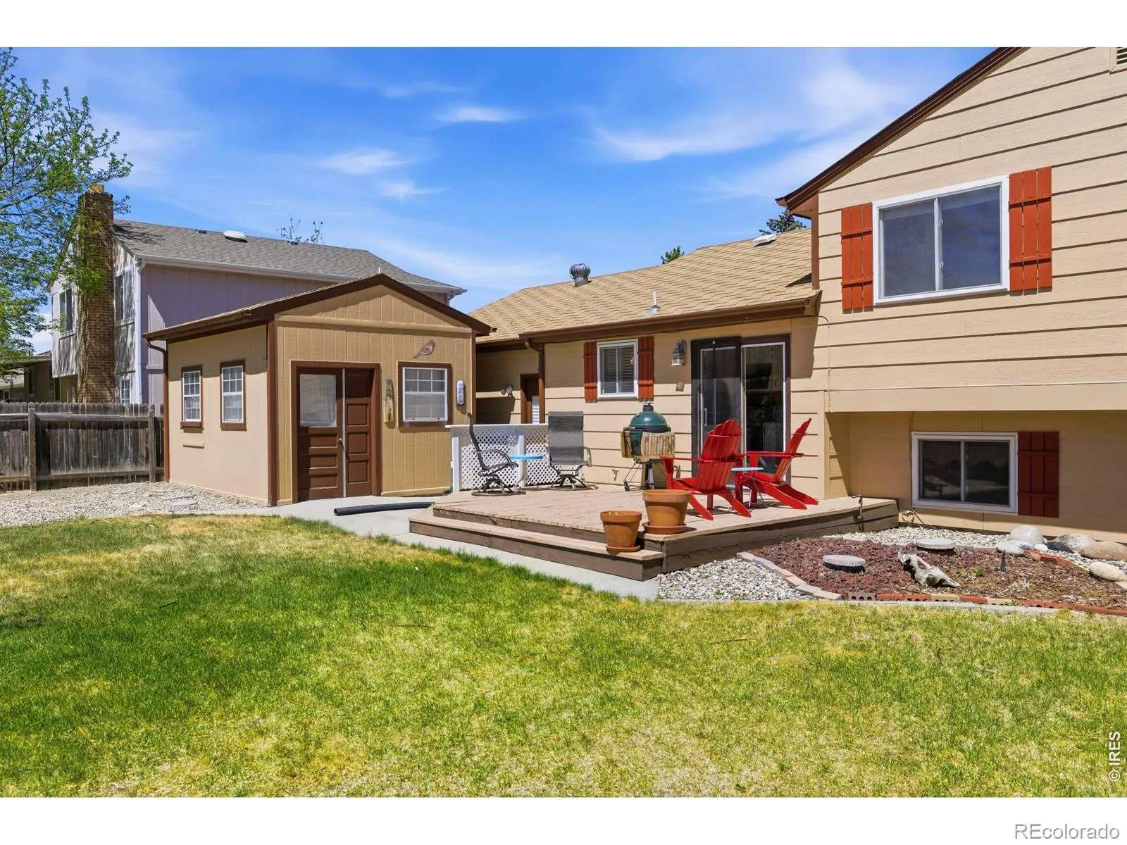 Character meets comfort in this well-maintained tri-level tucked in Loveland. Hand-scraped hickory floors throughout the main level add a level of warmth. The updated kitchen (2020) features new countertops, painted cabinets with fresh hardware, and updated lighting. Newer carpet throughout (2023) with upgraded pad adds comfort. Upstairs, the primary bedroom includes a private 3/4 bath, two additional bedrooms and a full bath. Head downstairs to a cozy family room with built-ins, the perfect spot to relax, along with a 4th bedroom, laundry, and half bath. Outside, it includes a large deck for entertaining. The backyard also includes a dedicated ancillary office space, a storage shed, and a full irrigation system with drip lines for the garden beds. The exterior was freshly painted in 2021, and the attached 2-car garage rounds out everything you need. 1-year First American Home Warranty also included.