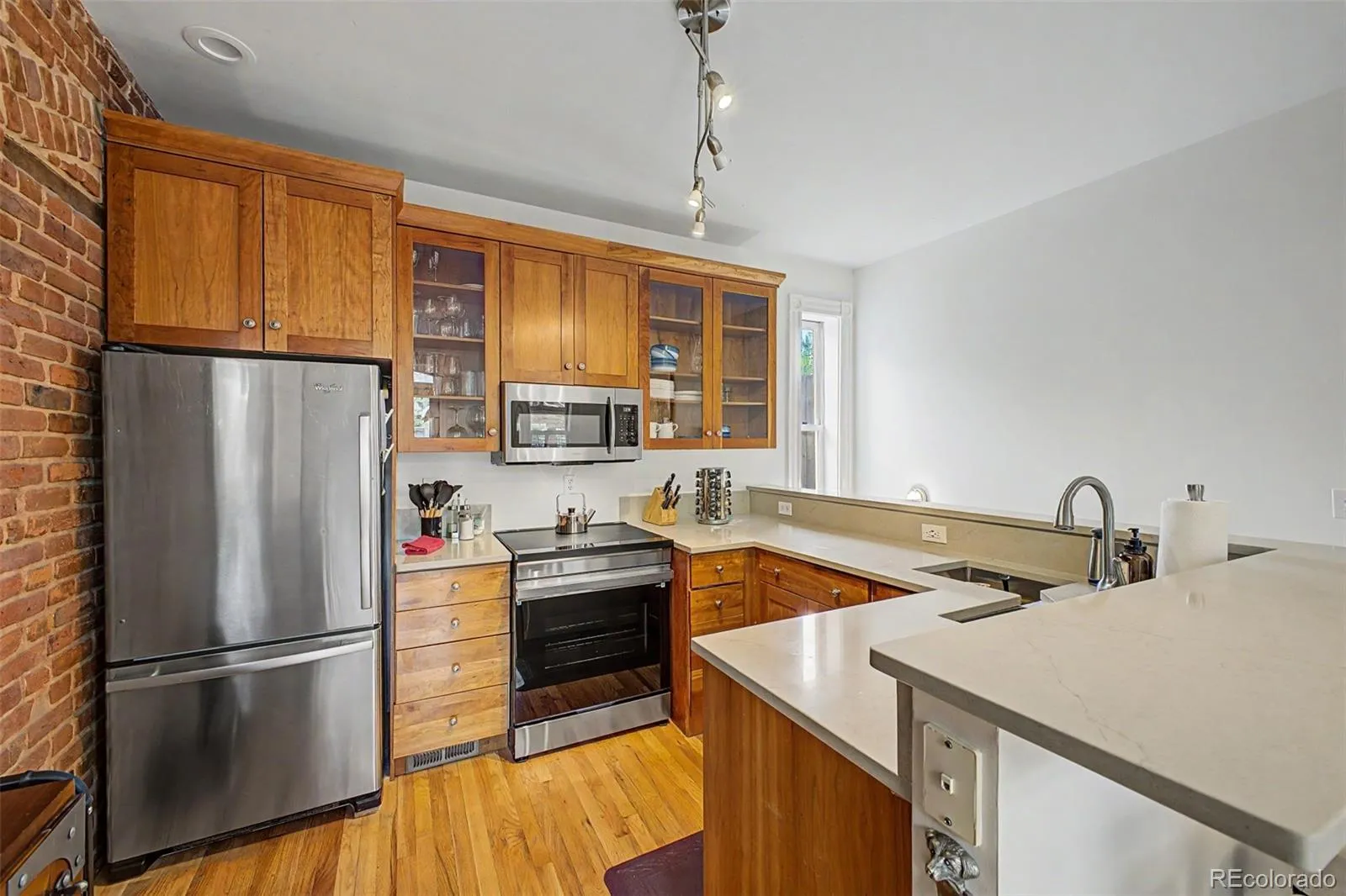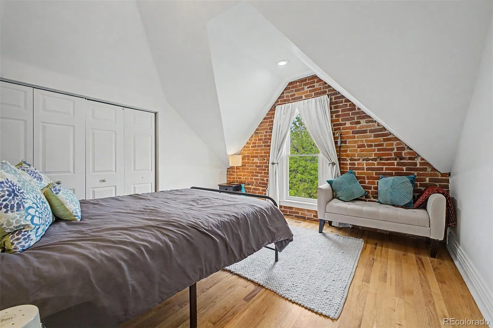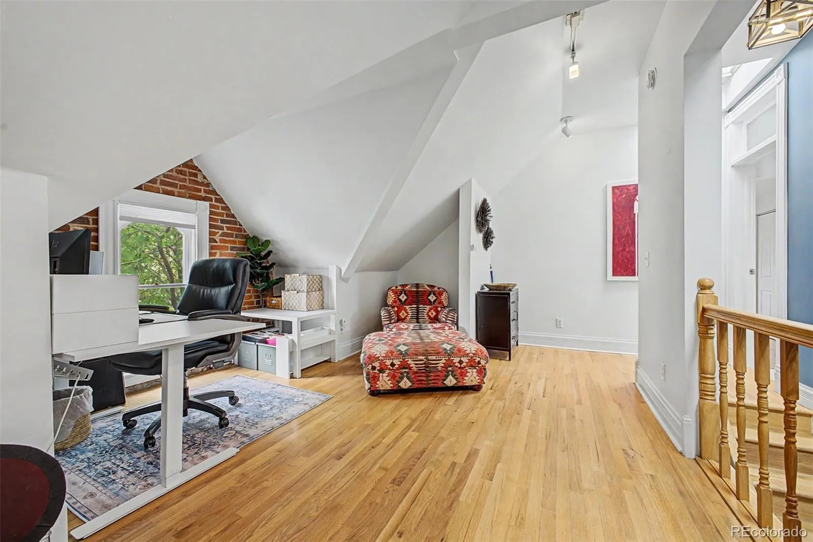 Light pours through south-facing windows, stretching across hardwood floors & catching the texture of exposed brick. The ceilings rise above it all, adding volume you don’t expect, making the space feel open, calm & easy to settle into.