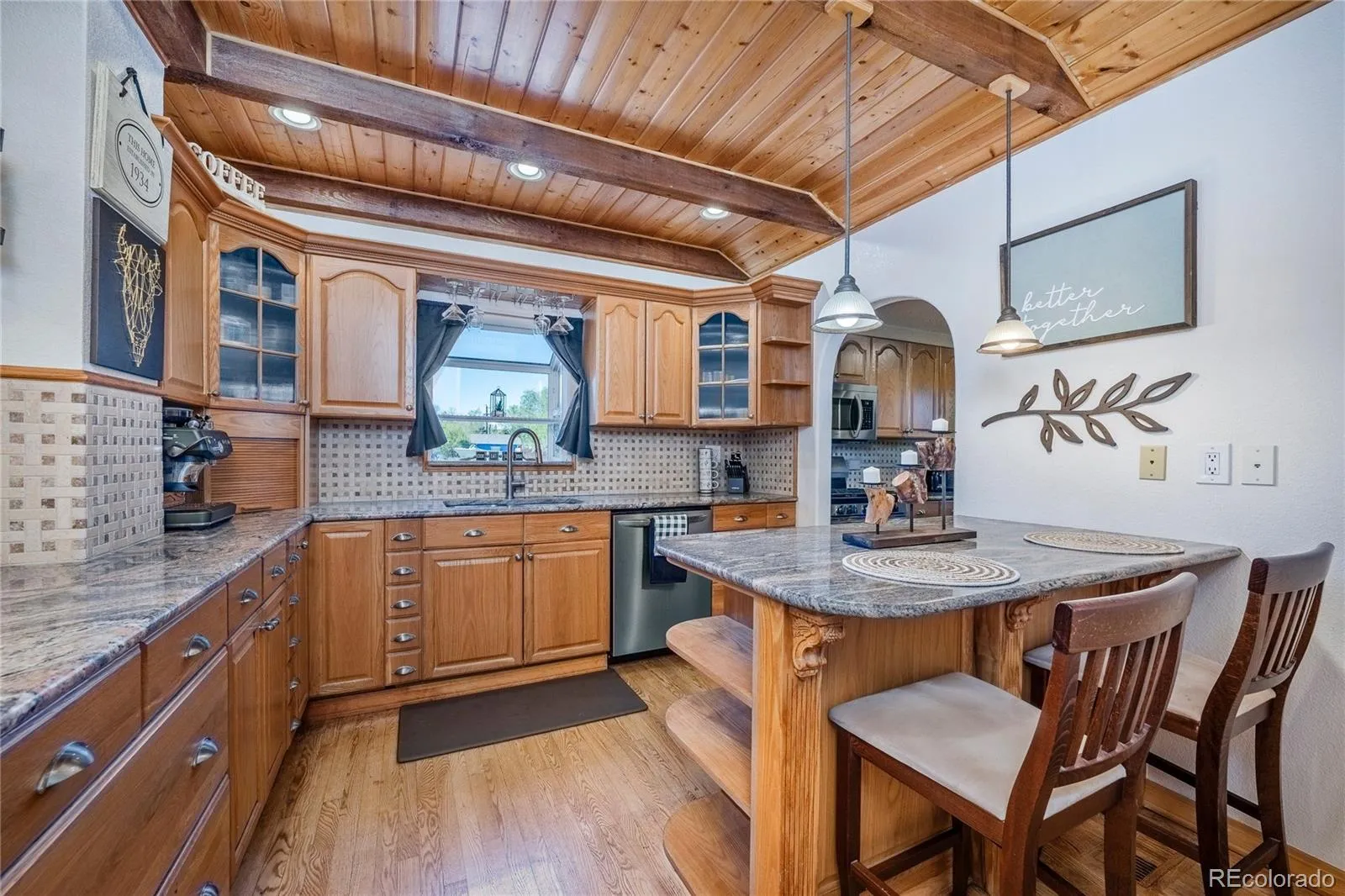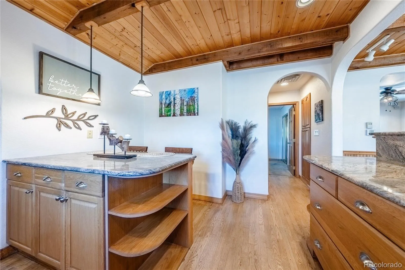 Step inside to find warm character throughout, including rounded arched thresholds, beautiful wood shiplap accents, and stunning tongue-and-groove ceilings in the dining and kitchen areas. Natural light fills the home, highlighting the spacious living room and large dining area, perfect for gathering and entertaining. The kitchen is both functional and inviting, featuring stone countertops, stainless steel appliances, a gas range, ample cabinetry, bar seating, and an island with additional seating.
