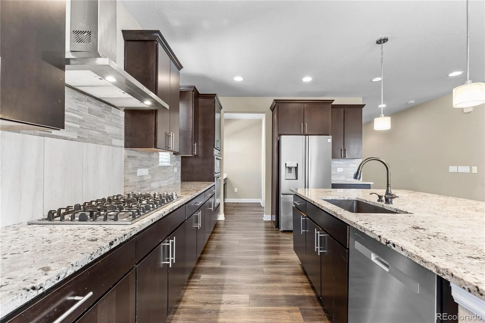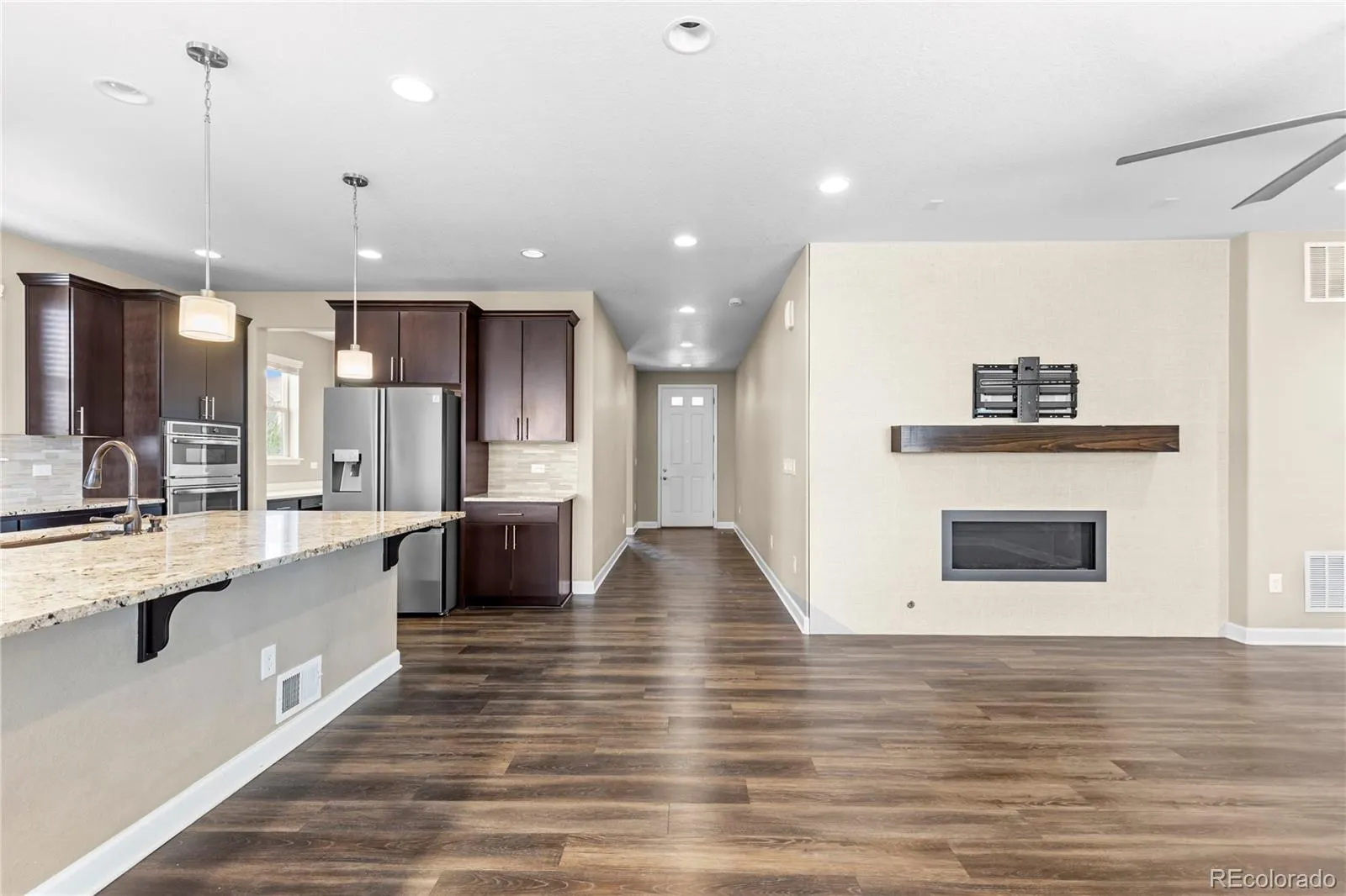 Right when you walk in, it just feels right. The main-level bedroom and full bath give you flexibility for guests, multigenerational living, or that perfect private office setup. Then you hit the kitchen—and this is where it gets dangerous. Gas range, double wall ovens, an oversized walk-in pantry… this isn’t a “nice kitchen,” this is a host everything kitchen. It flows seamlessly into the dining area and living space, anchored by a modern gas fireplace that actually makes the room feel finished.