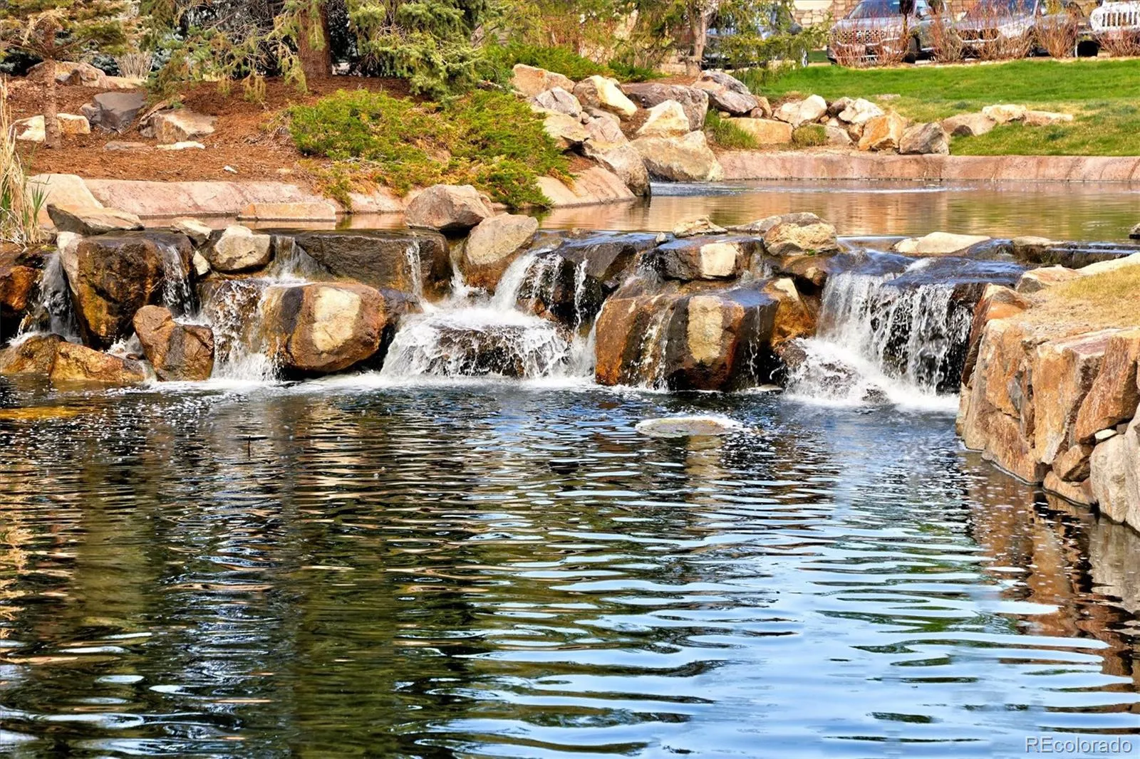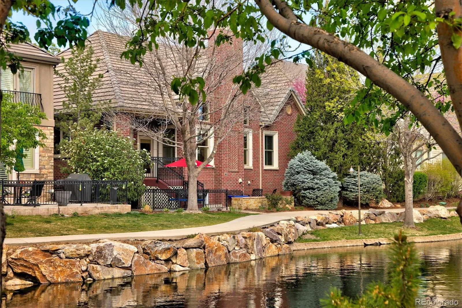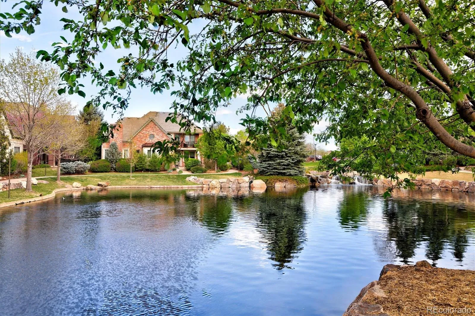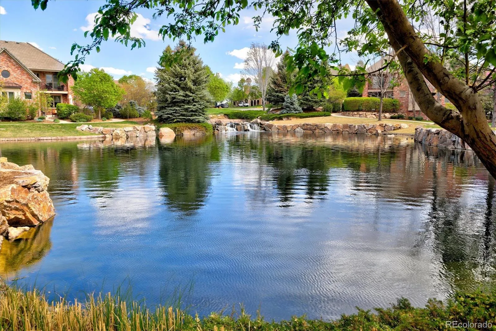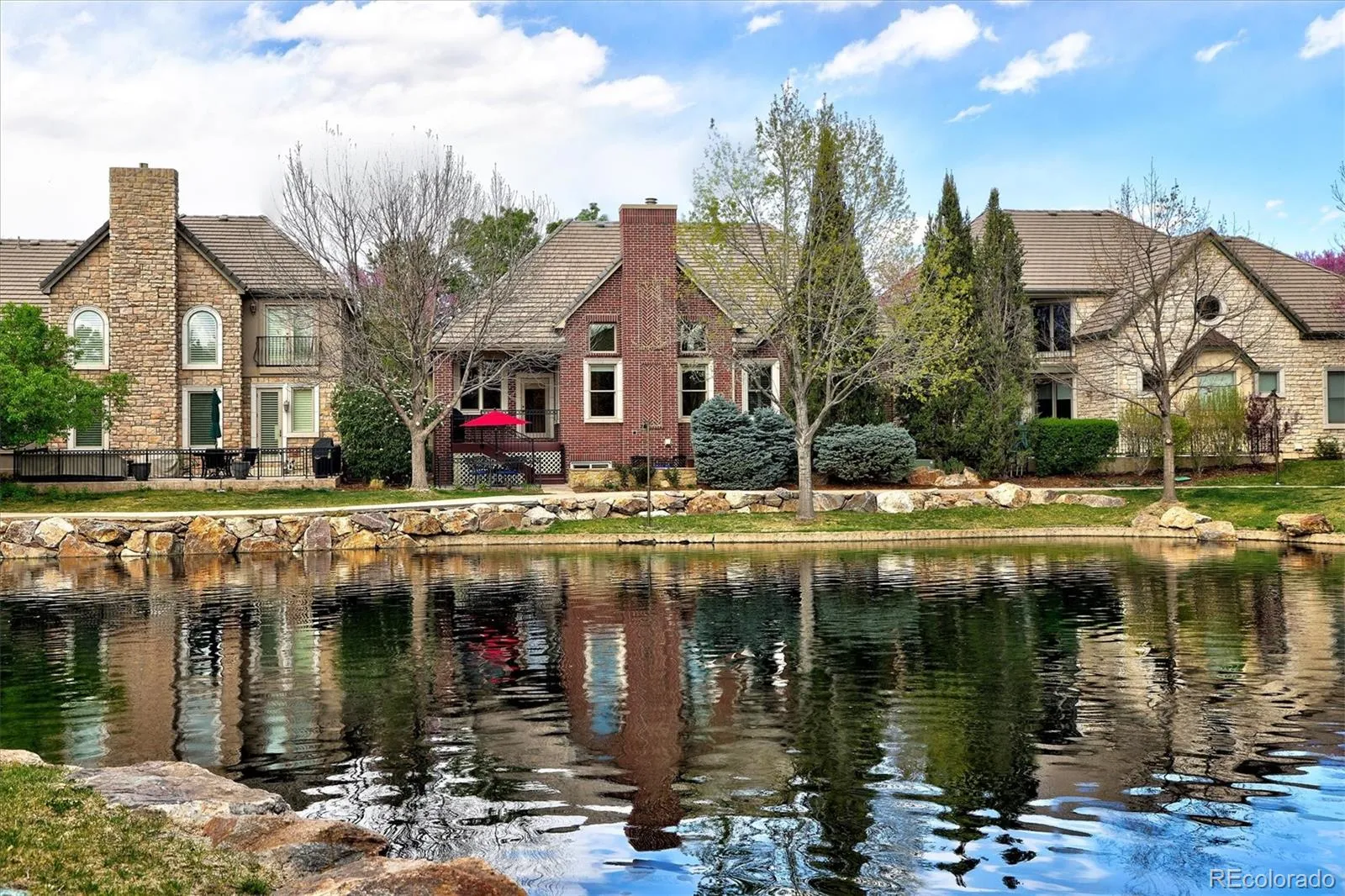 Fabulous ranch-style home backing to a serene, picturesque pond in the exclusive, gated Cherry Creek Country Club community. The heart of the home is a sun-drenched great room with dramatic vaulted ceilings, a statement cast-stone fireplace, and walls of windows that showcase tranquil pond views. The home features a striking stacked-stone accent wall, complemented by fresh interior paint and new carpet throughout the main living level, offering a crisp, move-in ready feel. The highly desirable main-floor primary suite provides a private retreat, combining comfort and sophistication with effortless main-level living. Designed for both everyday living and entertaining, the open kitchen features abundant custom cabinetry, a spacious center island with seating, a Thermador 5-burner gas cooktop, Wolf double ovens, and a Sub-Zero refrigerator. Main floor office/den bathed in natural light, creating a bright and inviting workspace. The beautifully finished lower level expands the living space with a bright family room, two spacious bedrooms with a Jack-and-Jill bath, and abundant storage—ideal for guests or extended living. Enjoy tranquil water views from your private outdoor space, creating a serene retreat just minutes from the heart of Denver. Enjoy life in a gated, resort-style community with the opportunity for membership to private Jack Nicklaus Signature golf course, clubhouse dining, fitness and spa amenities, and tennis courts.