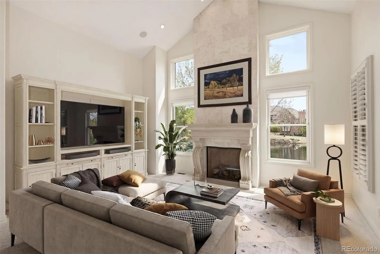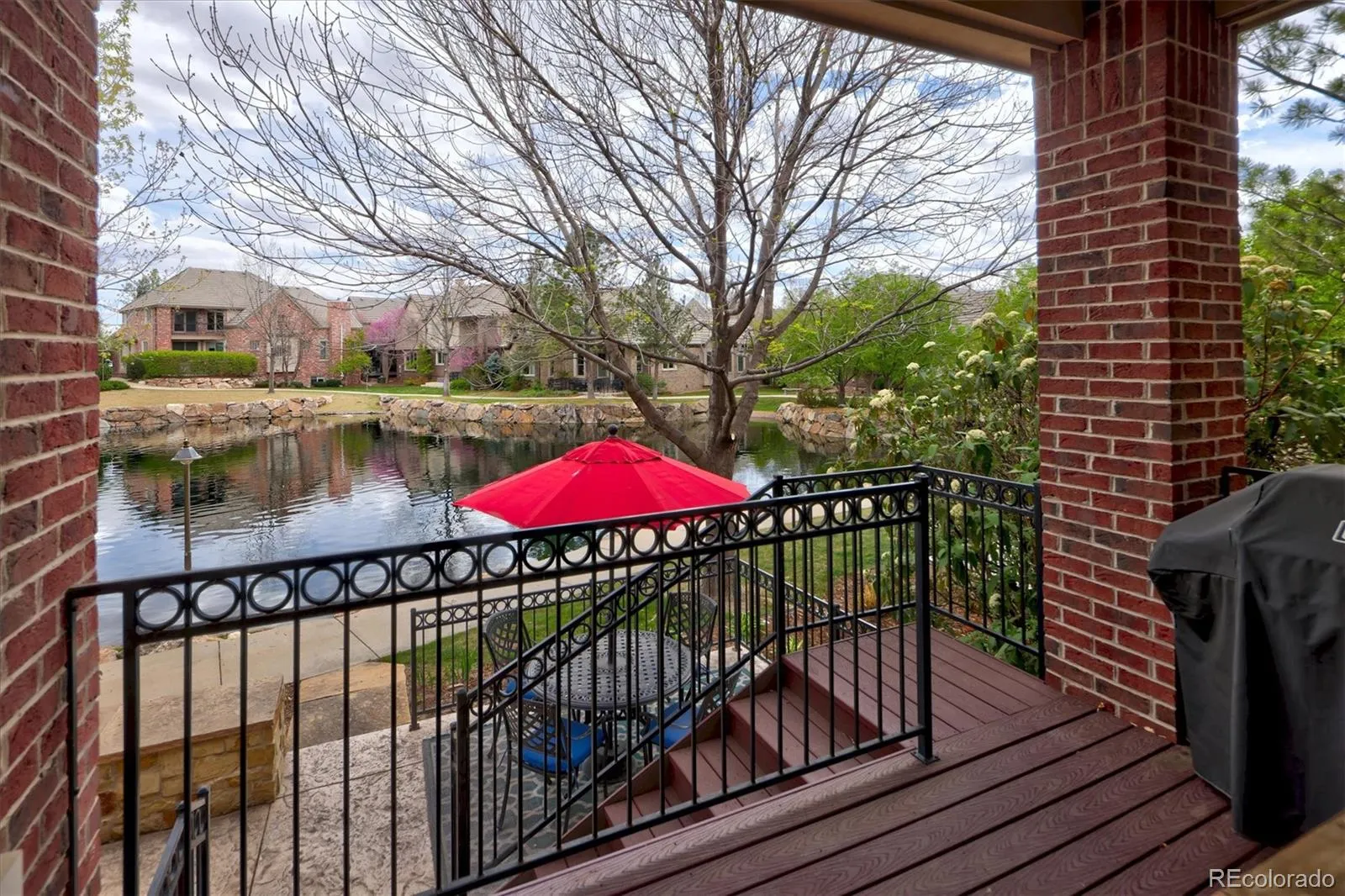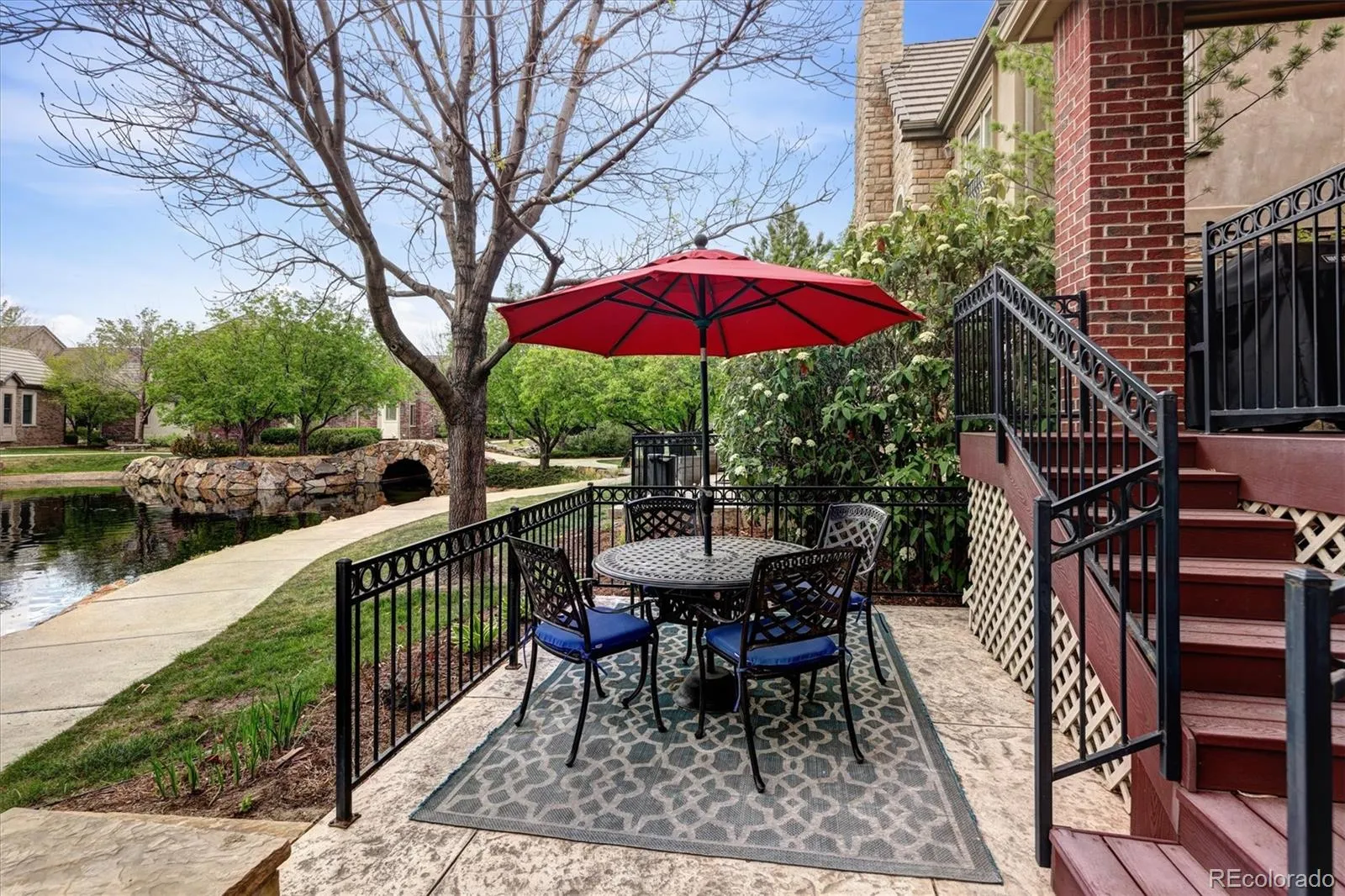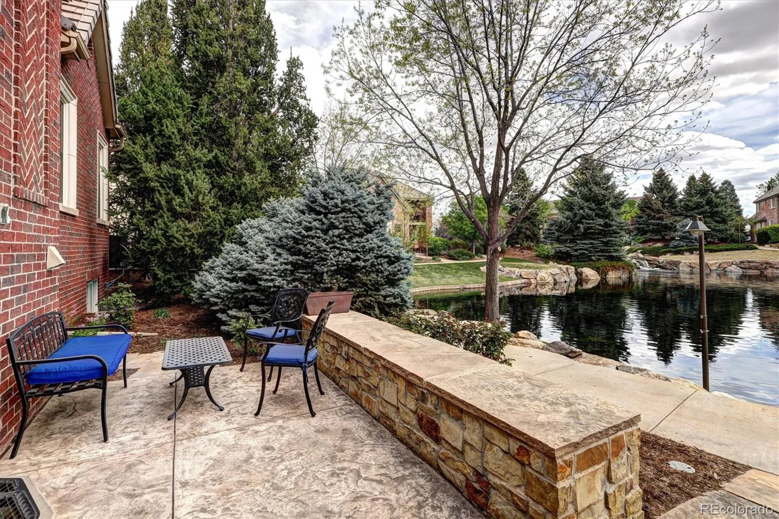 Fabulous ranch-style home backing to a serene, picturesque pond in the exclusive, gated Cherry Creek Country Club community. The heart of the home is a sun-drenched great room with dramatic vaulted ceilings, a statement cast-stone fireplace, and walls of windows that showcase tranquil pond views. The home features a striking stacked-stone accent wall, complemented by fresh interior paint and new carpet throughout the main living level, offering a crisp, move-in ready feel. The highly desirable main-floor primary suite provides a private retreat, combining comfort and sophistication with effortless main-level living. Designed for both everyday living and entertaining, the open kitchen features abundant custom cabinetry, a spacious center island with seating, a Thermador 5-burner gas cooktop, Wolf double ovens, and a Sub-Zero refrigerator. Main floor office/den bathed in natural light, creating a bright and inviting workspace. The beautifully finished lower level expands the living space with a bright family room, two spacious bedrooms with a Jack-and-Jill bath, and abundant storage—ideal for guests or extended living. Enjoy tranquil water views from your private outdoor space, creating a serene retreat just minutes from the heart of Denver. Enjoy life in a gated, resort-style community with the opportunity for membership to private Jack Nicklaus Signature golf course, clubhouse dining, fitness and spa amenities, and tennis courts.
