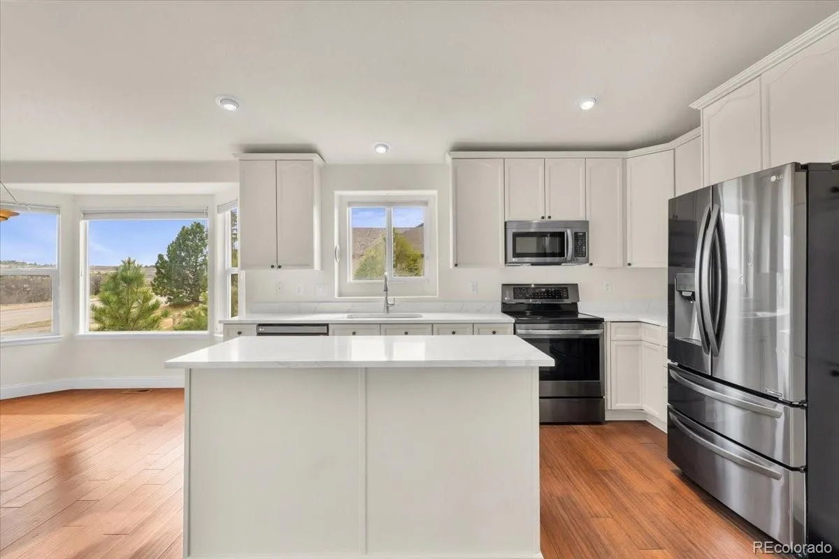 Inside, you are welcomed by a bright and airy floor plan with vaulted ceilings and expansive windows that fill the home with natural light. The renovated kitchen features quartz countertops, stainless steel appliances, a large center island, modern cabinetry, and a breakfast nook with scenic views. The open concept layout flows into multiple living and dining areas, perfect for entertaining or everyday living.