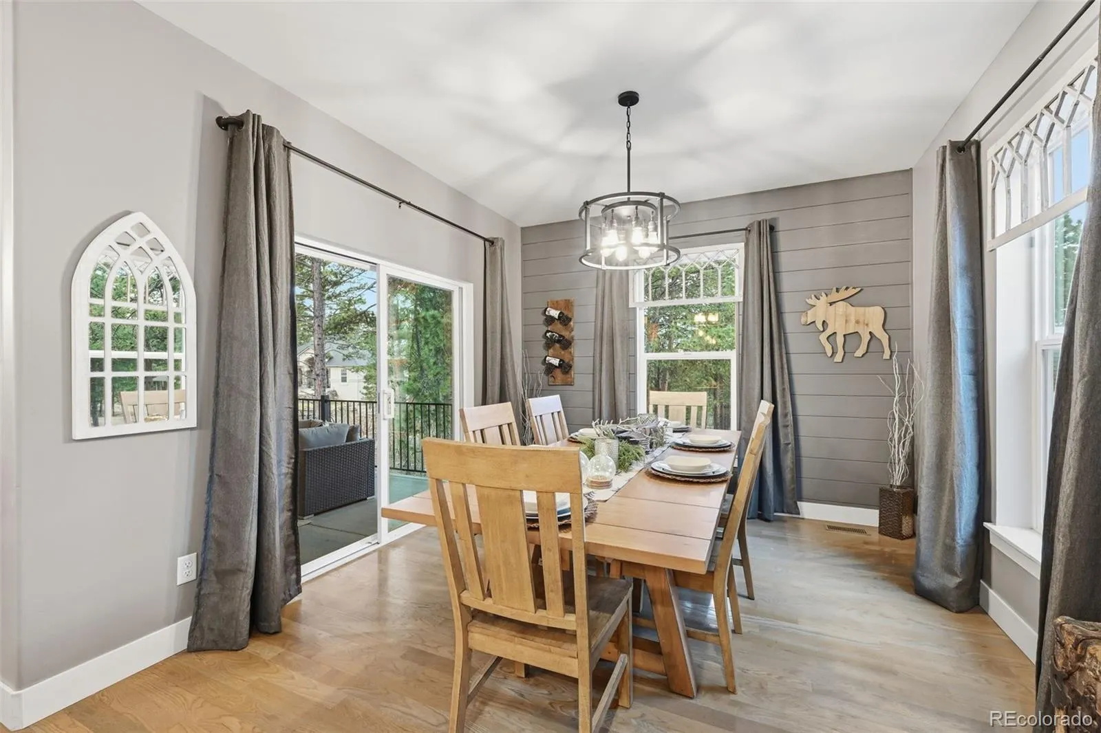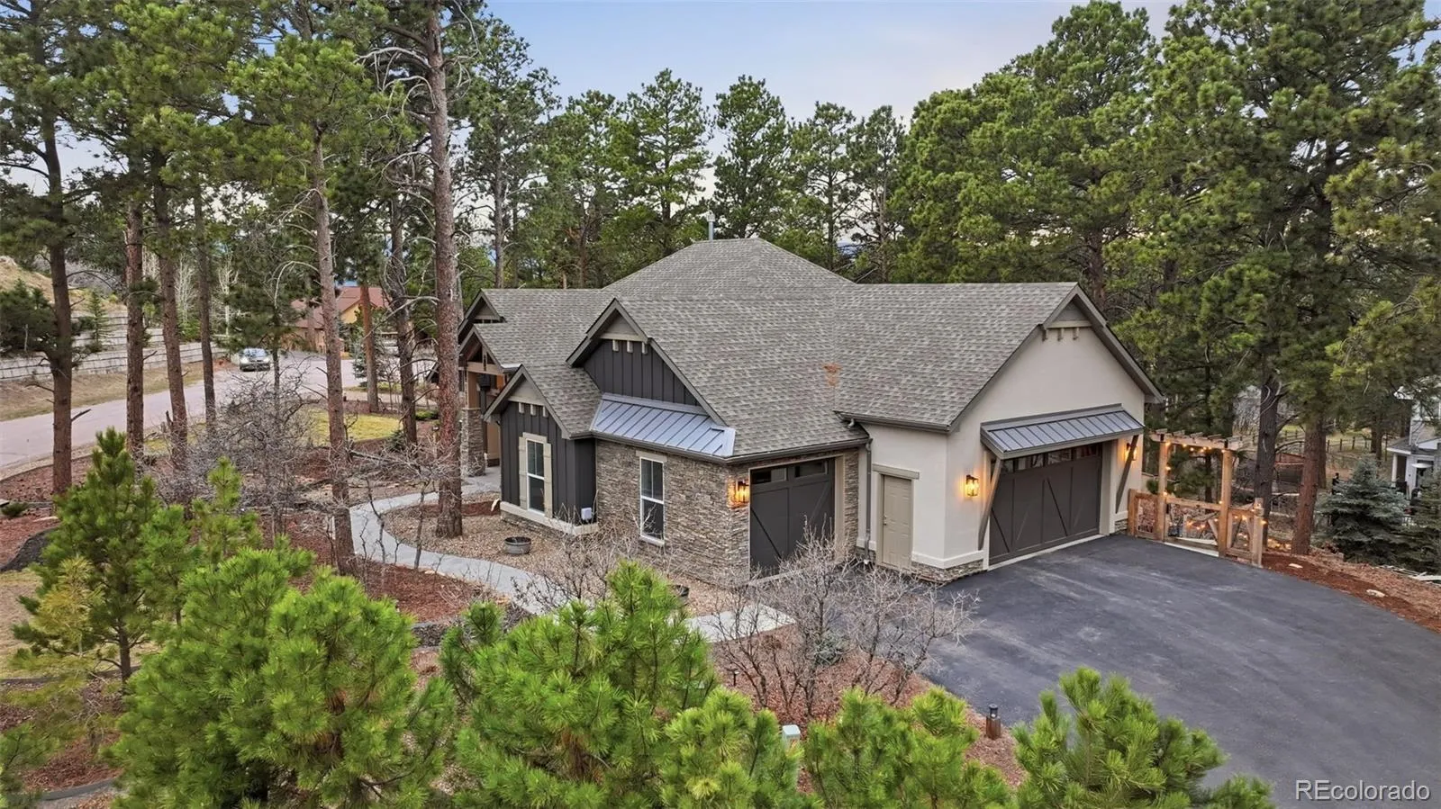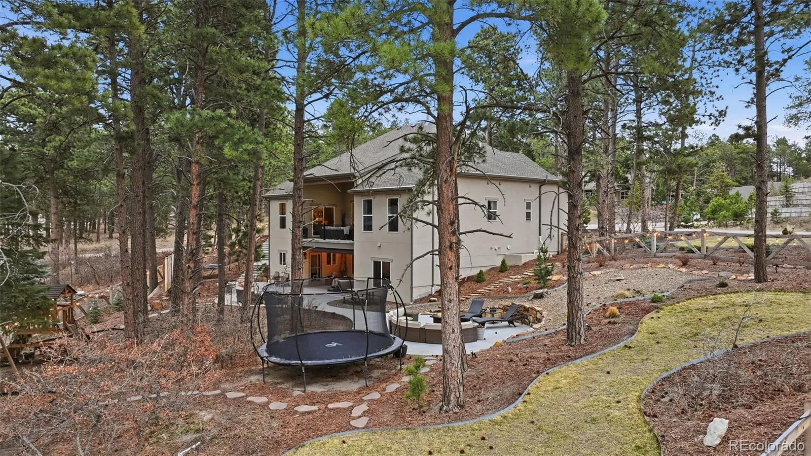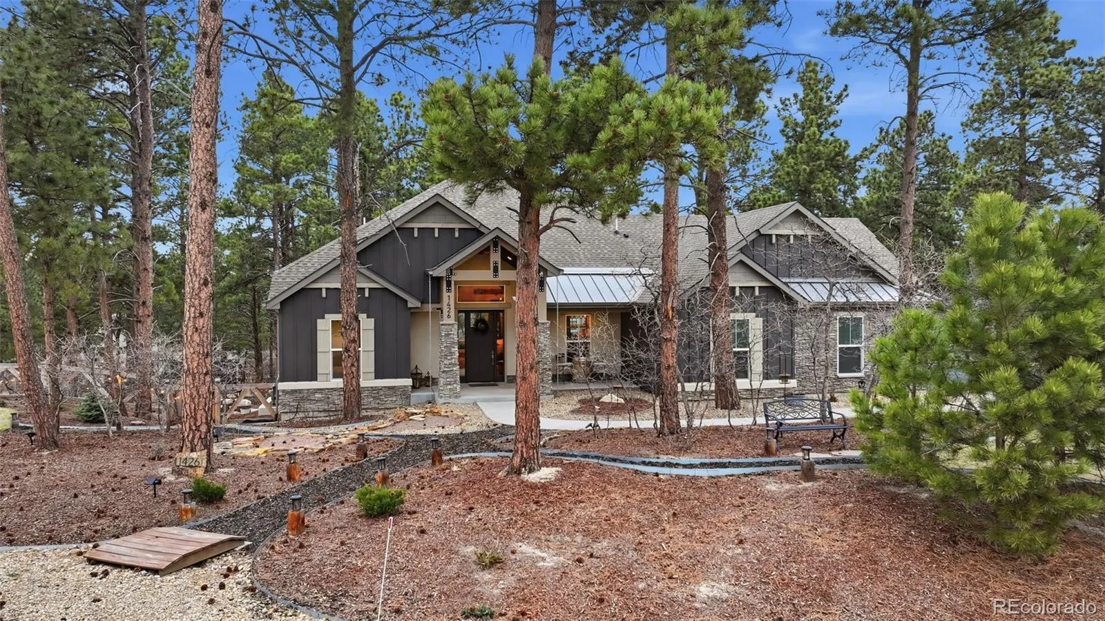 Tucked beneath a serene canopy of Ponderosa Pines in the Woodmoor community, this beautifully crafted 6-year-old custom home sits on a premium corner lot in the desirable Chisholm neighborhood. Designed with both comfort and style in mind, the main level features soaring 14-ft ceilings and elegant, large windows, gray-toned hickory flooring, creating a bright, open, and inviting atmosphere throughout. The great room embodies mountain-chalet charm with its beamed ceilings, built-in shelving, and a striking granite-surround gas fireplace. The gourmet kitchen is equally impressive, offering 42-inch custom alder cabinetry, sleek quartz countertops, a spacious island with seating, stainless-steel appliances, and a walk-in pantry. The main-level owners suite serves as a private retreat, complete with its own electric fireplace, direct access to the upgraded, concrete deck walk-out from the main living space – plumbed for gas, and a spa-like ensuite featuring a soaking tub, walk-in double-head shower, dual vanities, and walk-in closet. An additional bedroom and full bath round out the main floor. Perfect for entertaining or multi-generational living, the walk-out basement features 10-foot ceilings and includes a large rec room with an electric fireplace, wet bar, powder room, junior suite with private bath, bonus space ideal for a gym or office, and a guest suite with kitchenette and separate entrance. Three bedrooms include en-suite bathrooms. Set on a fully usable half-acre lot, the property boasts beautifully landscaped grounds that create a peaceful, park-like setting. The fully fenced backyard includes two gates, a secondary driveway, and a new playset. With over 1,200 SF of patio space and a charming covered front porch, outdoor living is just as inviting as the interior. Additional highlights include an oversized 3-car garage 1,046 SF, gutter helmet, concrete upper deck, and recently serviced roof, windows, and systems ensuring this home is truly move-in ready.