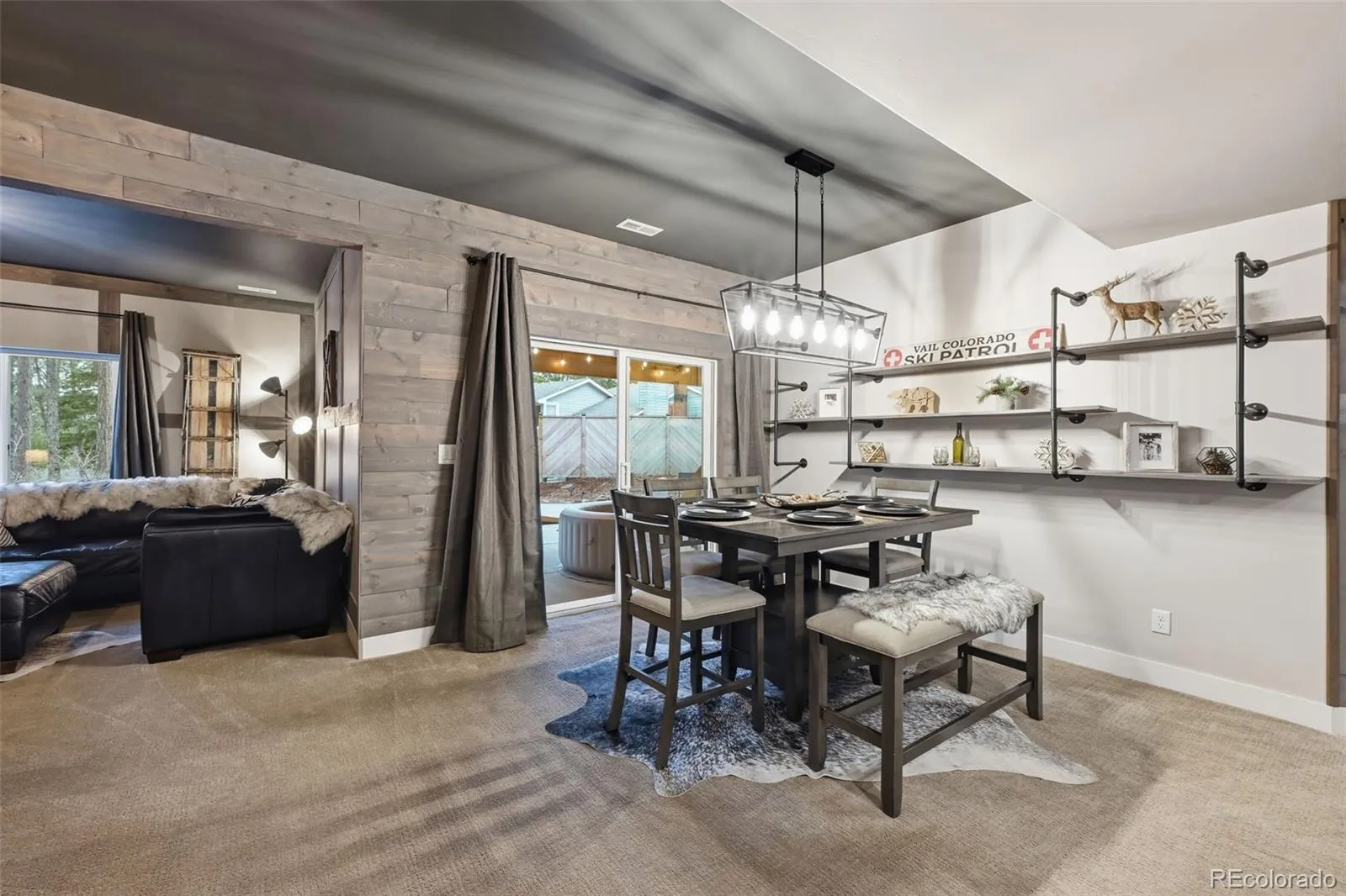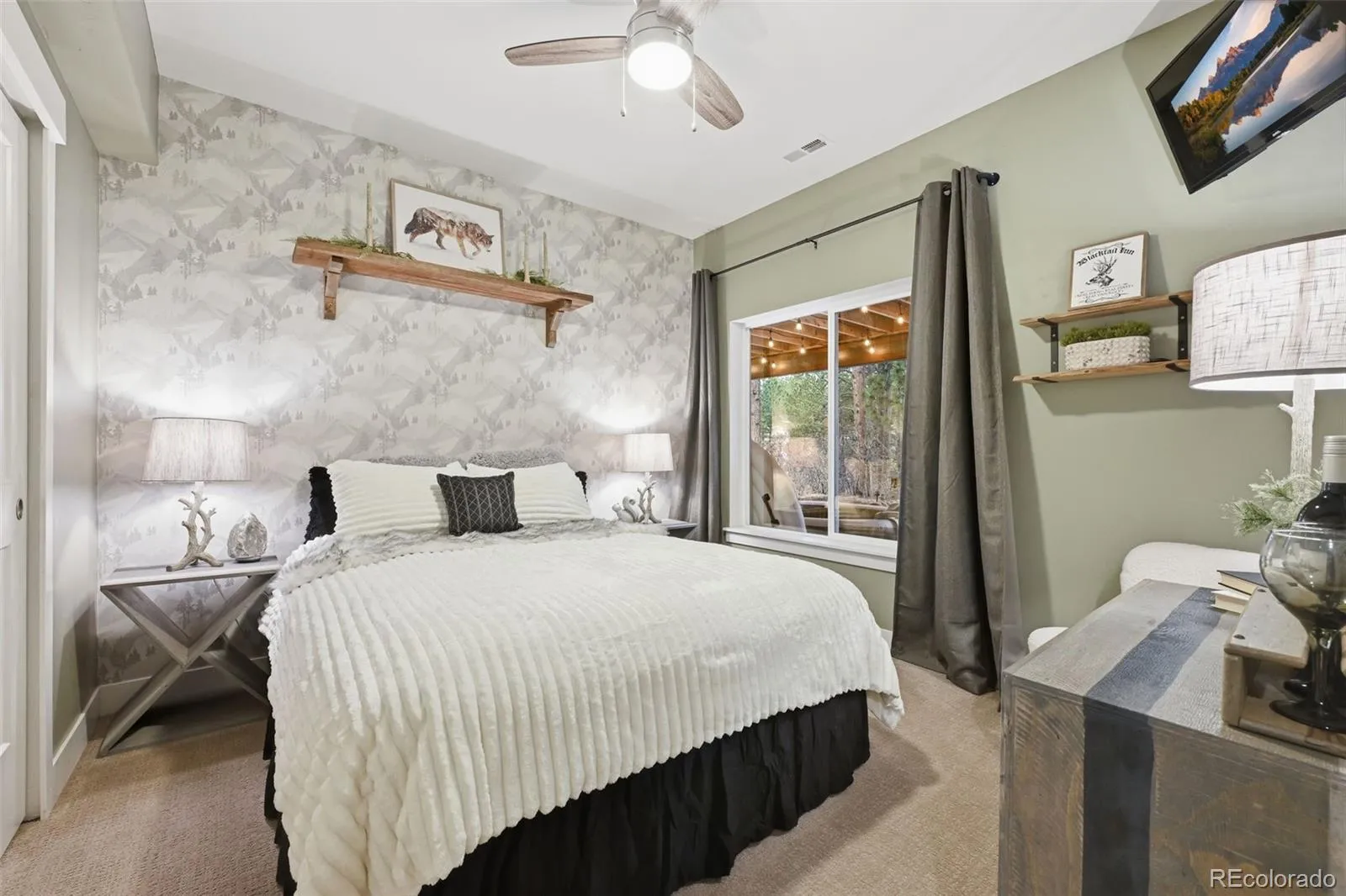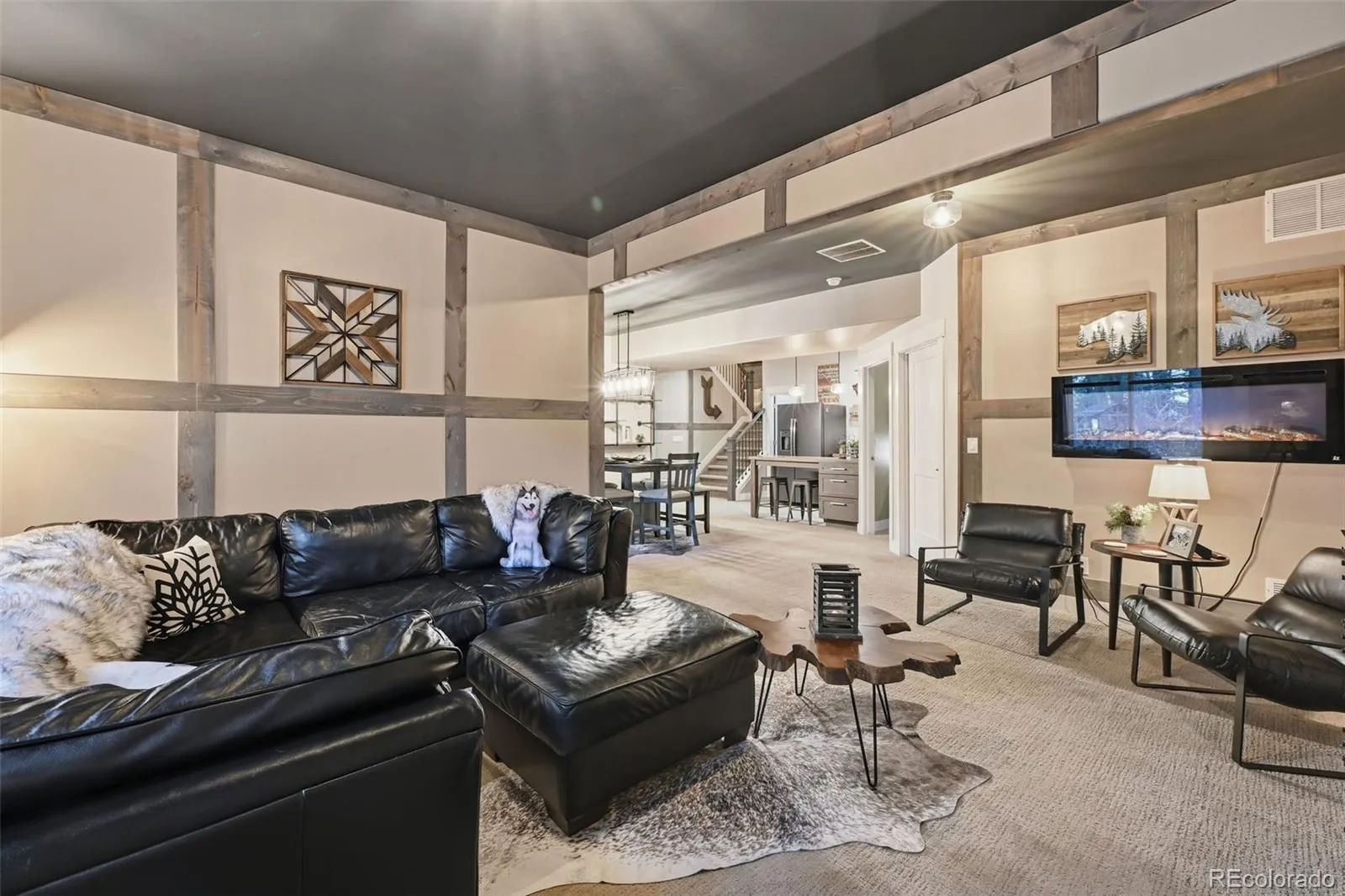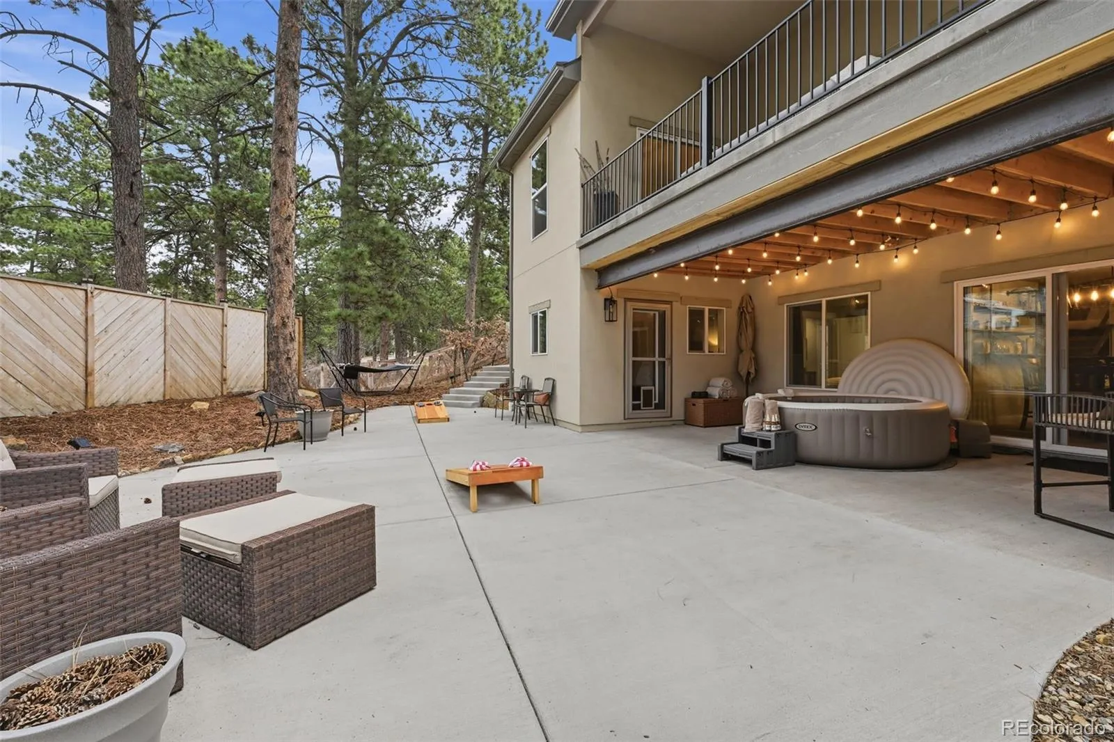 Tucked beneath a serene canopy of Ponderosa Pines in the Woodmoor community, this beautifully crafted 6-year-old custom home sits on a premium corner lot in the desirable Chisholm neighborhood. Designed with both comfort and style in mind, the main level features soaring 14-ft ceilings and elegant, large windows, gray-toned hickory flooring, creating a bright, open, and inviting atmosphere throughout. The great room embodies mountain-chalet charm with its beamed ceilings, built-in shelving, and a striking granite-surround gas fireplace. The gourmet kitchen is equally impressive, offering 42-inch custom alder cabinetry, sleek quartz countertops, a spacious island with seating, stainless-steel appliances, and a walk-in pantry. The main-level owners suite serves as a private retreat, complete with its own electric fireplace, direct access to the upgraded, concrete deck walk-out from the main living space – plumbed for gas, and a spa-like ensuite featuring a soaking tub, walk-in double-head shower, dual vanities, and walk-in closet. An additional bedroom and full bath round out the main floor. Perfect for entertaining or multi-generational living, the walk-out basement features 10-foot ceilings and includes a large rec room with an electric fireplace, wet bar, powder room, junior suite with private bath, bonus space ideal for a gym or office, and a guest suite with kitchenette and separate entrance. Three bedrooms include en-suite bathrooms. Set on a fully usable half-acre lot, the property boasts beautifully landscaped grounds that create a peaceful, park-like setting. The fully fenced backyard includes two gates, a secondary driveway, and a new playset. With over 1,200 SF of patio space and a charming covered front porch, outdoor living is just as inviting as the interior. Additional highlights include an oversized 3-car garage 1,046 SF, gutter helmet, concrete upper deck, and recently serviced roof, windows, and systems ensuring this home is truly move-in ready.
