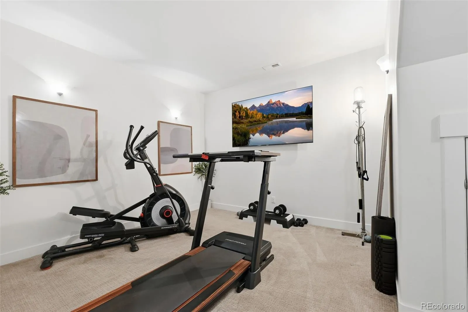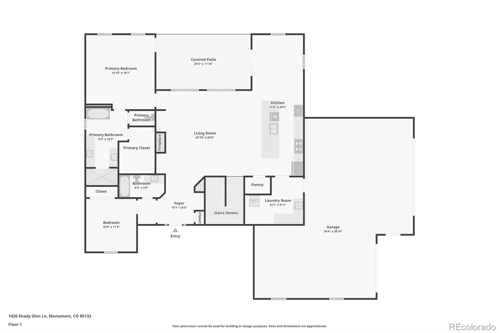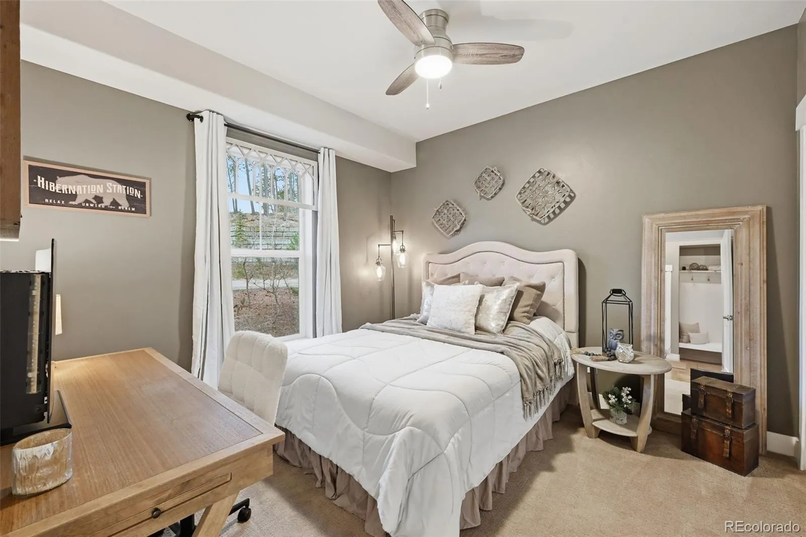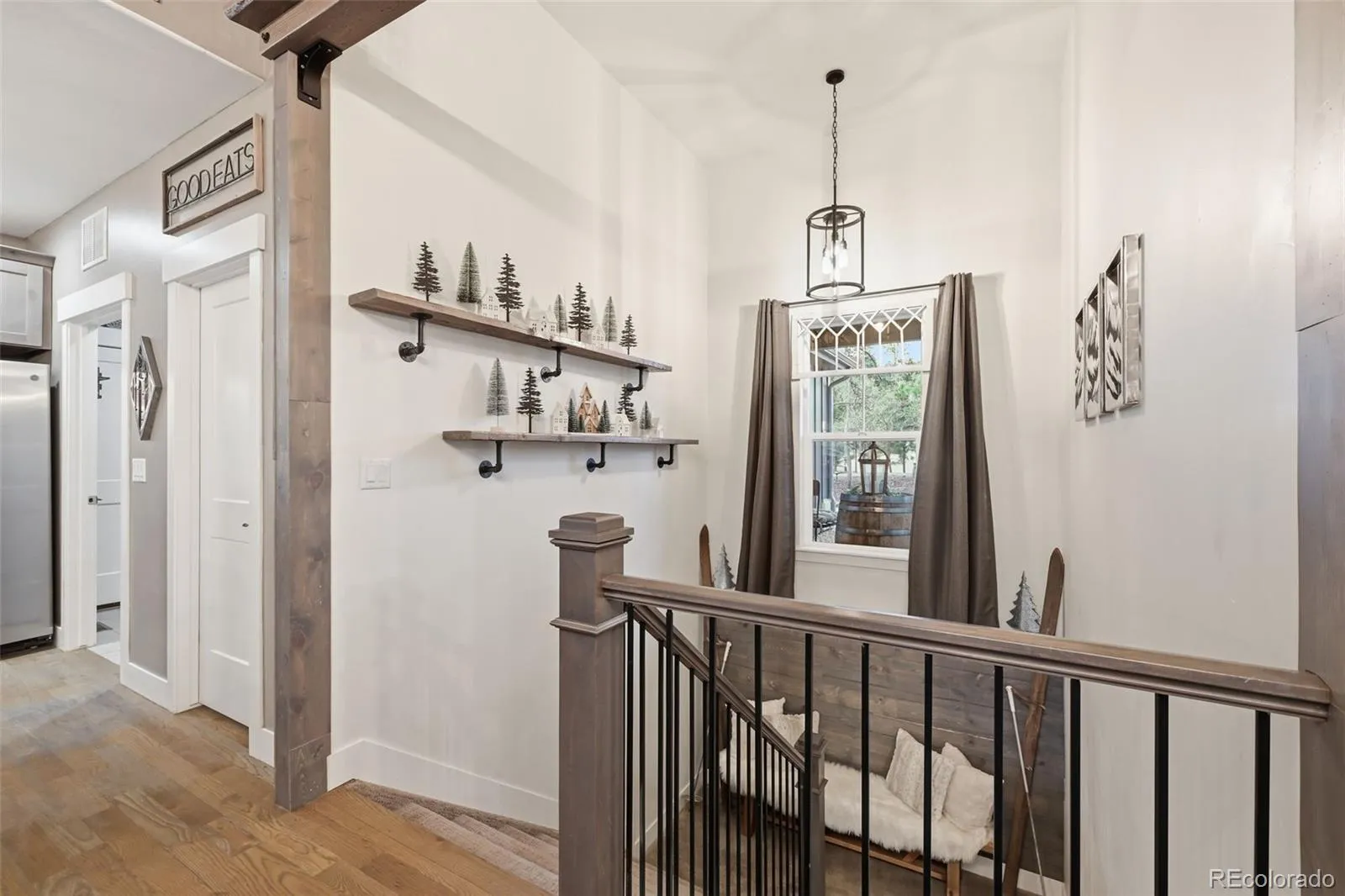 Tucked beneath a serene canopy of Ponderosa Pines in the Woodmoor community, this beautifully crafted 6-year-old custom home sits on a premium corner lot in the desirable Chisholm neighborhood. Designed with both comfort and style in mind, the main level features soaring 14-ft ceilings and elegant, large windows, gray-toned hickory flooring, creating a bright, open, and inviting atmosphere throughout. The great room embodies mountain-chalet charm with its beamed ceilings, built-in shelving, and a striking granite-surround gas fireplace. The gourmet kitchen is equally impressive, offering 42-inch custom alder cabinetry, sleek quartz countertops, a spacious island with seating, stainless-steel appliances, and a walk-in pantry. The main-level owners suite serves as a private retreat, complete with its own electric fireplace, direct access to the upgraded, concrete deck walk-out from the main living space – plumbed for gas, and a spa-like ensuite featuring a soaking tub, walk-in double-head shower, dual vanities, and walk-in closet. An additional bedroom and full bath round out the main floor. Perfect for entertaining or multi-generational living, the walk-out basement features 10-foot ceilings and includes a large rec room with an electric fireplace, wet bar, powder room, junior suite with private bath, bonus space ideal for a gym or office, and a guest suite with kitchenette and separate entrance. Three bedrooms include en-suite bathrooms. Set on a fully usable half-acre lot, the property boasts beautifully landscaped grounds that create a peaceful, park-like setting. The fully fenced backyard includes two gates, a secondary driveway, and a new playset. With over 1,200 SF of patio space and a charming covered front porch, outdoor living is just as inviting as the interior. Additional highlights include an oversized 3-car garage 1,046 SF, gutter helmet, concrete upper deck, and recently serviced roof, windows, and systems ensuring this home is truly move-in ready.