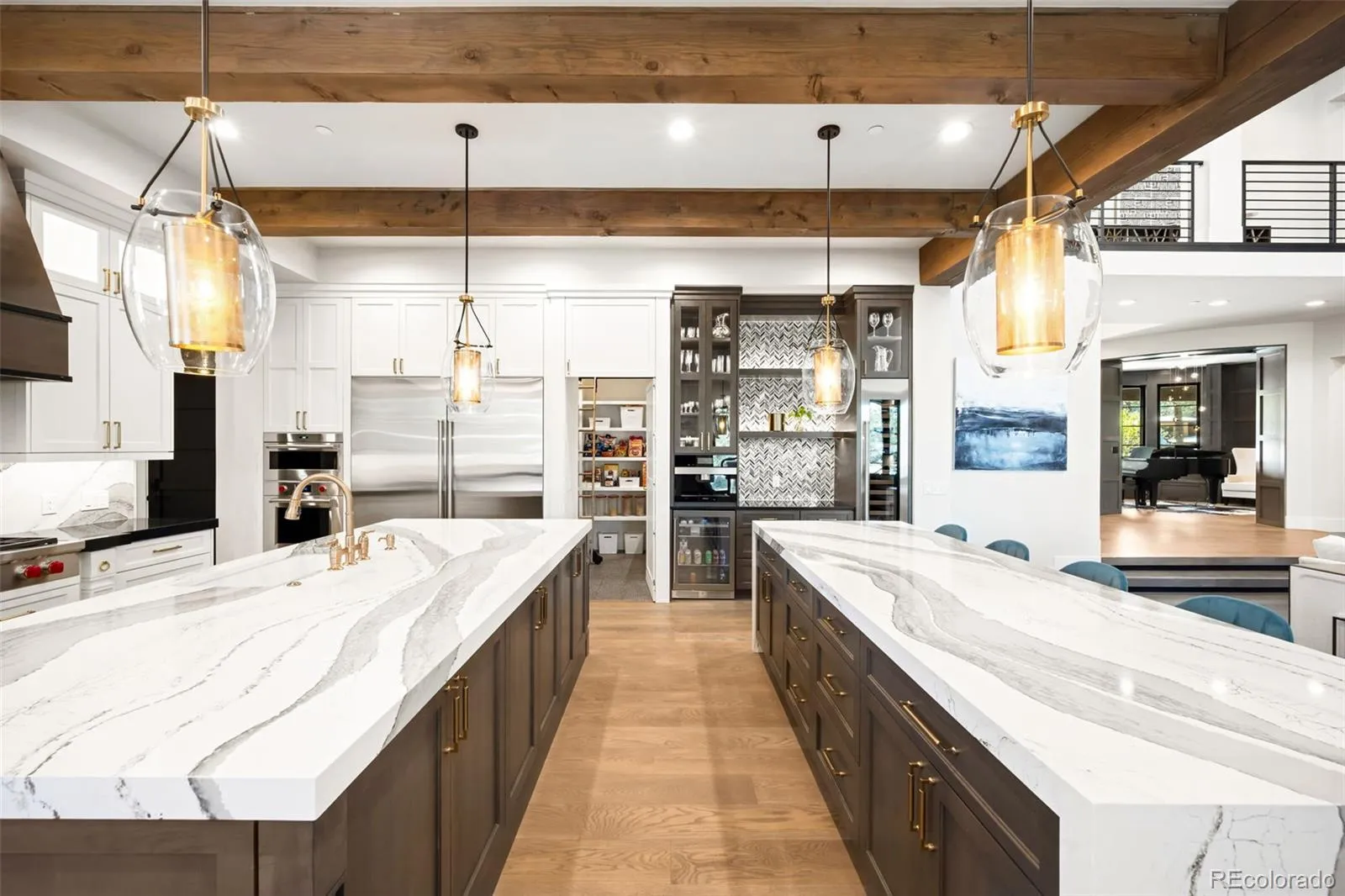 At the heart of the home lies a showstopping luxury kitchen designed to impress. Featuring dual oversized islands, the space offers abundant seating areas, perfect for hosting on any scale. Outfitted with top-of-the-line appliances, and exquisite stone surfaces, the kitchen is complemented by a spacious walk-in pantry that ensures effortless storage.