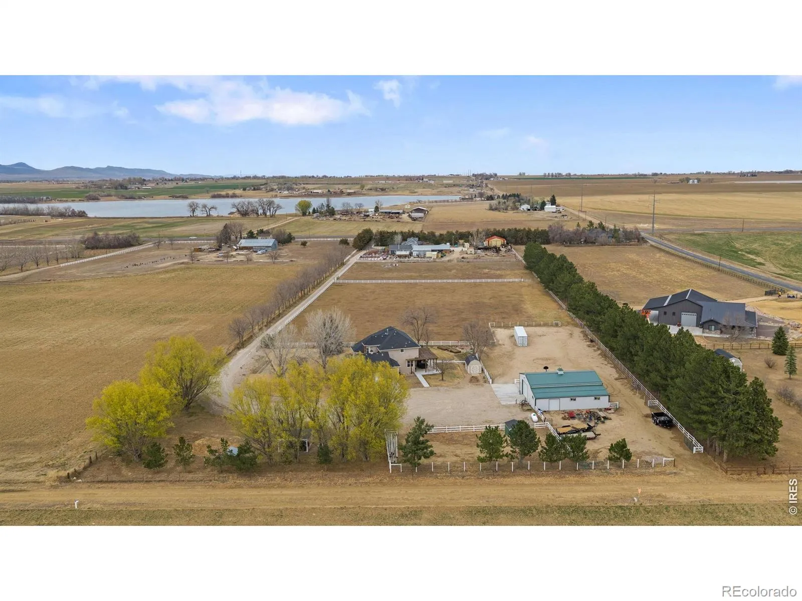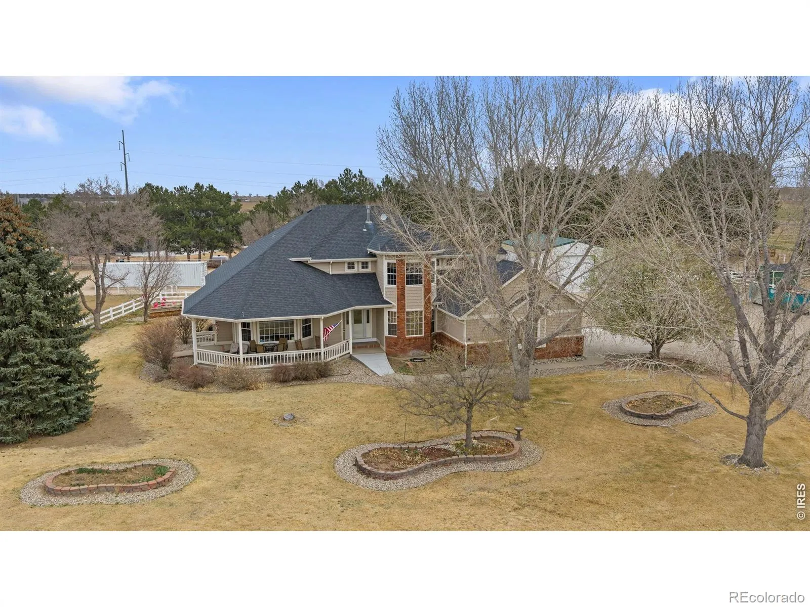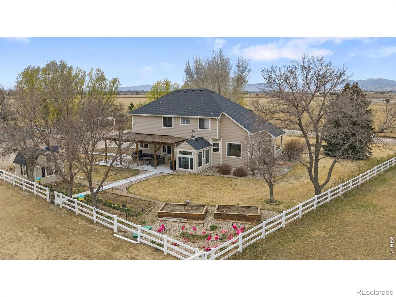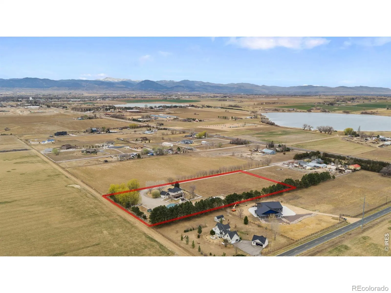 Spectacular estate set on nearly 5 acres, showcasing breathtaking, unobstructed views of Longs Peak and the Front Range. Privately tucked away in a serene setting, yet just minutes from downtown Berthoud and I-25, this property offers an exceptional blend of seclusion and convenience.Inside, refined finishes and thoughtful upgrades throughtout, featuring rich wood flooring and a beautifully renovated kitchen with custom cabinetry, granite countertops, double ovens, an induction cooktop, and soft-close cabinetry. The upper level offers two spacious bedrooms, upstairs laundry/craft room (or 3rd bedroom), including a stunning primary retreat with a fully updated, spa-inspired bathroom.The fully finished basement is designed for both relaxation and entertaining, complete with an expansive game room, wet bar, media room, and a private guest suite. Outdoors, the property continues to impress with 68 ft wide x 46 ft. deep detached shop 10’8″ tall x 14’6″ wide overhead door ideal for storage, barn or a dedicated workspace. The fully fenced grounds are perfectly suited for equestrian living, featuring a working horse arena and a 2-acre grazing pasture, all set against a truly picturesque Colorado backdrop.Sale includes 1 share McIntrye Lateral Ditch-irrigation water rights.