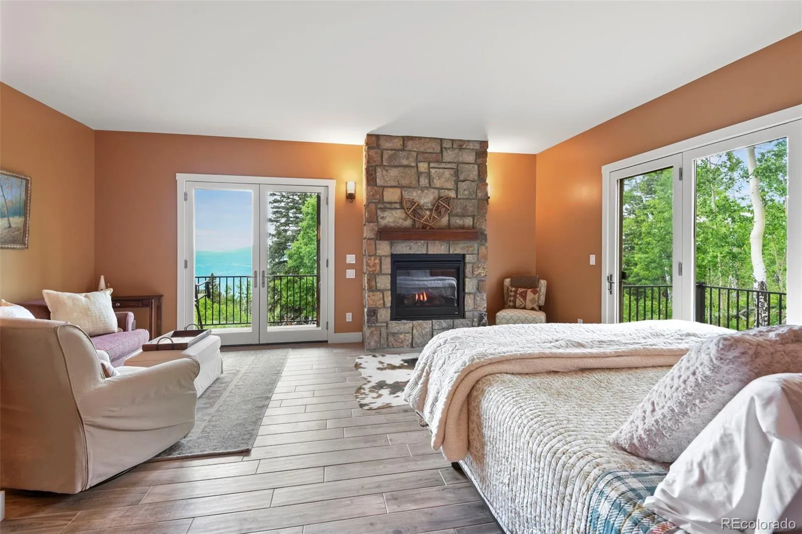 Upstairs, the primary retreat offers a true sense of escape, featuring a five-piece bath with heated tile floors, a freestanding soaking tub, and an oversized shower. A third stone-accented fireplace, private sitting area, and an elevated deck with breathtaking views complete the suite.